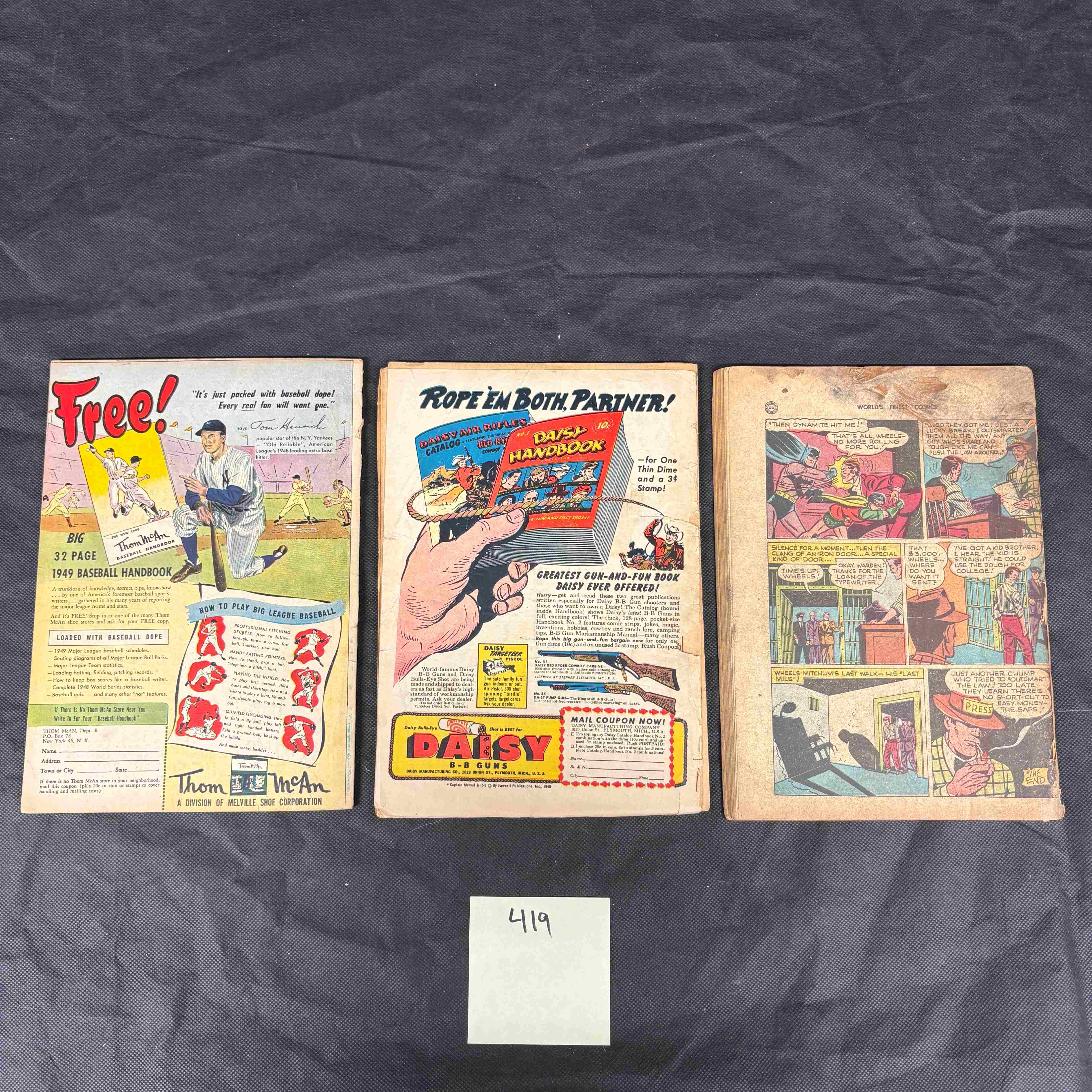 This lot comprises three vintage American comic books from DC Comics, featuring iconic characters Superman and Batman. Two complete issues of “World’s Finest Comics” are included: No. 39 (March-April, 15c) featuring Batman, Superman, and Robin on the cover, and No. 2 (10c) with Superman and Robin, incorporating a “1000 LBS” story element on the cover. The third item is an interior page from a Superman comic, titled “My Disguise is SUPERMAN!?”, featuring the hero. The reverse sides of the items feature period advertisements, including a “1949 Baseball Handbook” from Thom McAn and a “Daisy BB Handbook,” with the third showing panels from a Western-themed comic. Constructed from printed paper in a classic comic book art style. A small white slip bearing the number “419” is visible beneath the items.