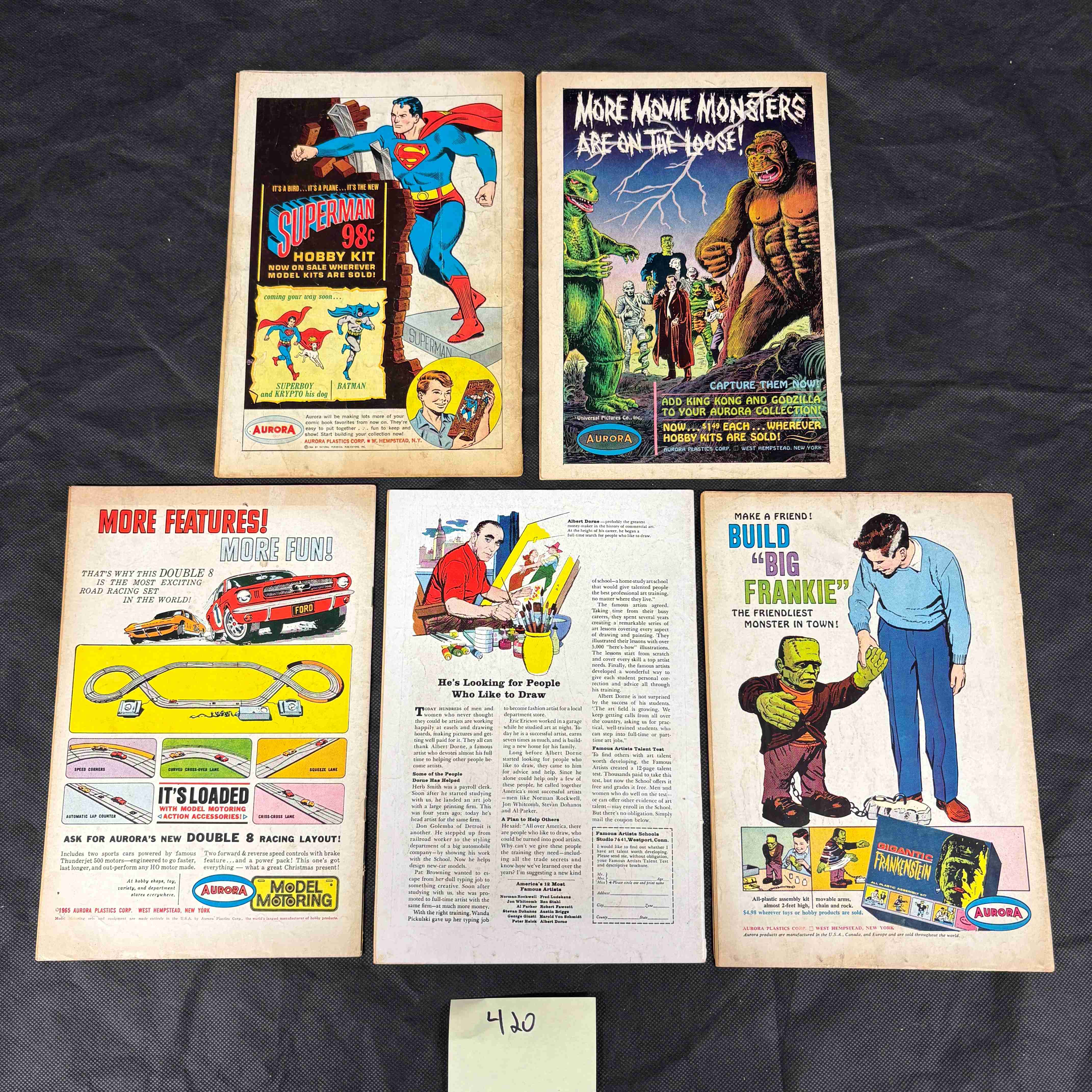 A group of five Silver Age DC Comics World’s Finest Comics (1941-). Each comic features Superman, Batman, and Robin prominently on its cover, rendered in a distinctive Silver Age art style. All covers display a price of ’12c’ and depict dynamic action scenes with various issue-specific titles such as ‘Batman – Son of Superman!’, ‘Superman’s Prison Peril!’, ‘The Super-Gamblers!’, and ‘Superman’s Doomed Heroes!’. The reverse sides of the comics feature diverse period advertisements for products including Aurora model kits (Superman, Movie Monsters, Big Frankie), Aurora Motoring road race sets, and Art Instruction Schools. A small piece of paper with the handwritten number ‘420’ is visible in the frame.