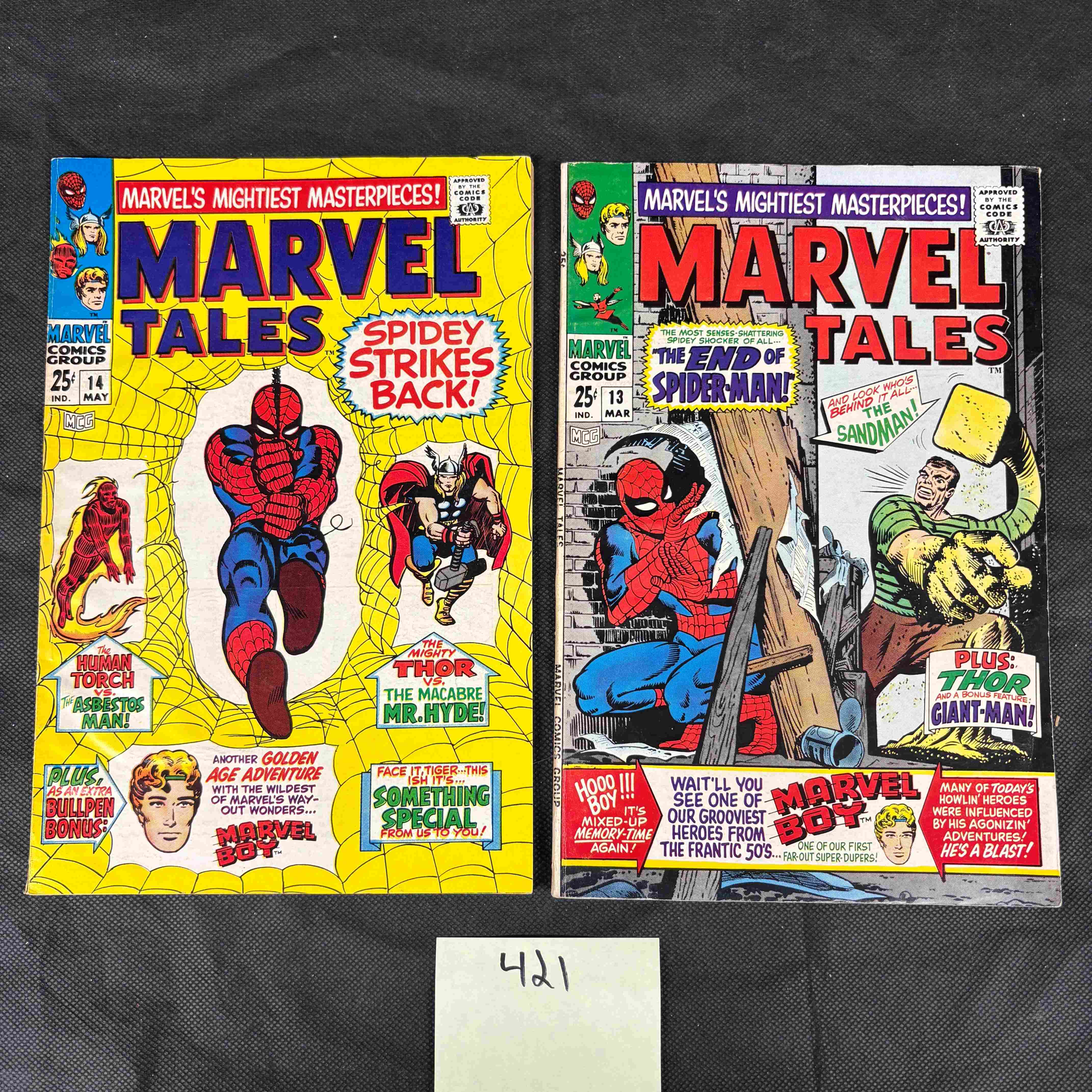 A pair of early 1970s Bronze Age comic books from the Marvel Comics Group, both part of the “Marvel Tales” series, printed on paper. The right comic is issue #13 (March, 25¢), prominently featuring Spider-Man, alongside Thor and Giant-Man on the cover, with text including “The End of Spider-Man!” and “Behind the Fall of Sandman!”. Its back cover displays an advertisement for “Famous Artists Schools” endorsed by Norman Rockwell. The left comic is issue #14 (May, 25¢), featuring Spider-Man, Human Torch, and Thor on the cover, with text announcing “Spidey Strikes Back!” and highlighting a “Golden Age Masterpiece!” within. Its back cover carries a “MAKE MONEY GET PRIZES with Fast Selling American Seeds” advertisement.