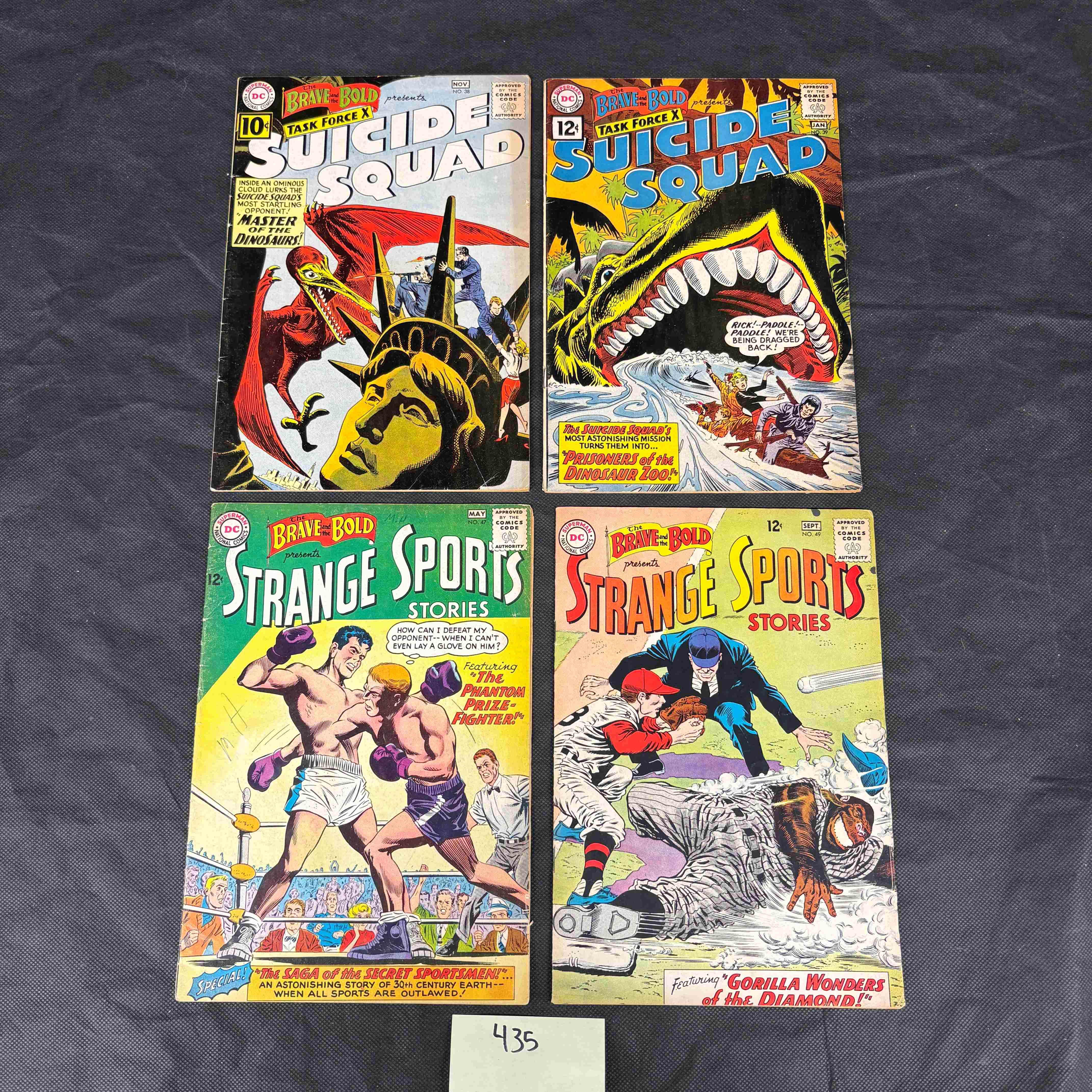A group of four vintage American comic books from the DC Comics series “The Brave and the Bold,” dating to the Silver Age. The lot includes “No. 76” (10¢) and “No. 77” (12¢), both featuring “TASK FORCE X SUICIDE SQUAD,” alongside “No. 65” (12¢) and “No. 62” (12¢), both presenting “STRANGE SPORTS STORIES.” Each comic bears the “Approved by the Comics Code Authority” seal. The covers display vibrant, action-oriented illustrations typical of the period. The back covers feature advertisements for products such as a Daisy BB gun, greeting cards, American Seeds, and “Kings & Knights” plastic toys. Constructed from printed paper.