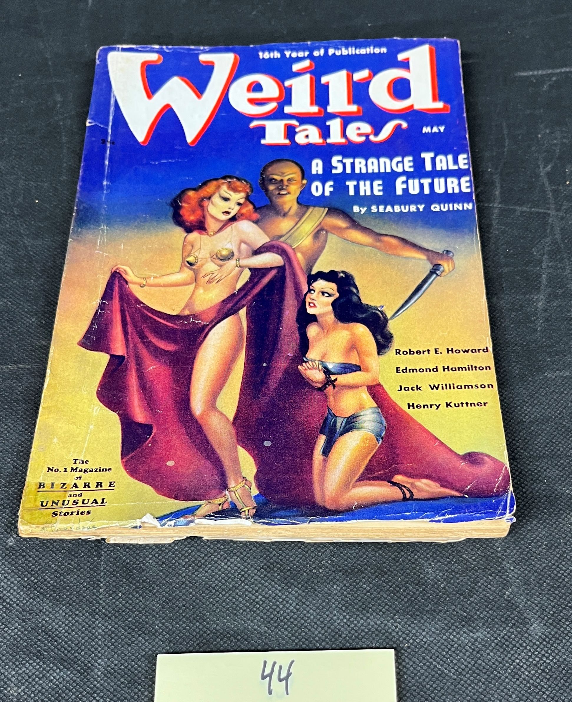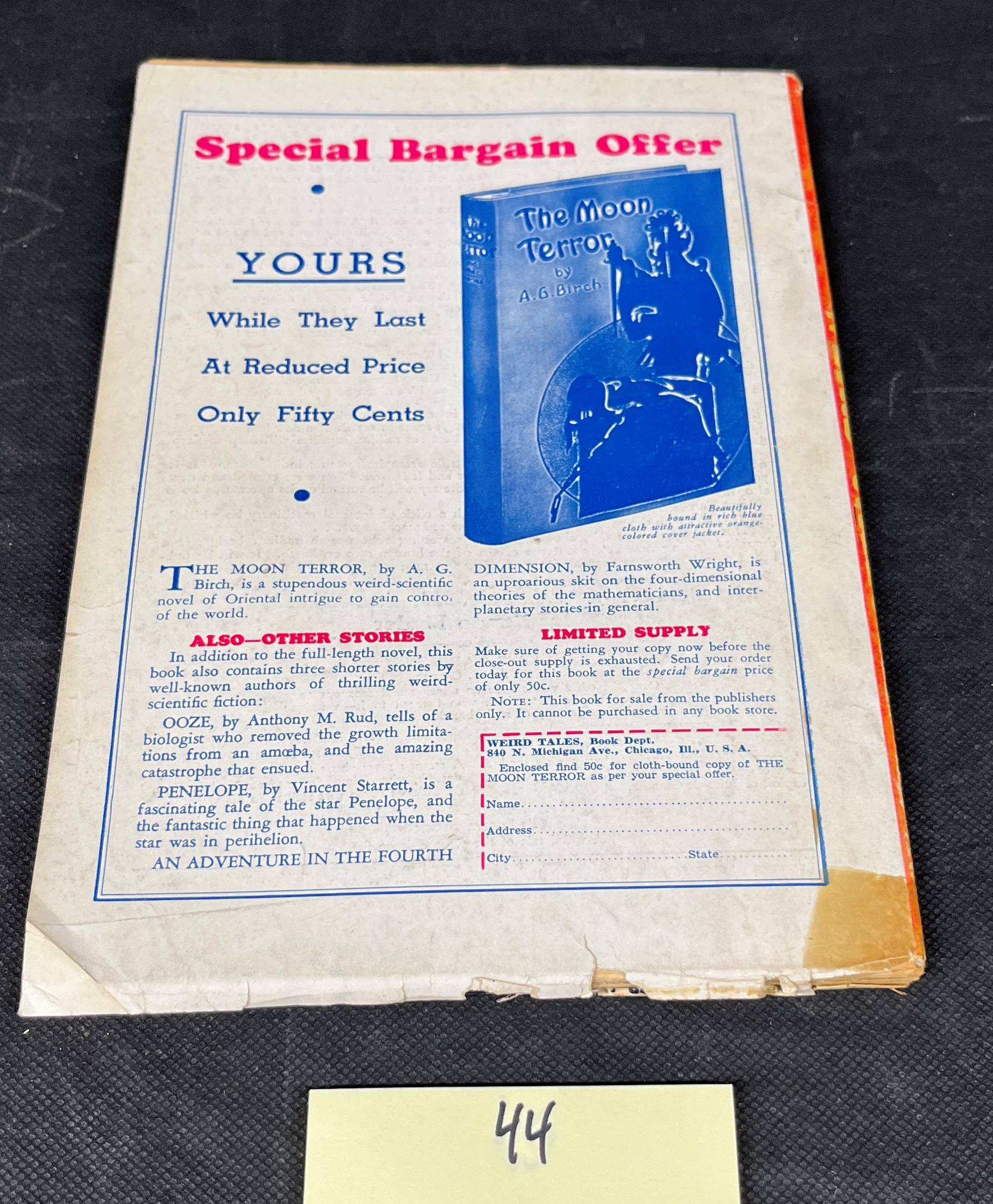 This vintage pulp magazine, identified as “Weird Tales,” is the May 1940 issue from its 18th Year of Publication. The vibrant, dramatic cover art features a bare-chested muscular man with a dagger, alongside a scantily clad woman draped in red fabric, and a kneeling, bound woman in a blue top and shorts, characteristic of early science fiction or fantasy genres. The cover promotes “A STRANGE TALE OF THE FUTURE BY SEABURY QUINN,” and lists other authors including Robert E. Howard, Edmond Hamilton, Jack Williamson, and Henry Kuttner. It is advertised as “The No. 1 magazine of BIZARRE and UNUSUAL Stories.” The reverse side is an advertisement for a book titled “The Moon Terror by A. G. Birch,” offered as a “Special Bargain Offer” for “Only Fifty Cents,” detailing other included stories and providing an order form from “WEIRD TALES, Book Dept., 9 Rockefeller Plaza, New York 20, N. Y., U. S. A.”