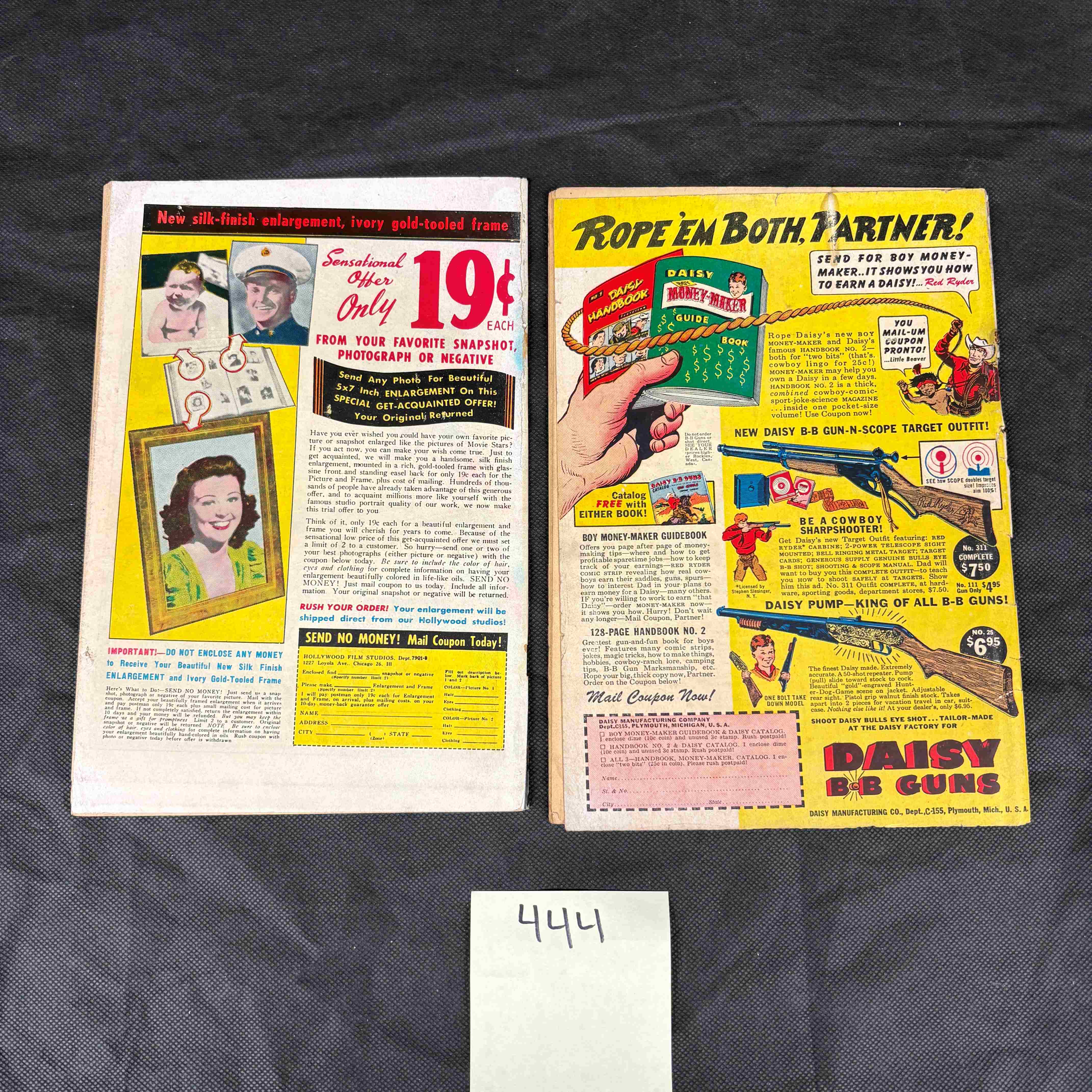A pair of DC Comics ‘Tomahawk’ issues, from the 1950 series, numbered 106 and 107. These mid-20th century American comic books are 52-page issues featuring “America’s Favorite Frontier Hero” and “BRAND-NEW ADVENTURES.” Issue #1 additionally mentions “THRILLING INDIAN STORIES” on its cover. The cover of issue #2 includes the blurb: “Can TOMAHAWK AND HIS YOUNG FRIEND DAN HUNTER ESCAPE ALMOST CERTAIN DEATH AT THE HANDS OF SAVAGE ENEMIES?” The reverse side of issue #1 features a period advertisement for “New silk-finish enlargement, ivory gold-toned frame” from “Hollywood Studios,” while issue #2reverse side advertises “DAISY B-B GUNS” and related accessories. The comics are paper-covered.