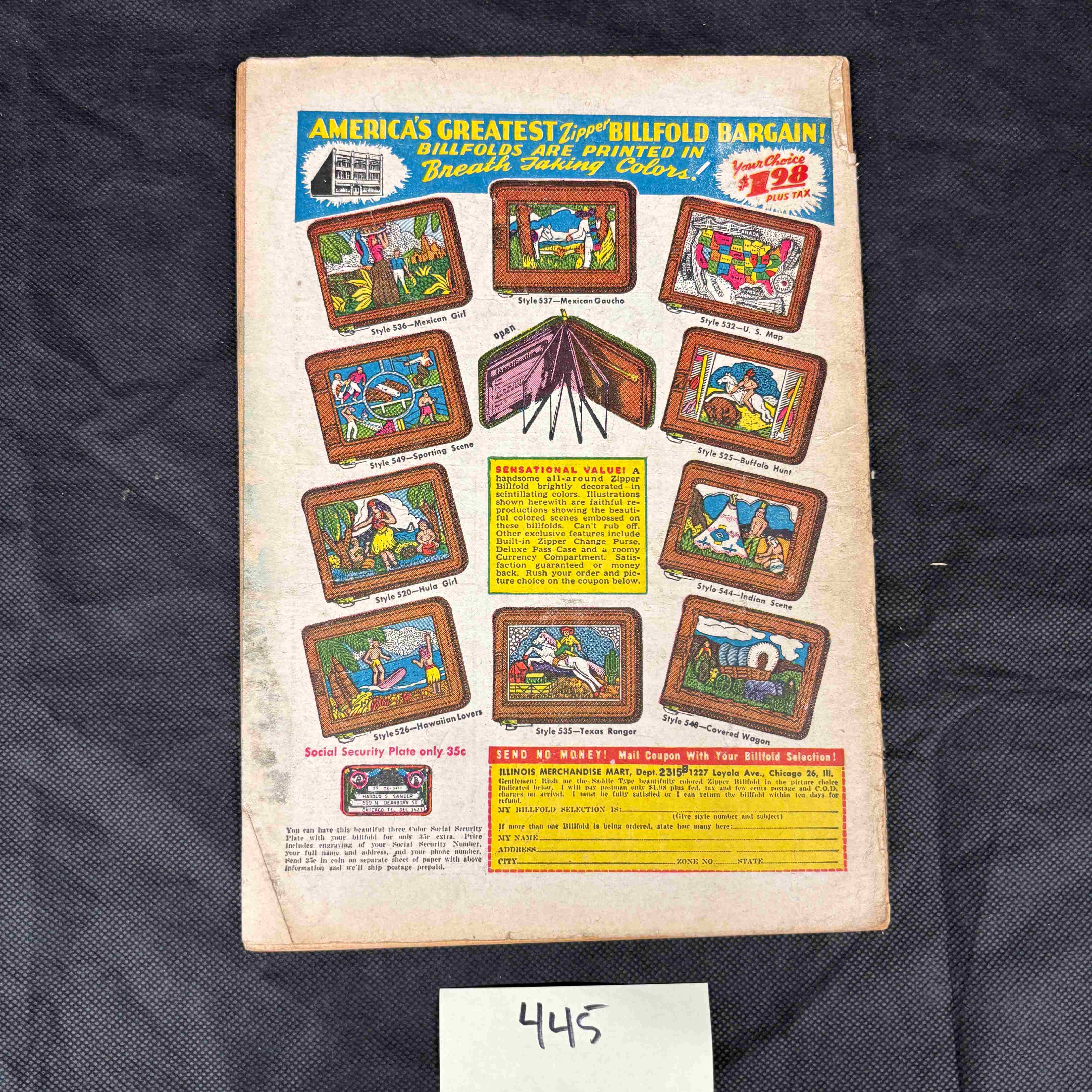 A vintage Golden Age comic book, Zoot Comics #13A, published by Fox Features Syndicate in February 1948. The front cover, priced at 10¢, features colorful artwork depicting Rulah, the scantily-clad jungle goddess, battling a snake and leopards against a fiery jungle backdrop. Prominently displayed text on the front includes ‘IN THIS ISSUE – RULAH, JUNGLE GODDESS IN STONE JUNGLE, BLOODY MOON AND PLUNDERING CULT.’ The reverse side features various period advertisements, notably for ‘AMERICA’S GREATEST Zipper BILLFOLD BARGAIN!’ priced at ‘$1.98 PLUS TAX,’ showcasing different billfold styles, and a ‘SOCIAL SECURITY Plate only 35c,’ alongside a mail-order coupon. Constructed from paper.
