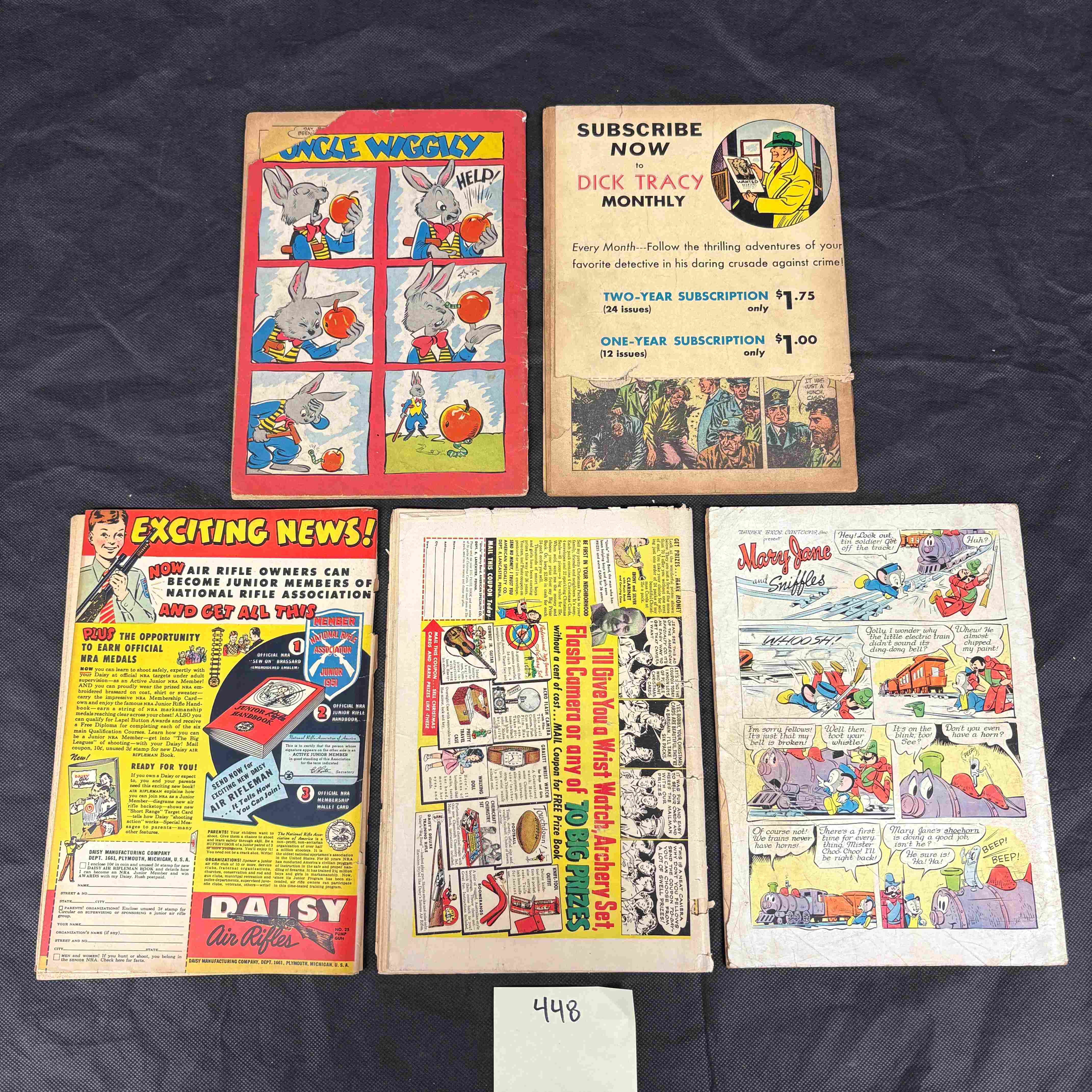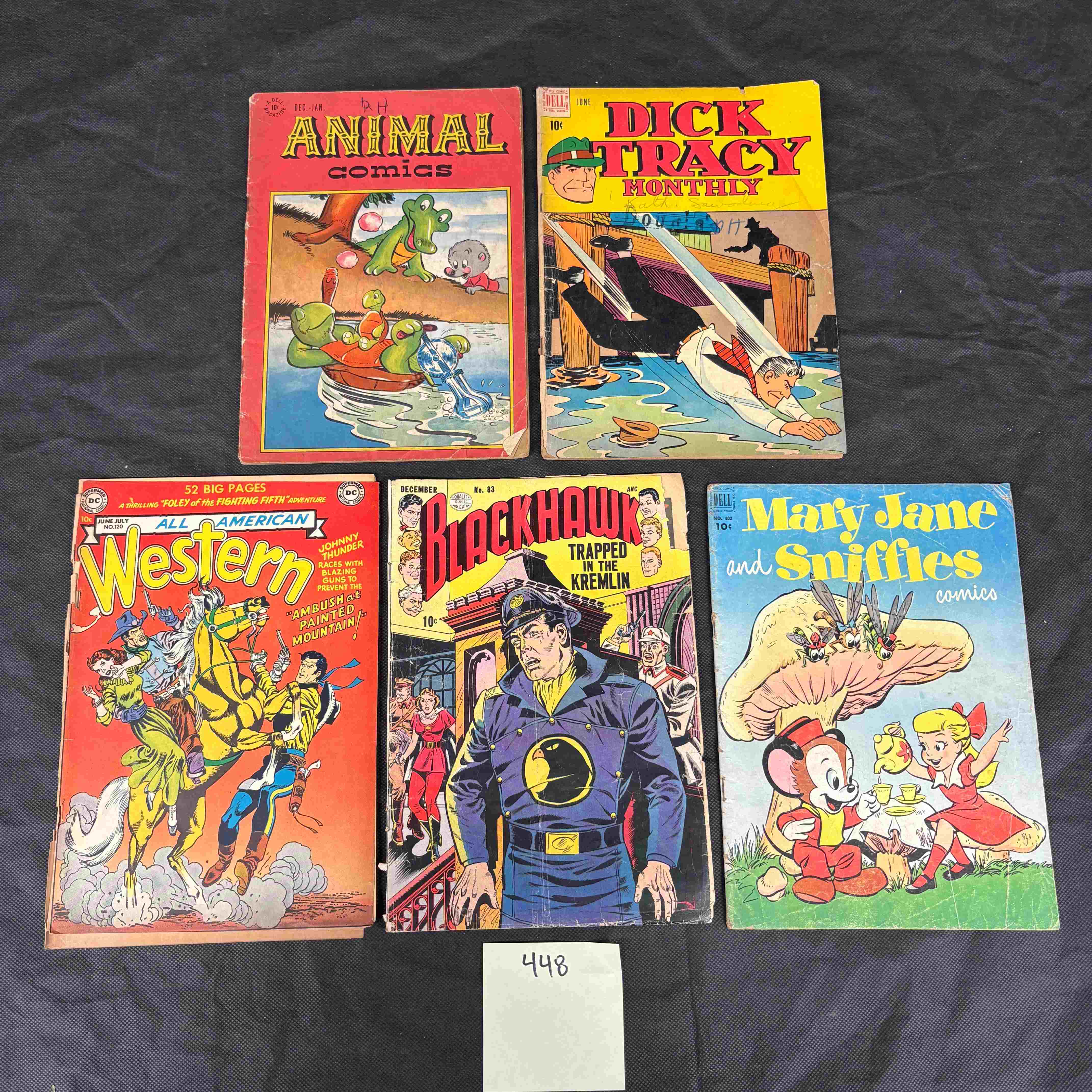 A collection of 5 vintage American comic books, including Blackhawk No. 63 (Quality Comics, December 1953). The lot also features Animal Comics No. 44 (Dec. Jan.), Dick Tracy Monthly No. 4 (June), All-American Western No. 102 (Dec. Jan.), and Mary Jane and Sniffles comics (Fall). All comics feature a 10-cent cover price and characteristic art style of the Golden or early Silver Age. The Blackhawk cover features the translated text, “TRAPPED by the KREMLIN!”, indicating a Cold War context. Back covers display various period advertisements, including one for “Daisy Air Rifles, ” subscription offers for “Dick Tracy Monthly, ” and additional comic strips such as “Uncle Waggly.” Constructed from standard comic book paper. A white tag with the number “448” is present at the bottom.