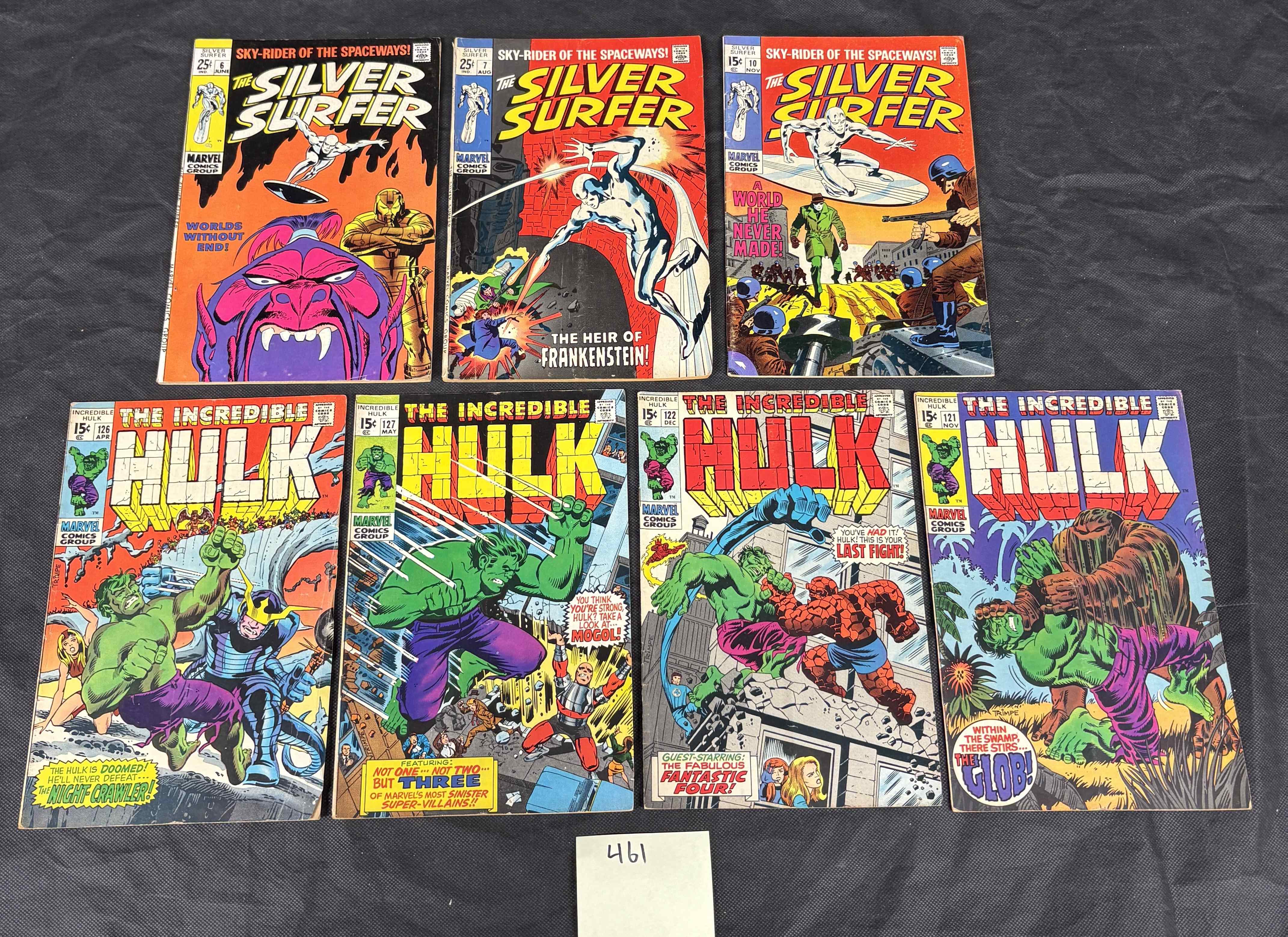 A group of 7 vintage American comic books published by Marvel Comics Group, comprising five issues from The Incredible Hulk (1962 1st Series) and three issues from The Silver Surfer. The Incredible Hulk issues include #120, #121, #124, #127, and #130. The Silver Surfer issues include #4, #7, and #15. These comics display a late Silver Age/early Bronze Age style, with visible cover prices of 15¢ and 25¢. Notable cover text includes “Sky-Rider of the Spaceways!”, “The Heir of Frankenstein!”, “The Hulk vs. The Thing!”, and “Guest-Starring The Fabulous Fantastic Four!”. The reverse sides feature period advertisements for educational courses and mail-order products, such as “Finish High School at home” and “Make Money Get Prizes with fast-selling American Seeds.”