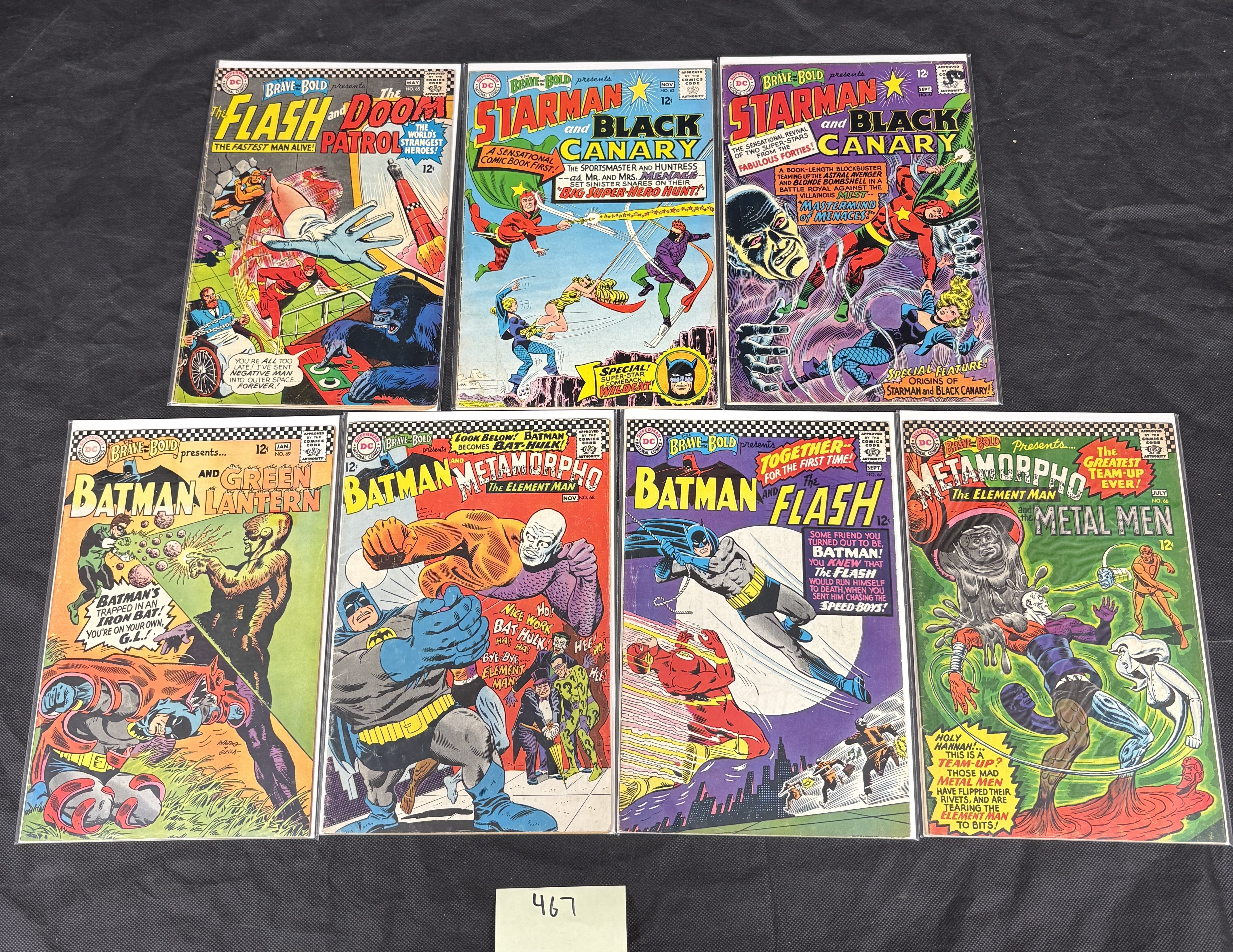 A collection of seven vintage American comic books from the DC Comics series ‘The Brave and The Bold,’ presented in individual clear plastic sleeves. These issues span the mid-to-late 1960s, each bearing a ’12c’ cover price and an ‘Approved by the Comics Code Authority’ seal. The collection includes the following issues: No. 65 (May), No. 62 (Nov), No. 61 (Sept), No. 69 (Jan), No. 68 (Nov), No. 67 (Sept), and No. 66 (July). Visible on the full-color covers are key character team-ups such as The Flash and Doom Patrol, Starman and Black Canary, Batman and Green Lantern, Batman and Metamorpho The Element Man, Batman and The Flash, and Metamorpho The Element Man and The Metal Men. The comics are constructed from typical printed paper with vibrant color ink. A small white tag with the handwritten number ‘467’ is present beneath the collection.
