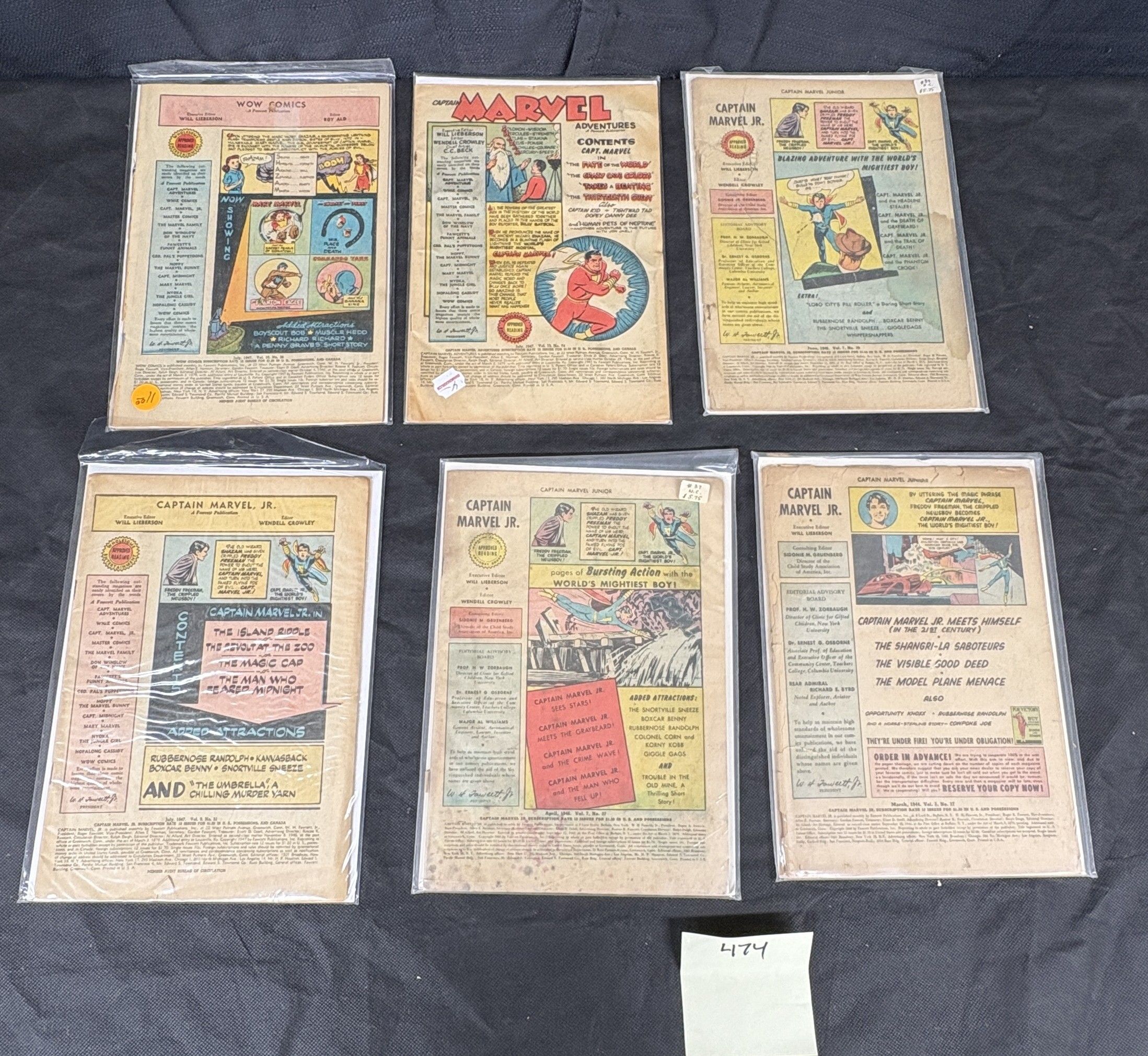 A group of six Golden Age comic books published by Fawcett Comics. Titles include ‘WOW COMICS,’ ‘CAPTAIN MARVEL ADVENTURES,’ and multiple issues of ‘CAPTAIN MARVEL JR.’ The visible publication dates range from March 1946 to July 1947. Each comic is crafted from paper and presented individually in a clear plastic sleeve with a backing board. The visible reverse covers primarily feature promotional content and interior artwork for superhero and adventure stories.