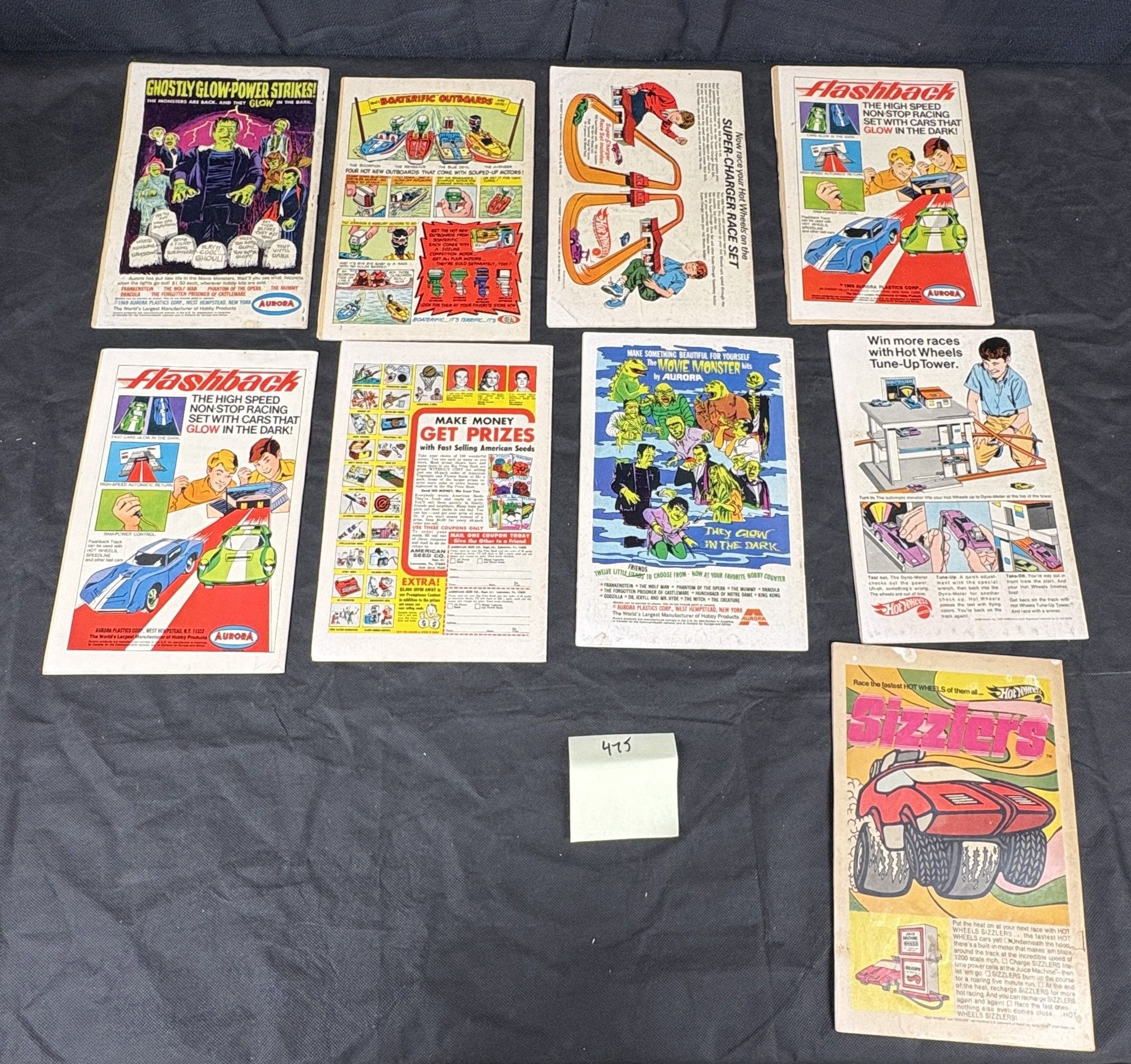 A collection of vintage paper advertisements, primarily sourced from 1970s comic books and magazines. The group comprises ten individual advertisements, predominantly dating from the late 1960s as indicated by visible copyright dates of 1969. Featured brands include Aurora, with ads for ‘Ghostly Glow-Power’ monster model kits, ‘Boaterific Outboards,’ and ‘The Movie Monster kits.’ Also present are various Hot Wheels advertisements, such as the ‘Super-Charger Race Set,’ ‘Flashback’ racing sets, the ‘Tune-Up Tower,’ and ‘Sizzlers’ cars. An advertisement for ‘American Seeds’ offering prizes is also included. All items are made of paper.