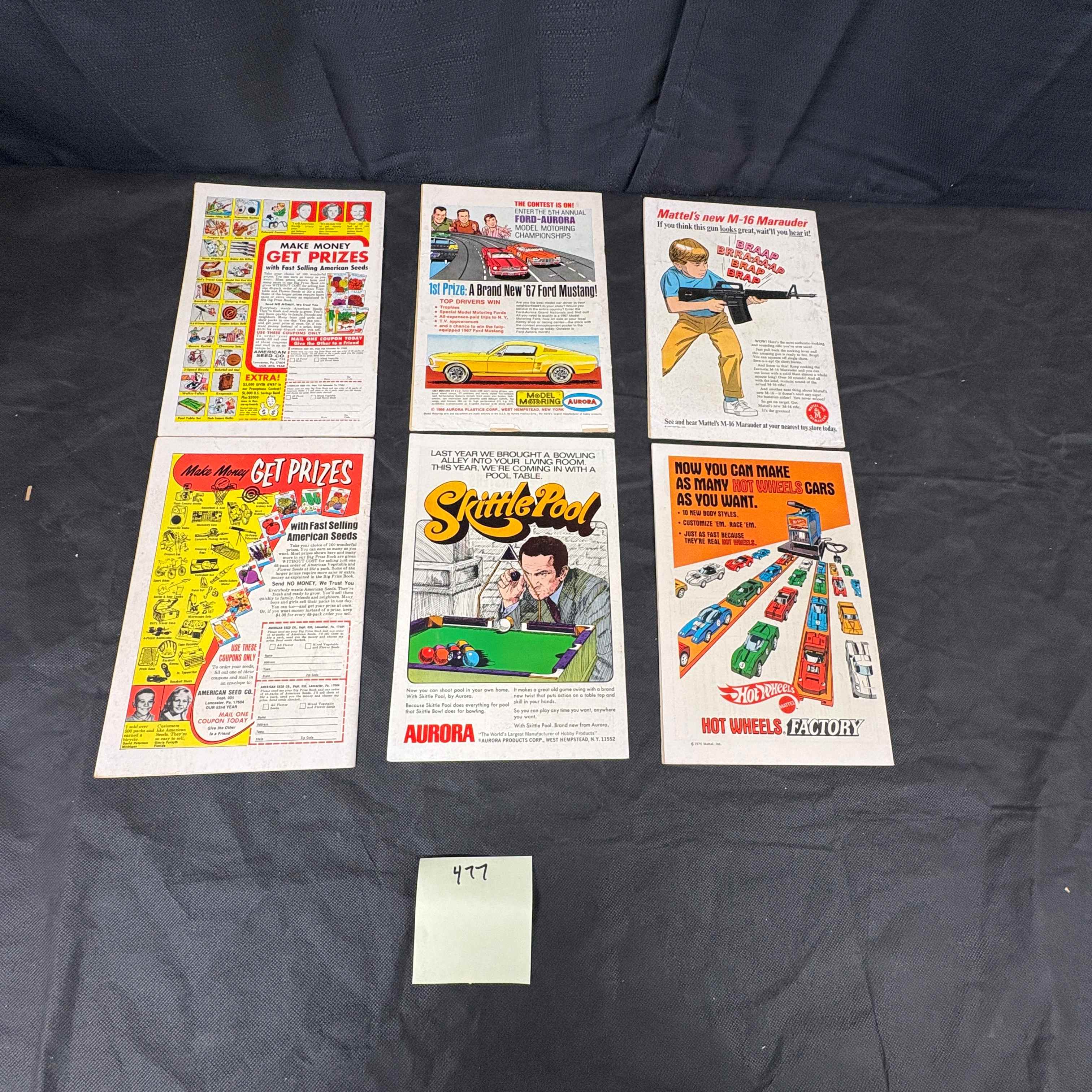A group of six vintage comic books from the DC Comics series ‘The Unexpected’. The lot includes issue #122, which is consistently identified across multiple online sources. All comics bear a cover price of 15 cents, indicative of the Bronze Age era. Front covers display various horror and mystery-themed artwork and titles, such as “SUDDEN DEATH!”, “DEATH RACE!”, and “THE PHANTOM OF THE WOODSTOCK FESTIVAL.” Back covers feature period advertisements for items including the Ford Aurora Model Motoring Championship, Mattel’s M-16 Marauder, and Hot Wheels Factory. The comics are presented with a small white paper tag marked “477.”