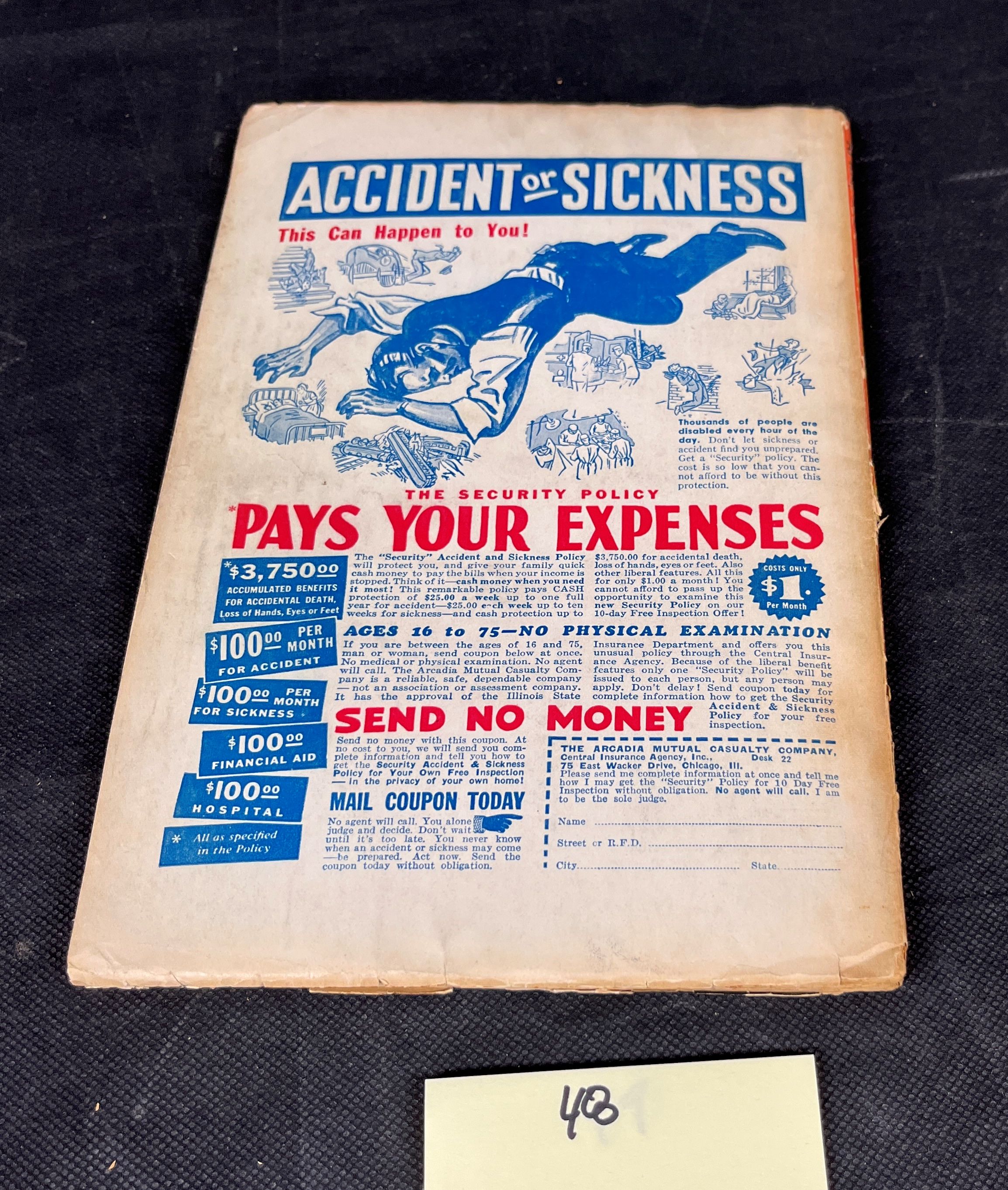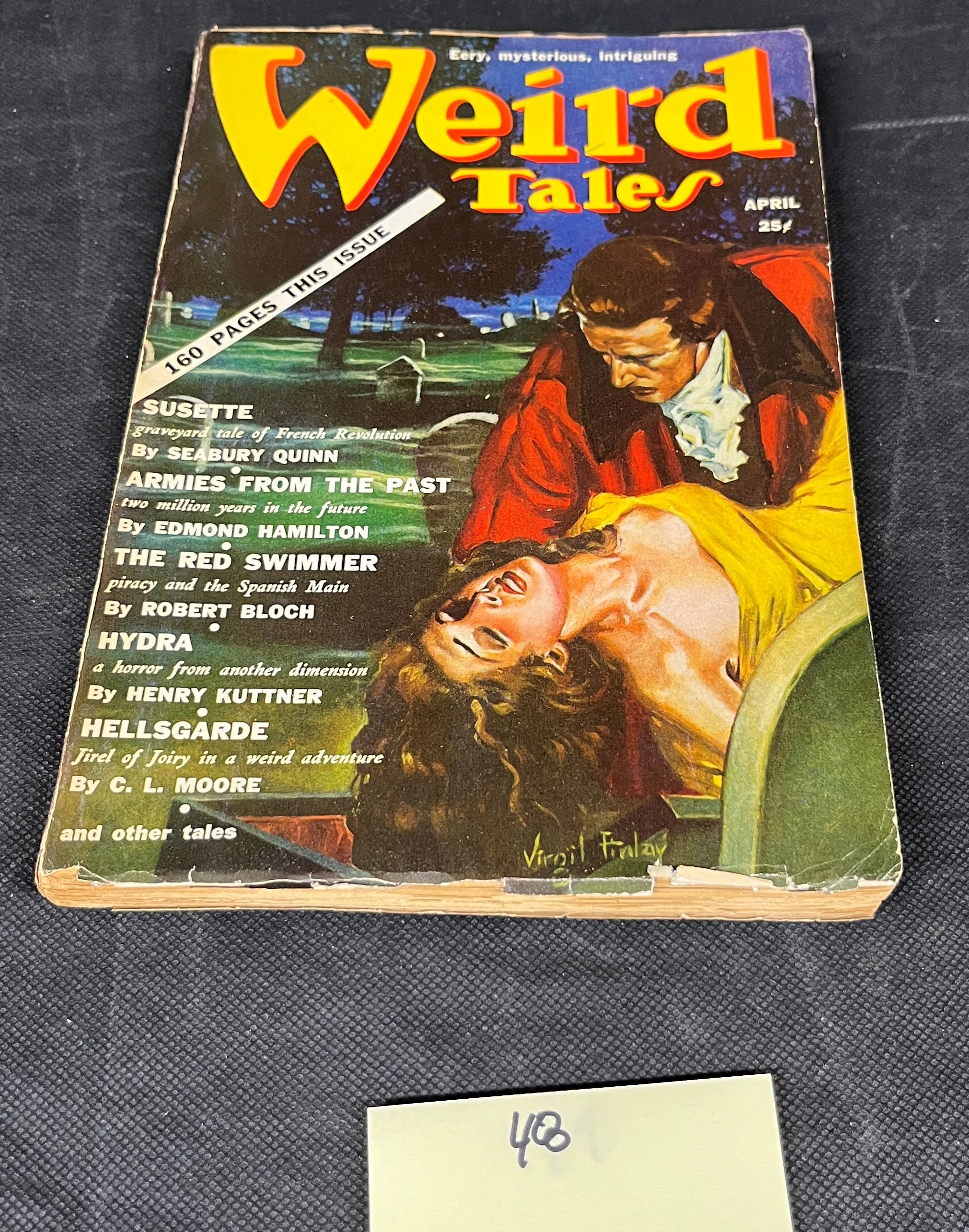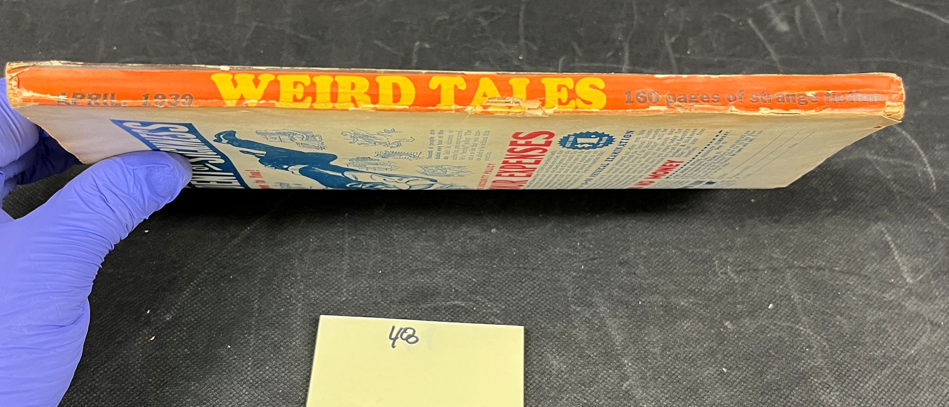 A vintage issue of “Weird Tales” pulp magazine, dated April 1939, featuring a dramatic front cover illustration signed by Virgil Finlay. Originally priced at 25¢, this issue contains 160 pages of strange fiction. Notable contents include stories by Seabury Quinn, Edmond Hamilton, Robert Bloch, Henry Kuttner, and C.L. Moore. The cover depicts a man in period dress leaning over a distressed woman. The reverse side features a vintage advertisement for “Accident or Sickness” insurance from “The Security Policy.” Constructed of paper.