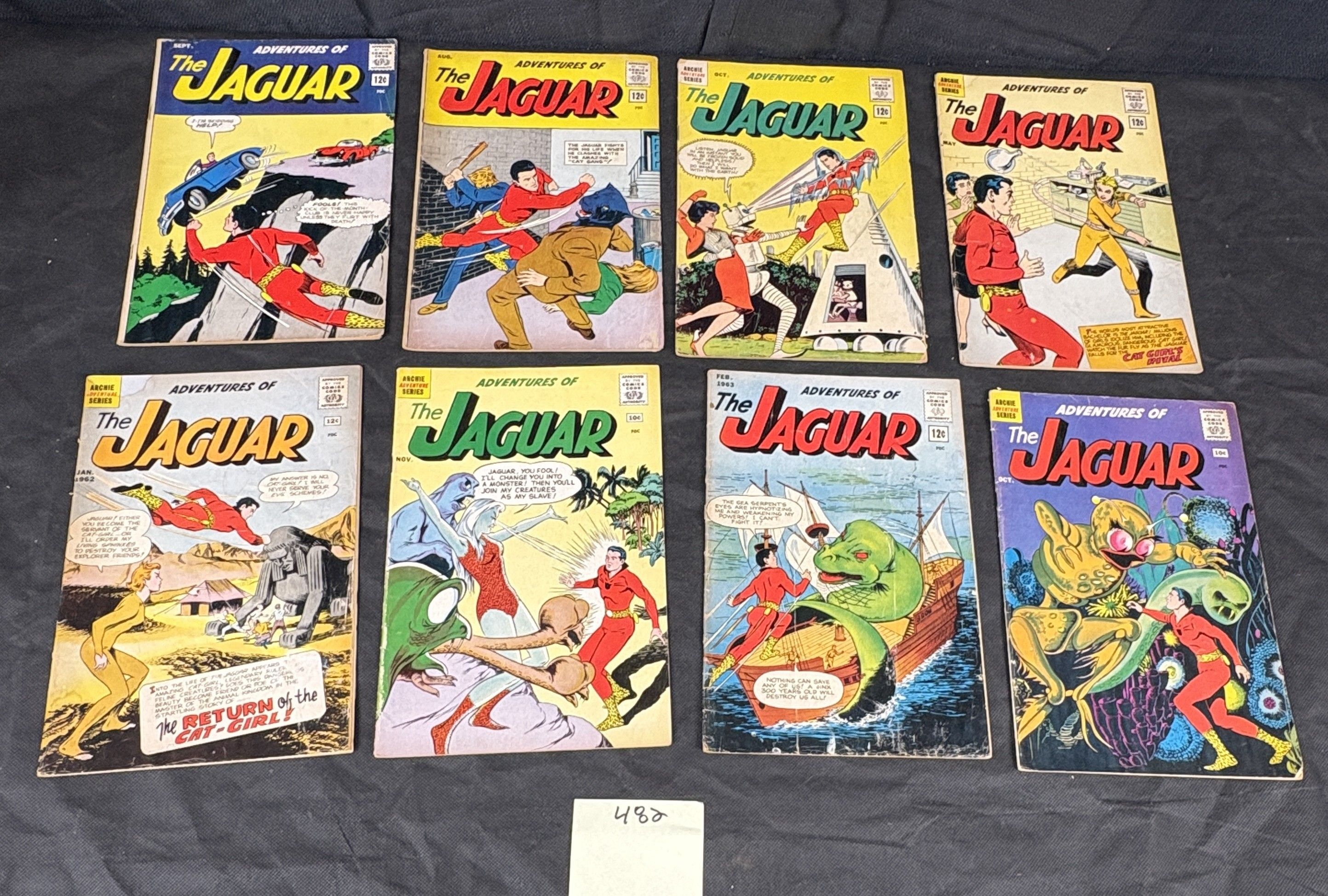 A group of eight vintage comic books from the “Adventures of The Jaguar” series, published by Archie Comics, dating from 1961-1962. Each issue is consistently priced at 12c, with visible issue numbers ranging from #1 (September) to #8, indicating a significant run within the series. The covers feature superhero adventure illustrations characteristic of mid-20th-century comic art. Made of printed paper, the comics exhibit overall fair to good condition, displaying typical signs of age and handling such as edge wear, minor creasing, and some discoloration or toning, but generally retain vibrant cover colors and appear complete. A separate, handwritten note with “482” is present on a slip of paper.