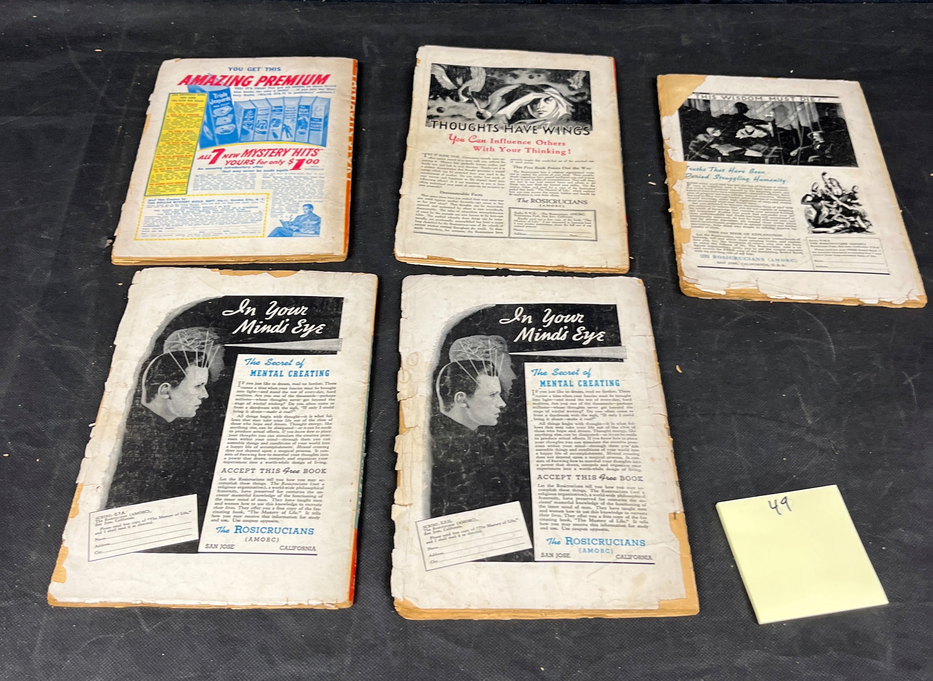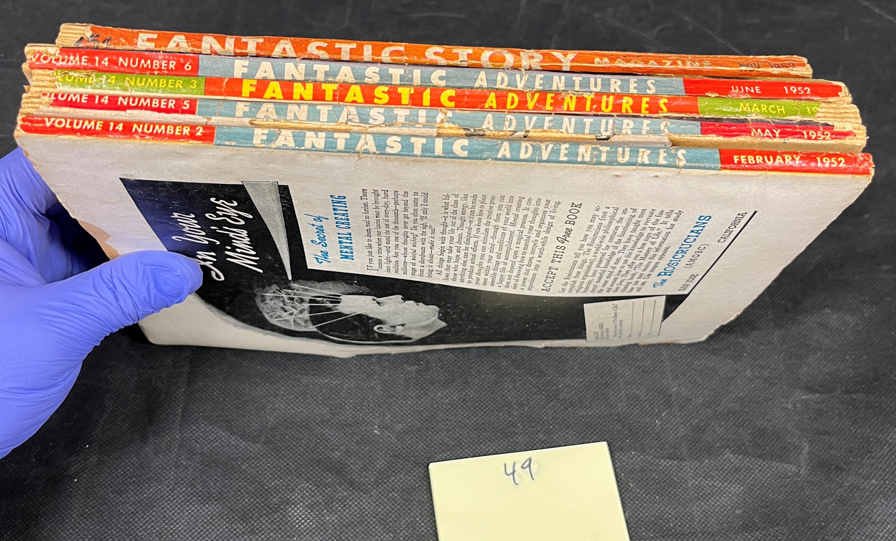 A group of five vintage American pulp magazines, comprising one issue of “Fantastic Story Magazine” (June 1952) and four issues of “Fantastic Adventures” (February, March, May, and June 1952). Printed on acidic pulp paper, these magazines feature vibrant, dramatic science fiction and fantasy cover art. The covers depict various creatures, human figures, and action scenes, with visible story titles including “THE WOMAN IN SKIN 13” and “THE SOUL SNATCHERS”. The back covers predominantly display period advertisements, notably for “The Rosicrucians (AMORC)” promoting “The Secret of Mental Creating” under the heading “In Your Mind’s Eye”, alongside other offers such as “7 MYSTERY HITS YOURS for only $1.00”. An internal identifier, a yellow sticky note marked “49”, is present.