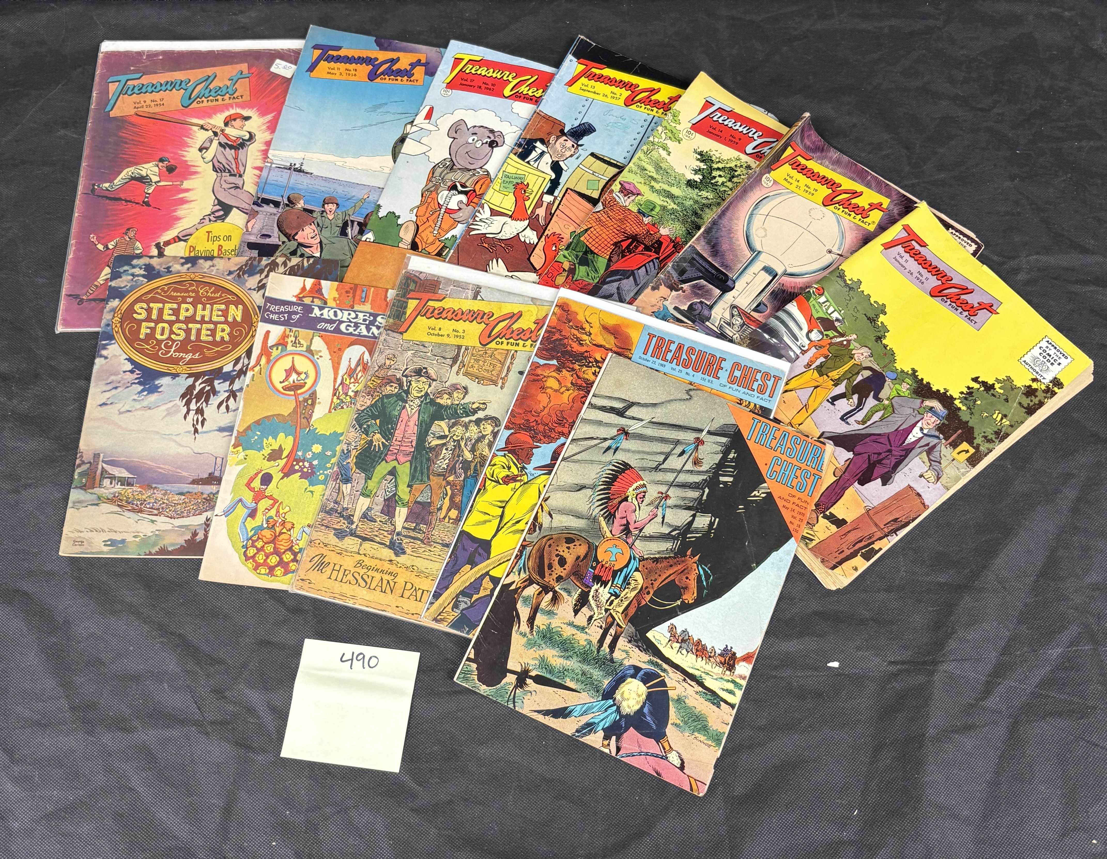 A collection of approximately 14-15 vintage "Treasure Chest of Fun & Fact" comic-style magazines. These paper-based periodicals feature diverse illustrated covers depicting various themes, including baseball, military scenes, historical figures, Native Americans, and cartoon characters. Visible text includes volume and issue numbers, publication dates ranging from April 1954 to May 1970, and prices (e.g., "10¢, " "15¢ U.S."). Some covers also bear the "Approved by the Comics Code Authority" seal, while specific subtitles like "Stephen Foster Songs" and "The Hessian Pat[riot]" are also present.