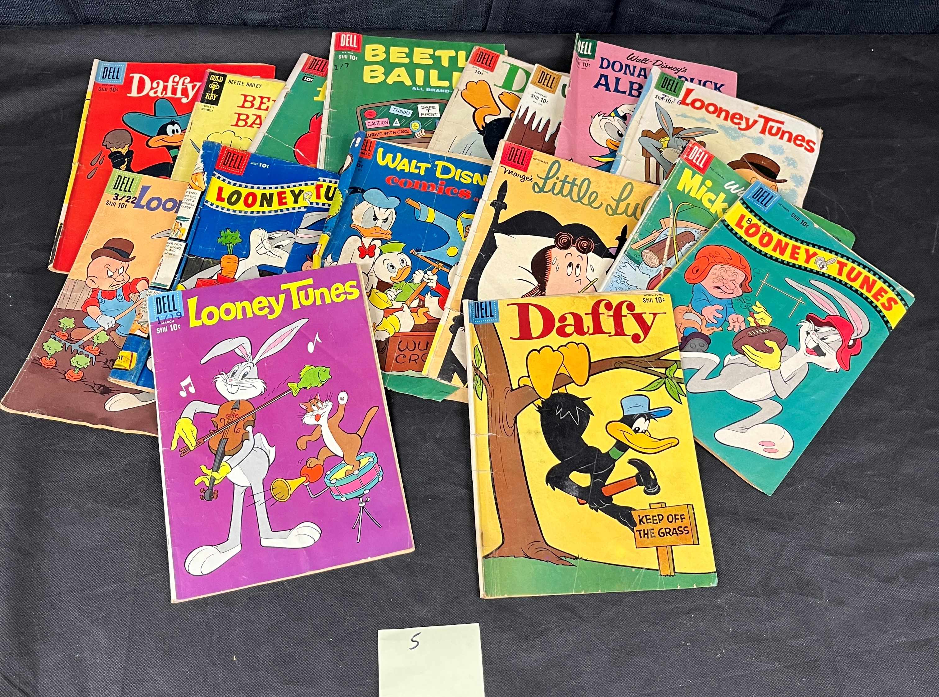 This lot comprises approximately fifteen vintage American comic books, predominantly published by Dell, featuring a diverse array of popular cartoon characters. Visible titles include “Daffy, ” “Looney Tunes, ” “Beetle Bailey, ” “Walt Disney Comics, ” “Donald Duck, ” “Mickey Mouse, ” and “Marge’s Little Lulu.” The recurring “Still 10¢” price and classic art style strongly indicate a mid-20th-century publication period, with visible issue dates such as “March, ” “April-June, ” “November, ” “January, ” “July, ” and “October.” Additional visible text includes phrases like “KEEP OFF THE GRASS, ” “CAUTION, ” “THINK!”, “SAFE FIRST, ” and “DRIVE WITH CARE.”