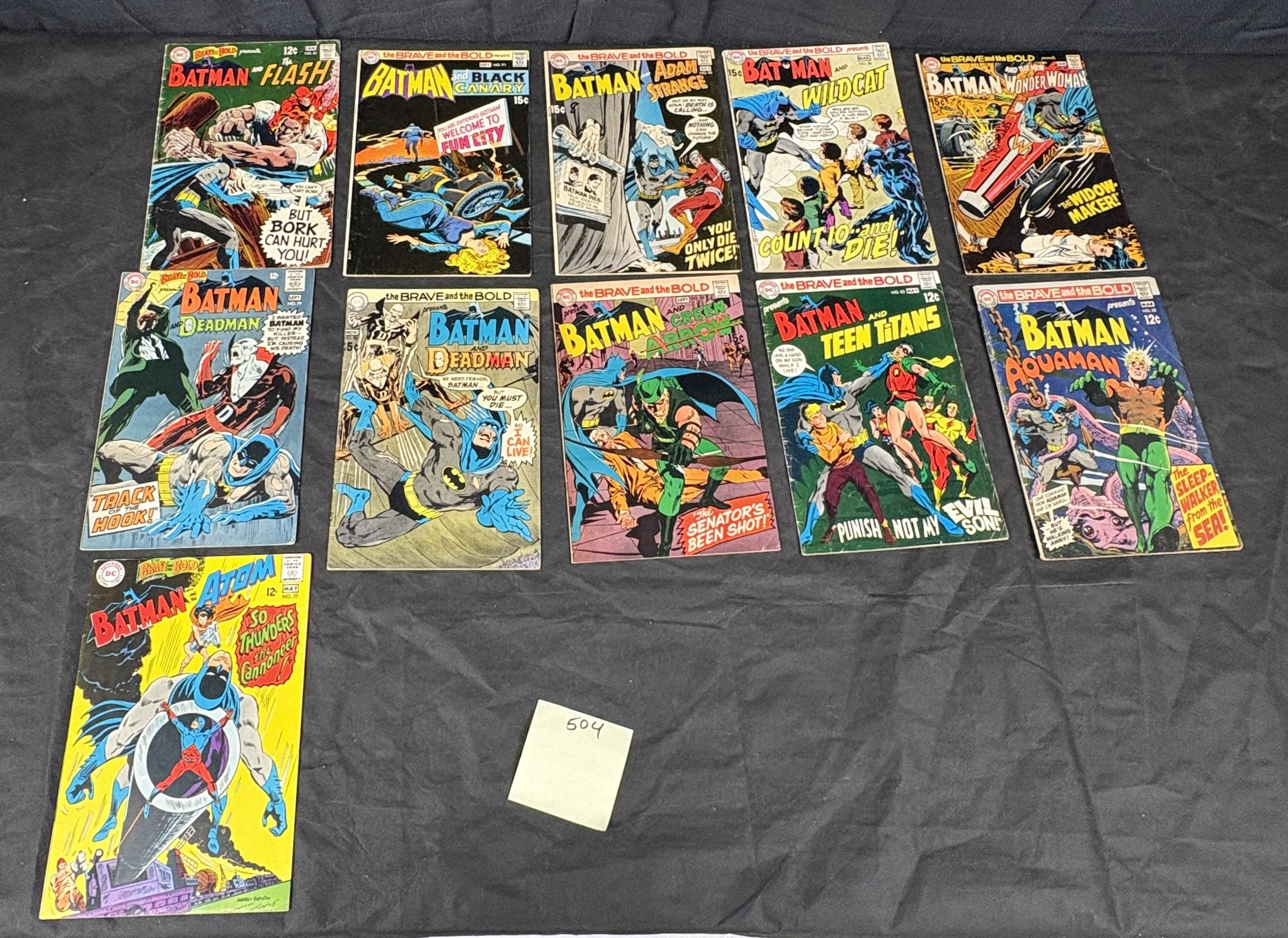 This lot features eleven vintage American comic books from DC Comics’ ‘The Brave and the Bold’ series, prominently including issue #85 from August-September 1969, which features Batman and Green Arrow. The collection spans the Silver Age to early Bronze Age, with visible 12c and 15c cover prices, dating primarily from the late 1960s to early 1970s. Each comic is made of printed paper and features dynamic action art. Other issues in the collection feature Batman teaming up with characters such as Flash, Black Canary, Adam Strange, Wildcat, Wonder Woman, Deadman (two issues), Teen Titans, Aquaman, and Atom. Story titles or taglines include ‘BUT BORK CAN HURT YOU!’, ‘WELCOME TO FUN CITY’, ‘YOU ONLY DIE TWICE!’, ‘COUNT-10-AND DIE!’, ‘THE WIDOW-MAKER!’, ‘TRACK OF THE HOOK!’, ‘THE SENATOR’S BEEN SHOT!’, ‘PUNISH NOT MY EVIL SON!’, ‘THE SLEEP-WALKER FROM THE SEA!’, and ‘SO THUNDERS THE CANNONEER.’ A yellow sticky note with the handwritten number ‘504’ is visible within the lot.