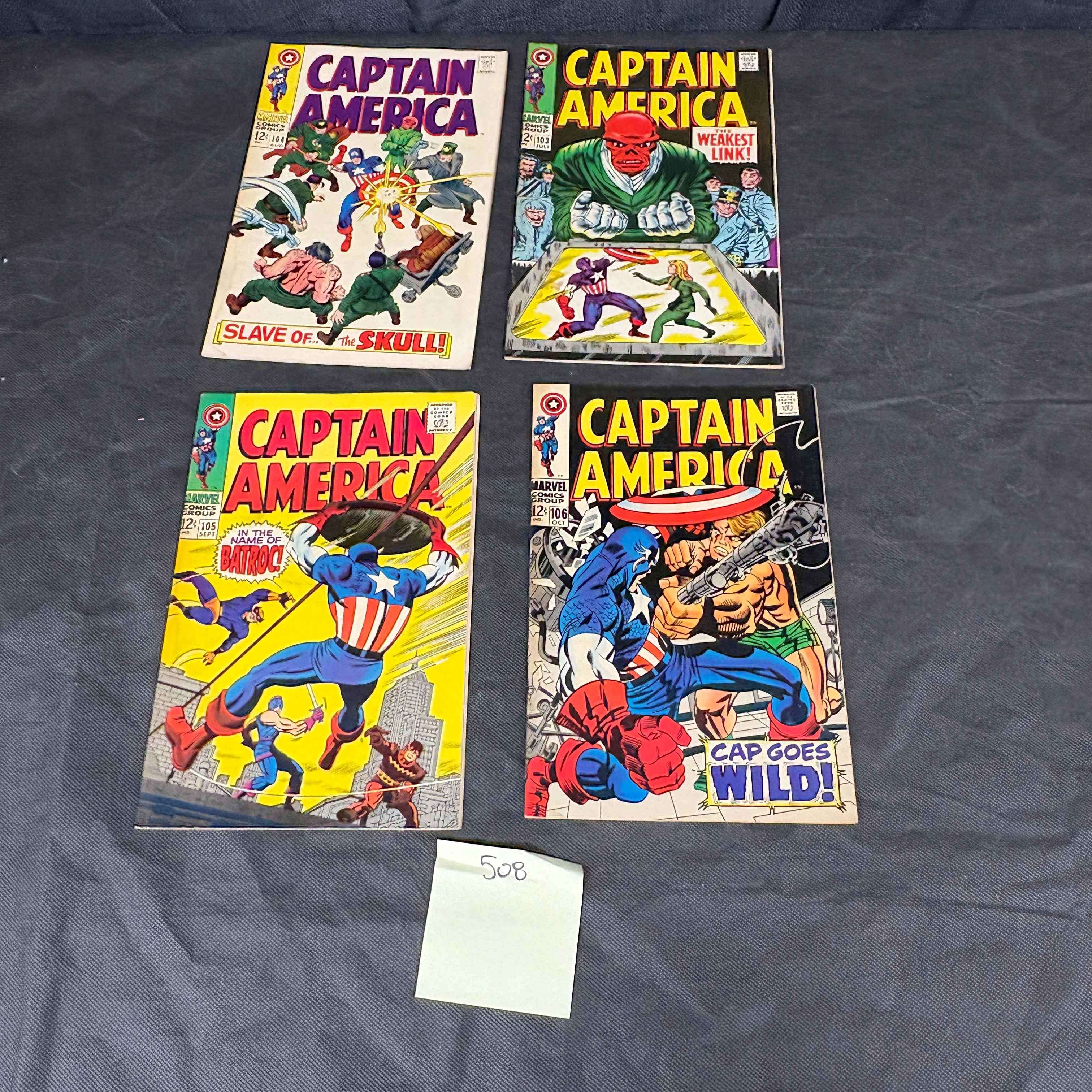 A group of four vintage Marvel Comics Group ‘Captain America’ comic books from the 1968 1st Series. This lot comprises issues 106, 107, 108, and 109. Each issue is priced at 12 cents and features classic mid-20th century superhero artwork. The specific issues, their cover titles, and publication dates are as follows: