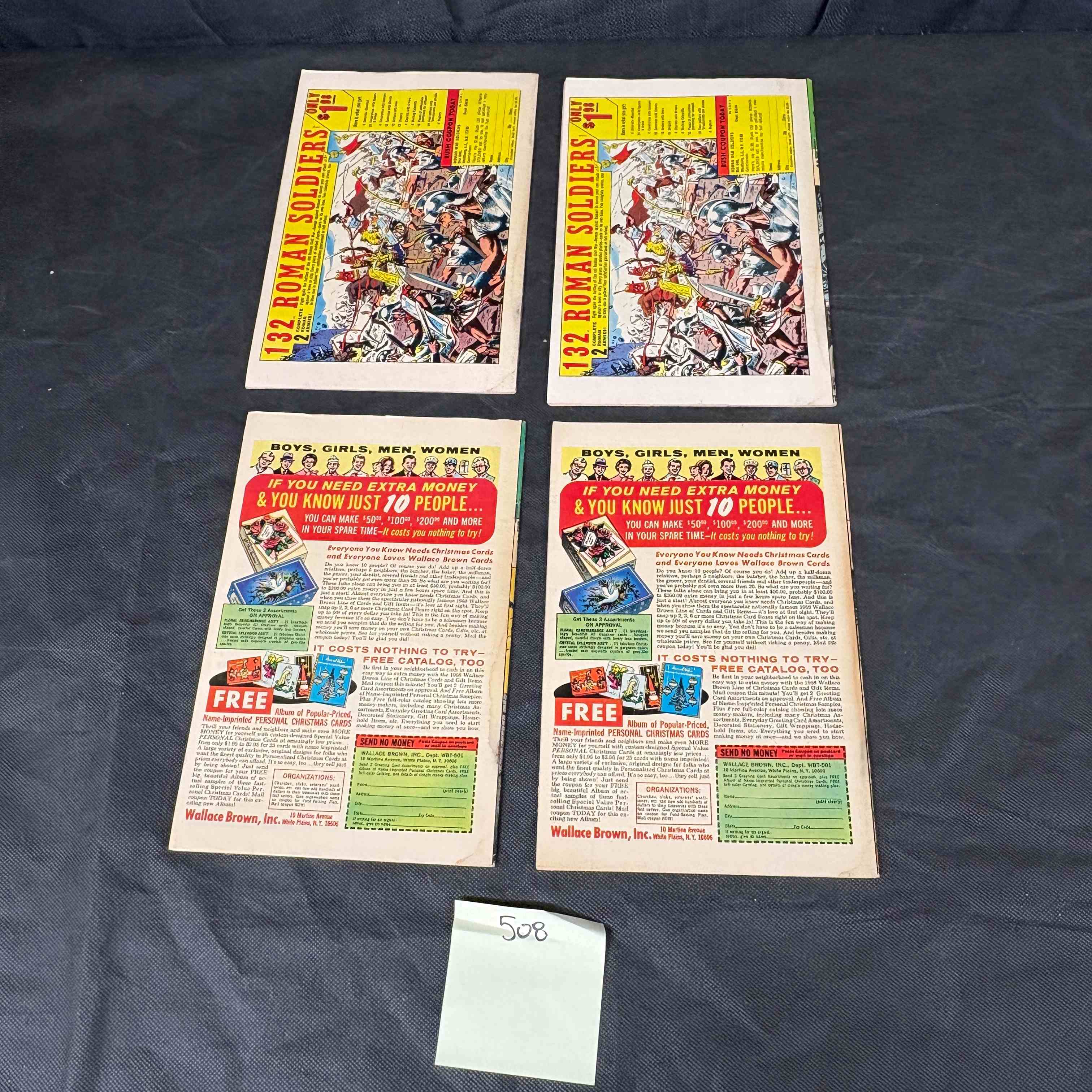 The reverse sides display era-appropriate advertisements, including one for "132 Roman Soldiers Only $1!!!" and another for earning money selling Christmas cards from "Wallace Brown, Inc." Constructed from paper. A small white slip of paper with the handwritten number "508" is present with the lot.
