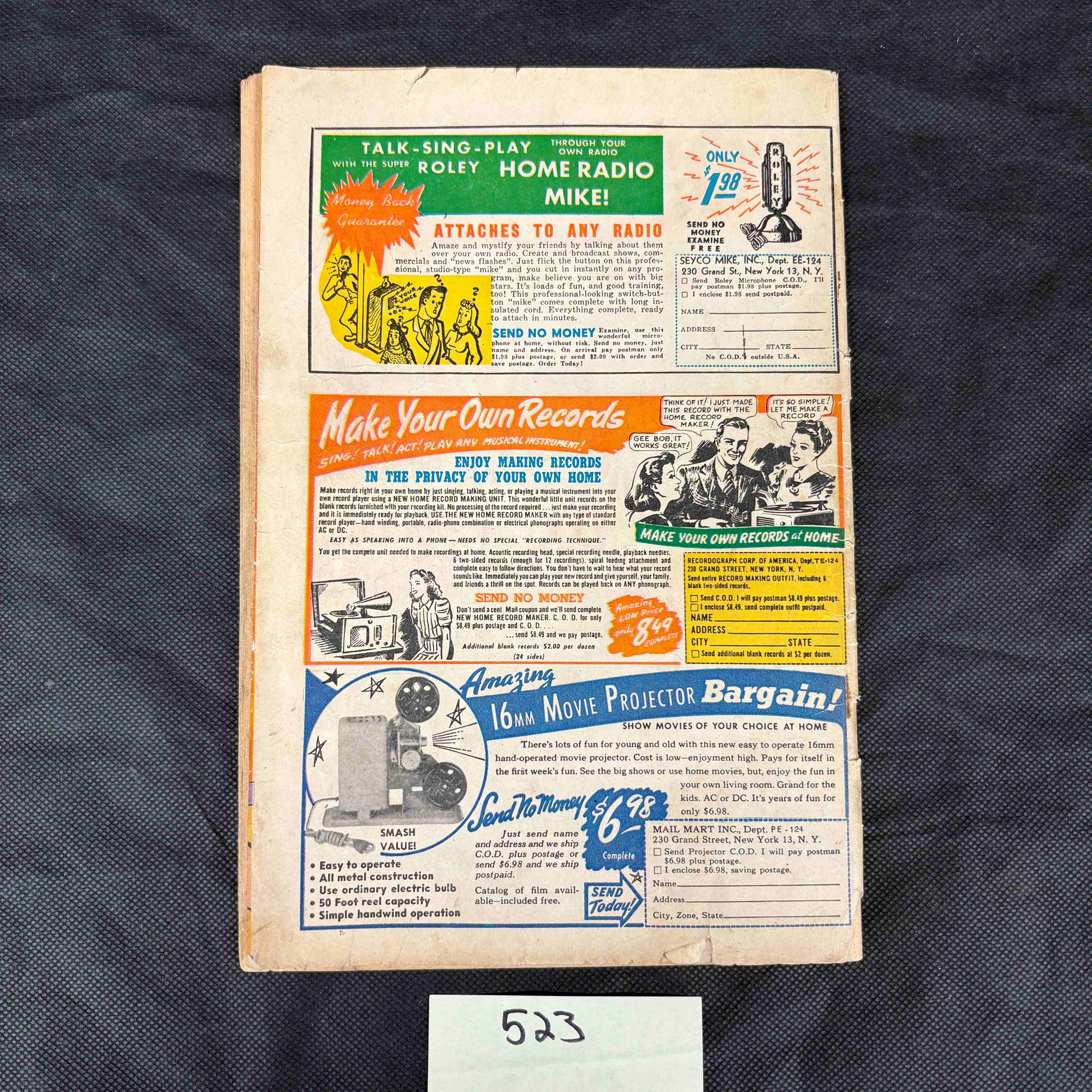 A vintage American comic book, ‘Wings Comics’ issue No. 95, published by Fiction House in May 1948. This Golden Age comic features a dynamic cover, characteristic of Good Girl Art (GGA), depicting a woman in a blue dress holding a submachine gun, an airplane, and various figures in combat or exotic attire, set against a backdrop including onion-domed buildings. Prominent cover text includes “KIDNAP CARGO” featuring “Captain WINGS” and “The GHOST SQUADRON.” The back cover is entirely covered with period advertisements for various mail-order products, such as “HOME RADIO MIKE,” “MAKE YOUR OWN RECORDS,” and a “16MM Movie Projector.” The comic is printed on paper stock.