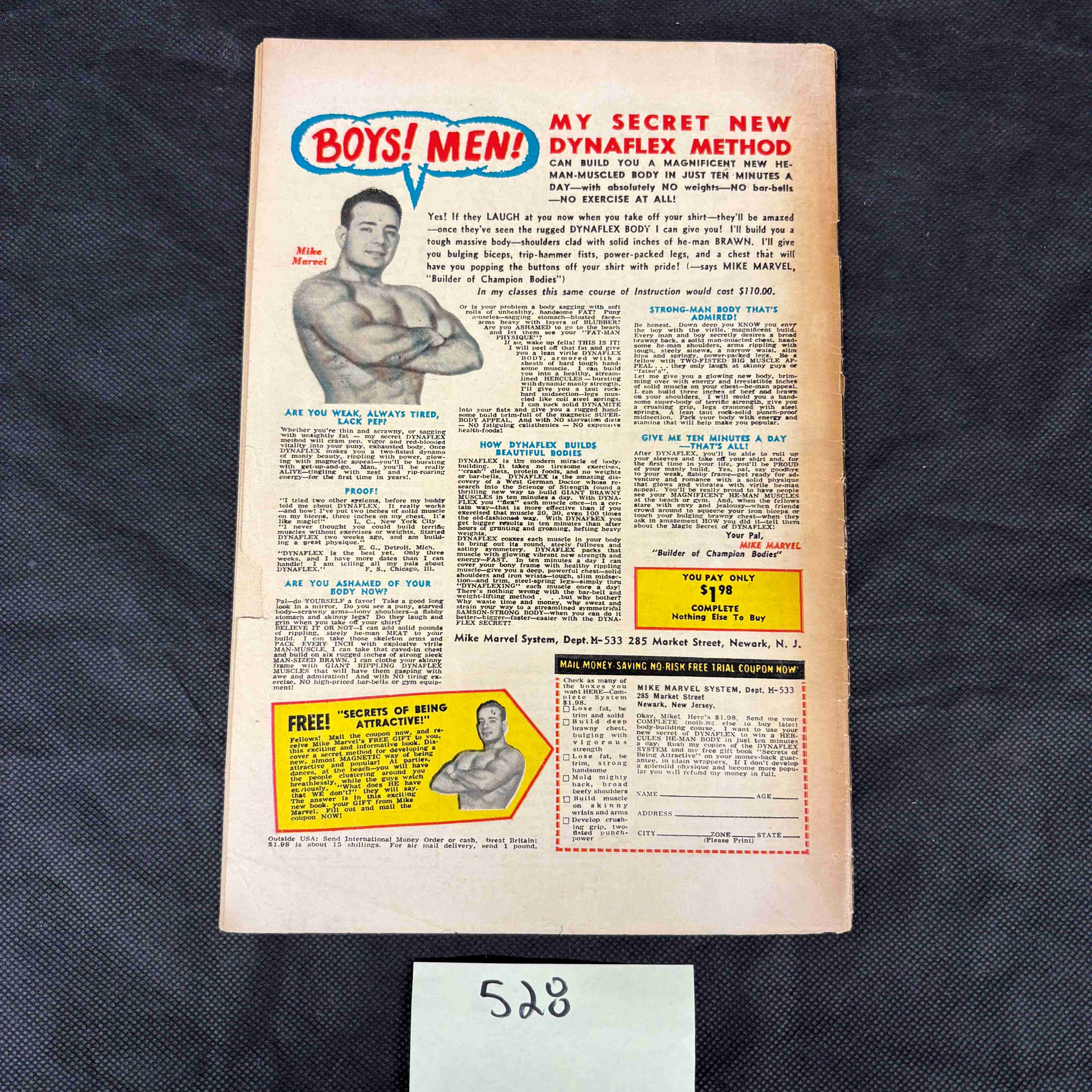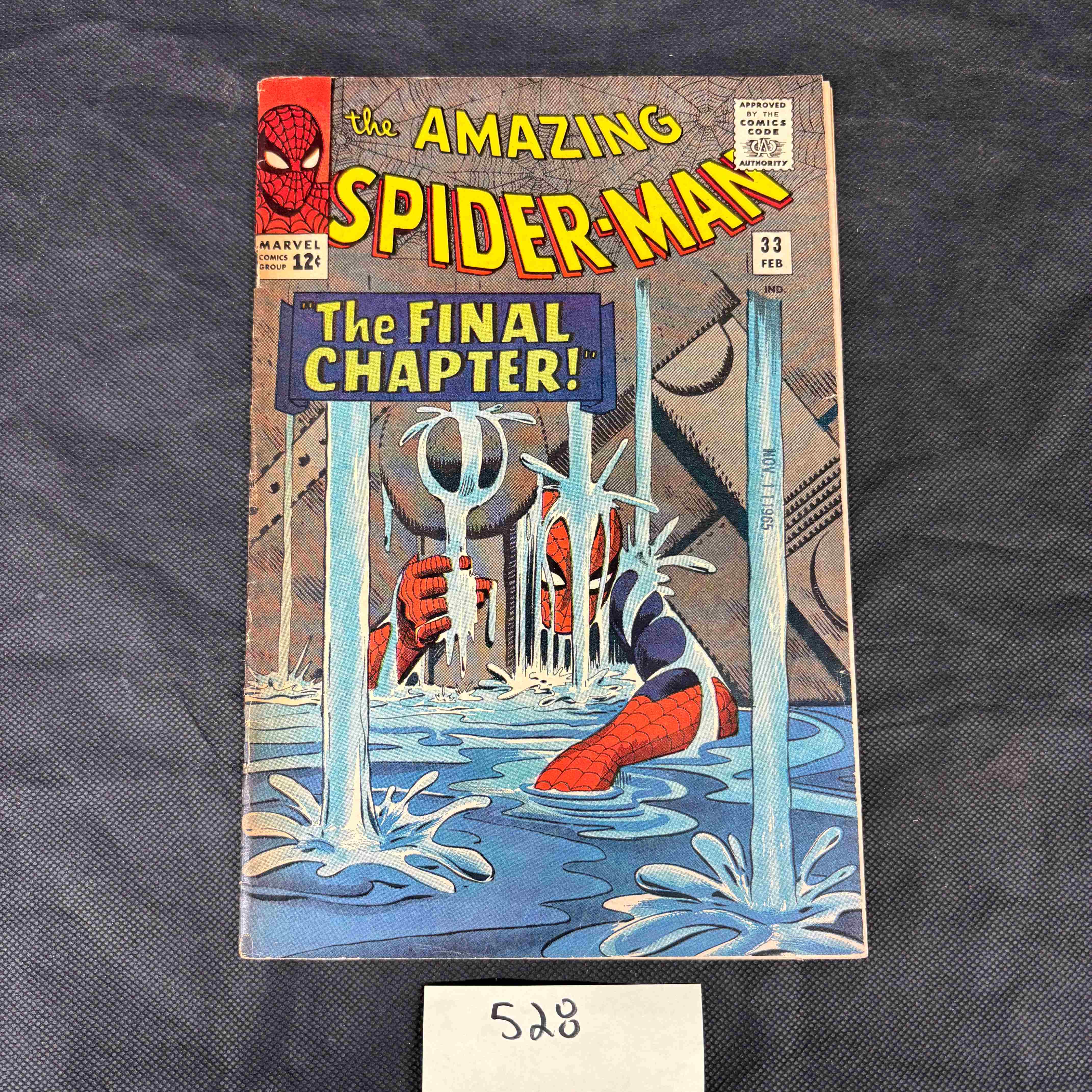 A Marvel Comics ‘The Amazing Spider-Man’ comic book, issue #33, from the 1963 series. The front cover, dated February and marked November 1965, prominently features the text ‘The Final Chapter!’ and depicts Spider-Man submerged in water, struggling amidst pipes. It includes the ‘Approved by the Comics Code Authority’ seal and a 12¢ price. The reverse, printed on paper, features a full-page advertisement titled ‘BOYS! MEN! MY SECRET NEW DYNAFLEX METHOD’ by Mike Marvel, promoting a body-building course with a mail-in coupon. A separate white label bearing the number ‘528’ is present below the item.