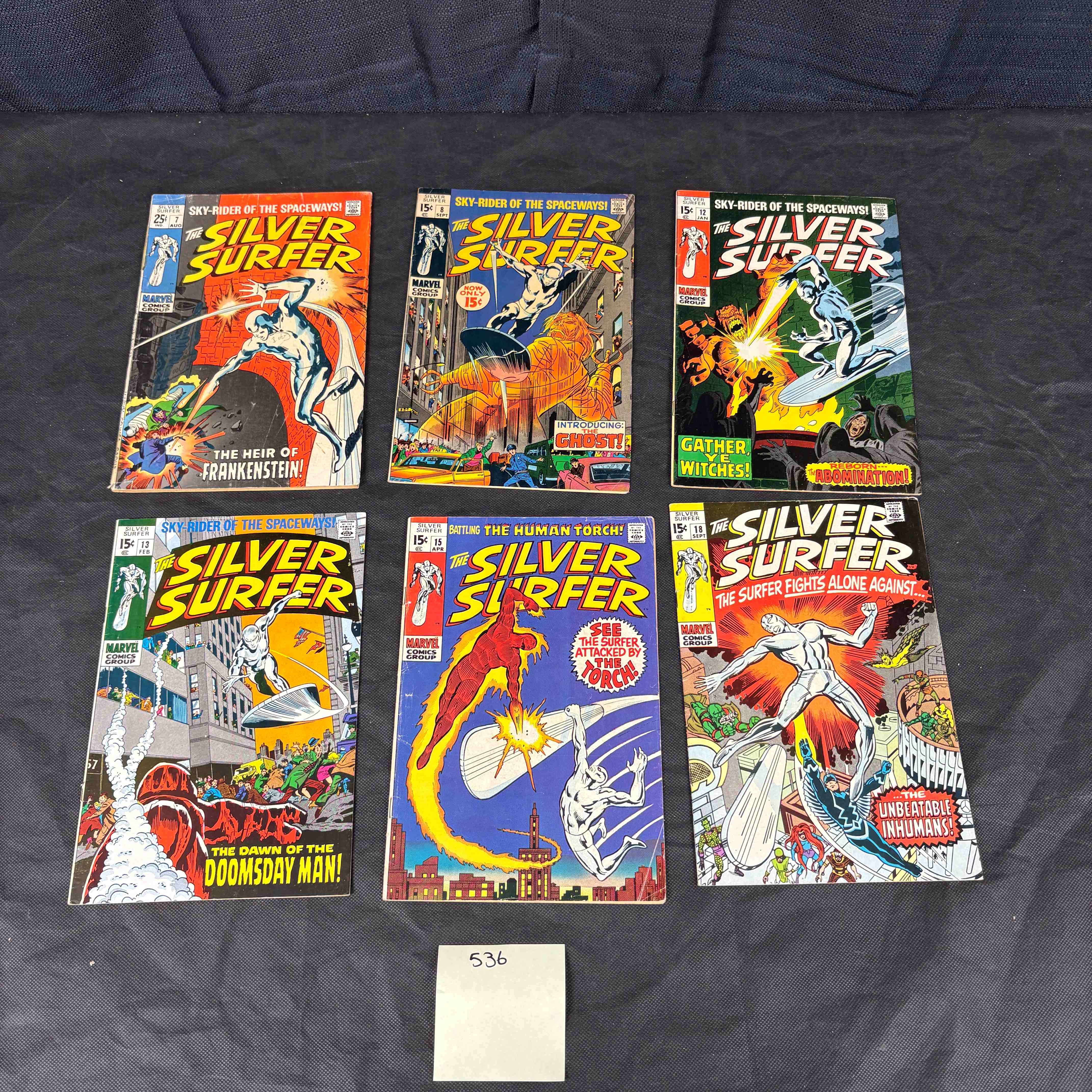 A set of six vintage comic books from Marvel Comics Group’s ‘The Silver Surfer’ series, comprising issues #7, 8, 12, 13, 15, 18 published between 1968 and 1970. Each comic features a 15-cent cover price, characteristic of the late Silver Age / early Bronze Age publication period. The front covers display dynamic, colorful illustrations in the classic Marvel style, with visible story titles for individual issues including ‘The Heir of Frankenstein!’ (#2), ‘Introducing Mephisto!’ (#3), ‘Gather Witches!’ (#4), ‘The Dawn of the Doomsday Man!’ (#5), ‘Challenge the Human Torch!’ (#6), and ‘The Silver Surfer Fights Alone Against The Unbeatable Inhumans!’ (#7). The back covers feature various period-typical advertisements, such as those for home education and earning money or prizes. Constructed from paper.
