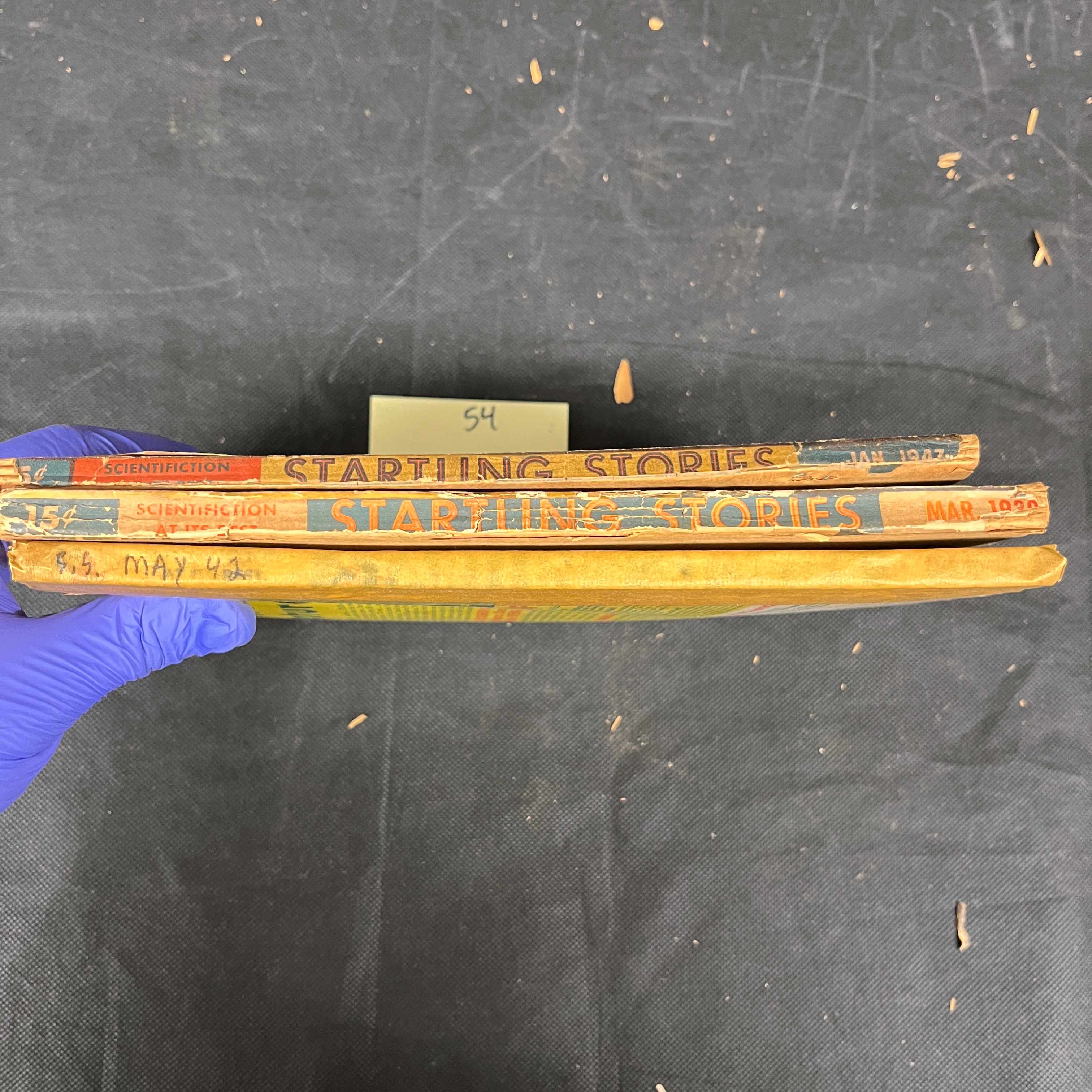 Three vintage American science fiction pulp magazines, titled ‘Startling Stories,’ dated May 1942, January 1947, and March 1947. Each issue was originally priced at 15¢ and identified as ‘A Thrilling Publication’ of ‘SCIENTIFICTION.’ The paper covers feature characteristic vibrant, dramatic sci-fi artwork, depicting scenes such as ‘Blood on the Moon’ (May 1942), ‘The Impossible World’ (March 1947), and ‘The Star of Life’ (January 1947). Authors noted include Lando Binder, P. Schuyler Miller, and Edmond Hamilton. The reverse sides display various period advertisements. All issues appear to be complete. A white slip of paper bearing the handwritten number ’54’ is present alongside the magazines.