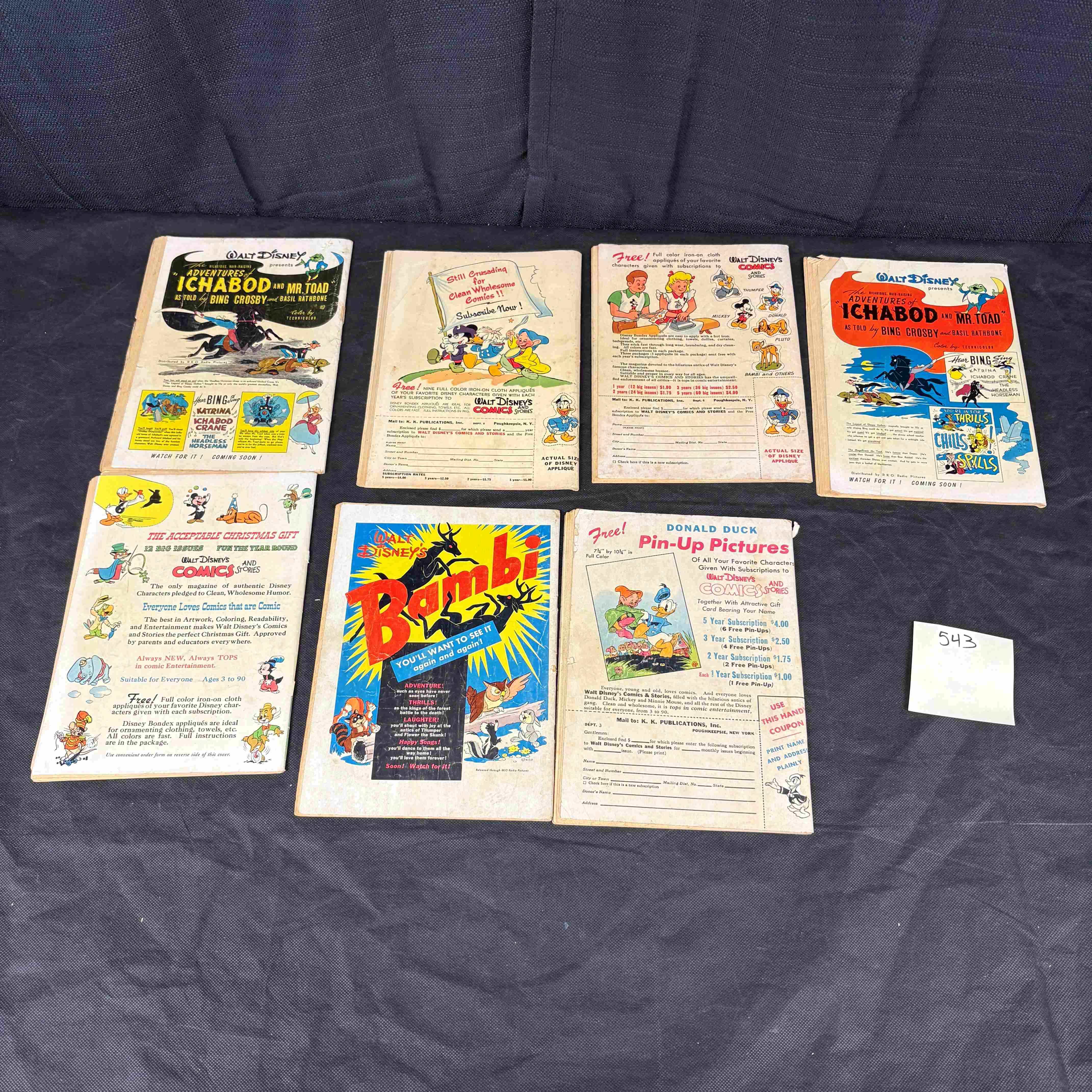 7 vintage ‘Walt Disney’s Comics and Stories’ comic books, primarily featuring Donald Duck and other classic Disney characters, many with stories by the influential Golden Age artist Carl Barks. Identified issues include #101, #102, #105, #106, #107, #108, and #109, dating them to the late 1940s to early 1950s. Printed on paper, each comic cover displays an original price of ’10¢, ‘ with one issue also having a handwritten ‘$8.00’ crossed out and ‘$4.00’ next to it. The back covers feature period advertisements for other Disney comics and films such as ‘Ichabod and Mr. Toad, ‘ ‘Bambi, ‘ and ‘Cinderella.’ A small white label with ‘543’ handwritten on it is present on the lower right corner, likely an inventory or lot number.
