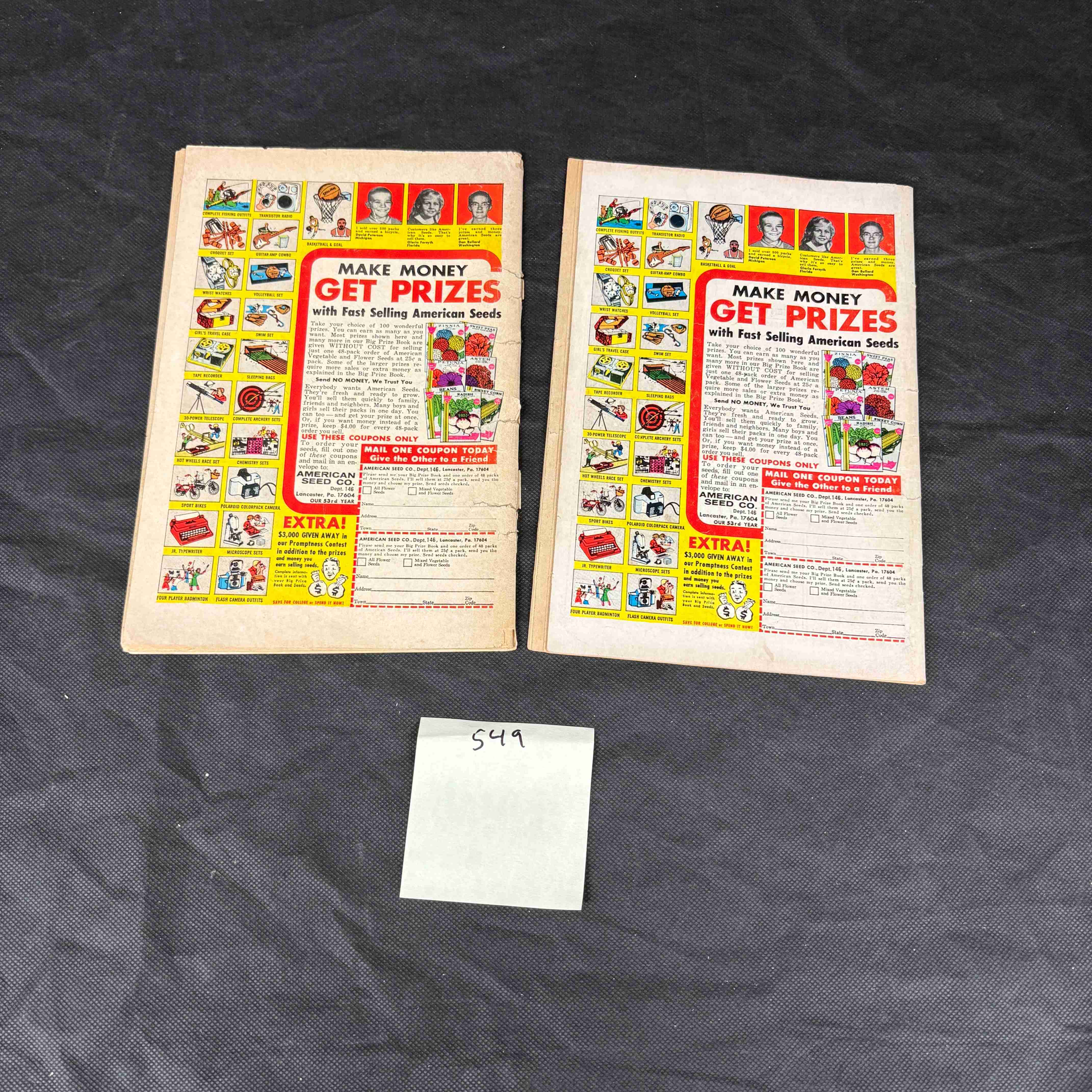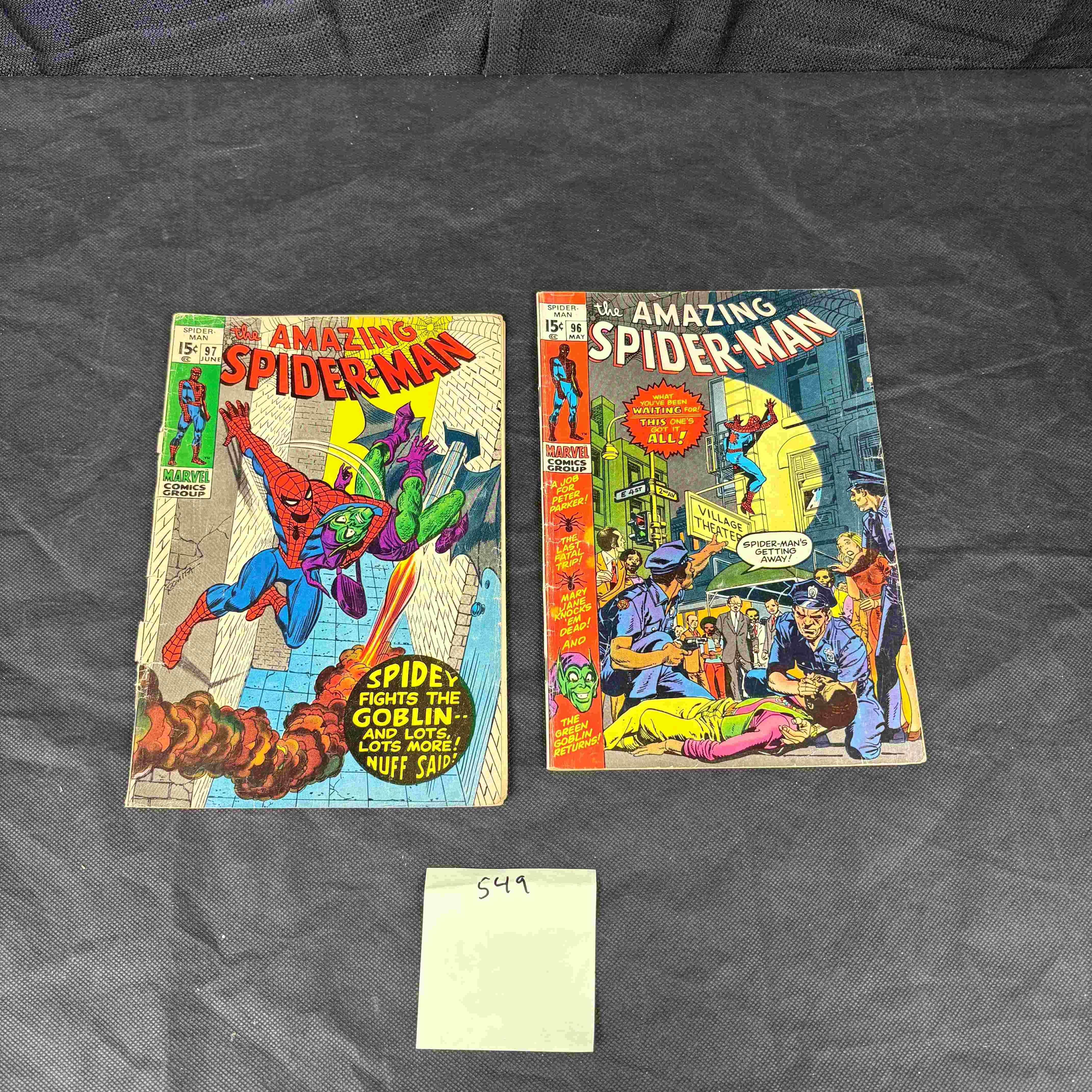 Two vintage Marvel Comics Group ‘The Amazing Spider-Man’ comic books, issues #96 and #97, published in 1971. Issue #96 is famously known as the ‘Drug Issue,’ published without Comics Code Authority approval, featuring Spider-Man above a street scene with police and protesters, with text such as “THE ASTOUNDING ISSUE THAT WILL SHOCK YOU ALL!” and “MARVEL COMICS GROUP IS INTO TOPICALITY!”. Issue #97 depicts Spider-Man battling the Green Goblin, with the tagline “SPIDEY FIGHTS THE GOBLIN– AND LOTS, LOTS MORE! NUFF SAID!”. Both comics feature the classic Bronze Age superhero art style and the characteristic 15¢ price point. The back covers of both display the iconic “MAKE MONEY GET PRIZES with Fast Selling American Seeds” advertisement, with the coupons appearing to be intact. Printed on paper. A separate label marked “549” is also visible.
