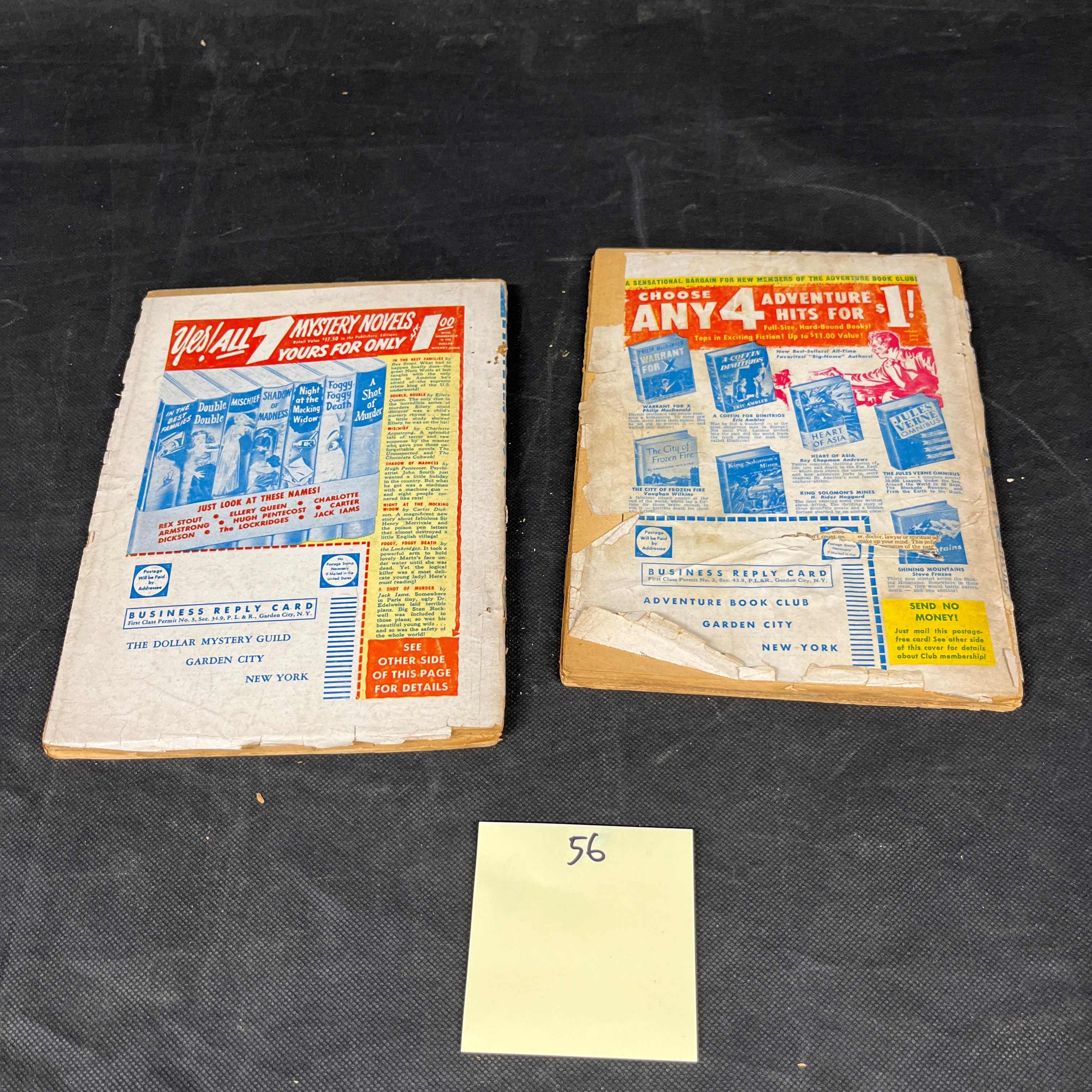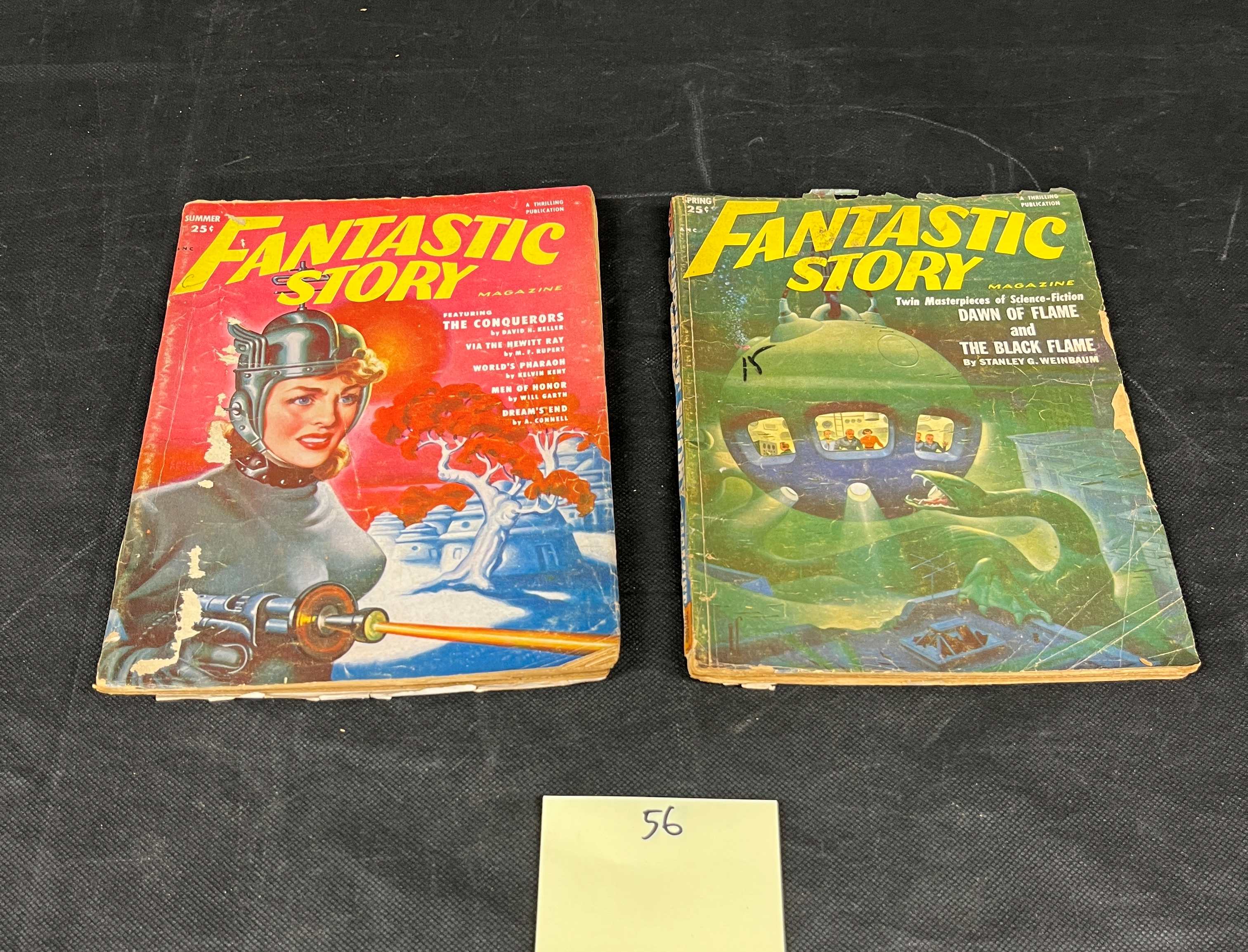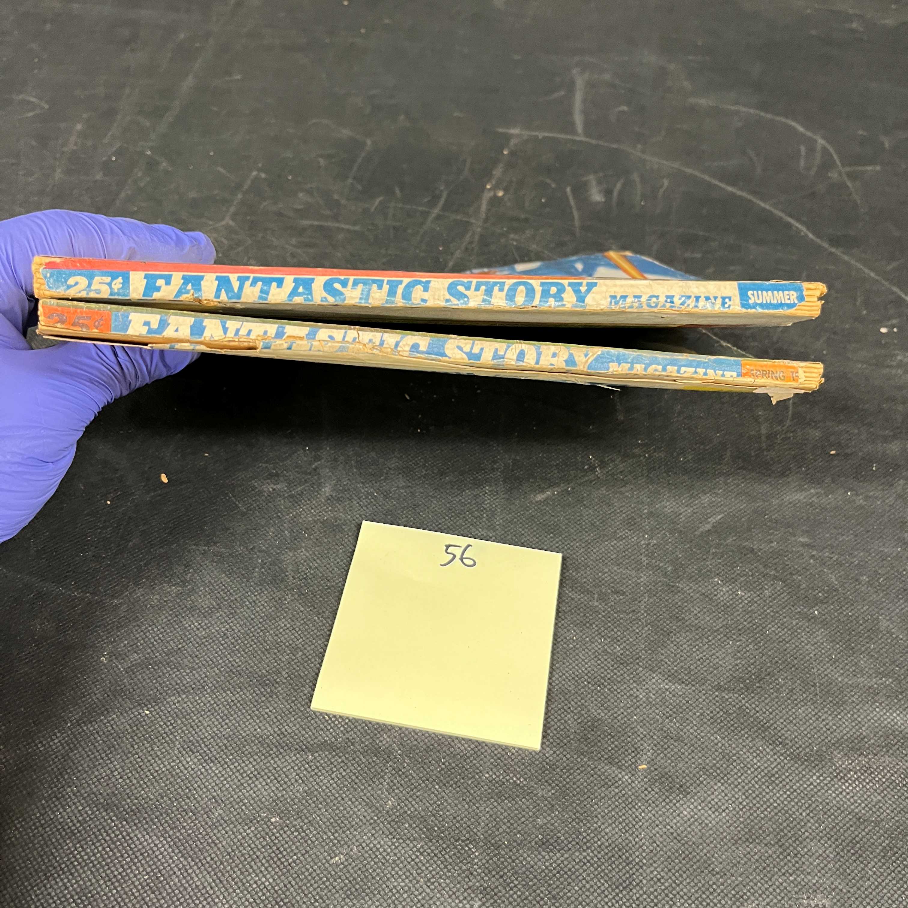 A pair of vintage ‘Fantastic Story Magazine’ pulp magazines, comprising the Spring 1951 and Summer 1951 issues. Each magazine is priced at 25¢. The Summer 1951 issue features a cover illustration of a woman in a futuristic helmet and suit holding a raygun, advertising stories such as “THE CONQUERORS” and “ADAM’S END.” The Spring 1951 issue displays a cover with a large green, multi-eyed creature emerging from water with a futuristic cityscape, promoting “DAWN OF FLAME” and “THE BLACK FLAME.” The backs of both magazines show advertisements for mystery novels and an adventure book club, along with business reply cards. Constructed from paper.