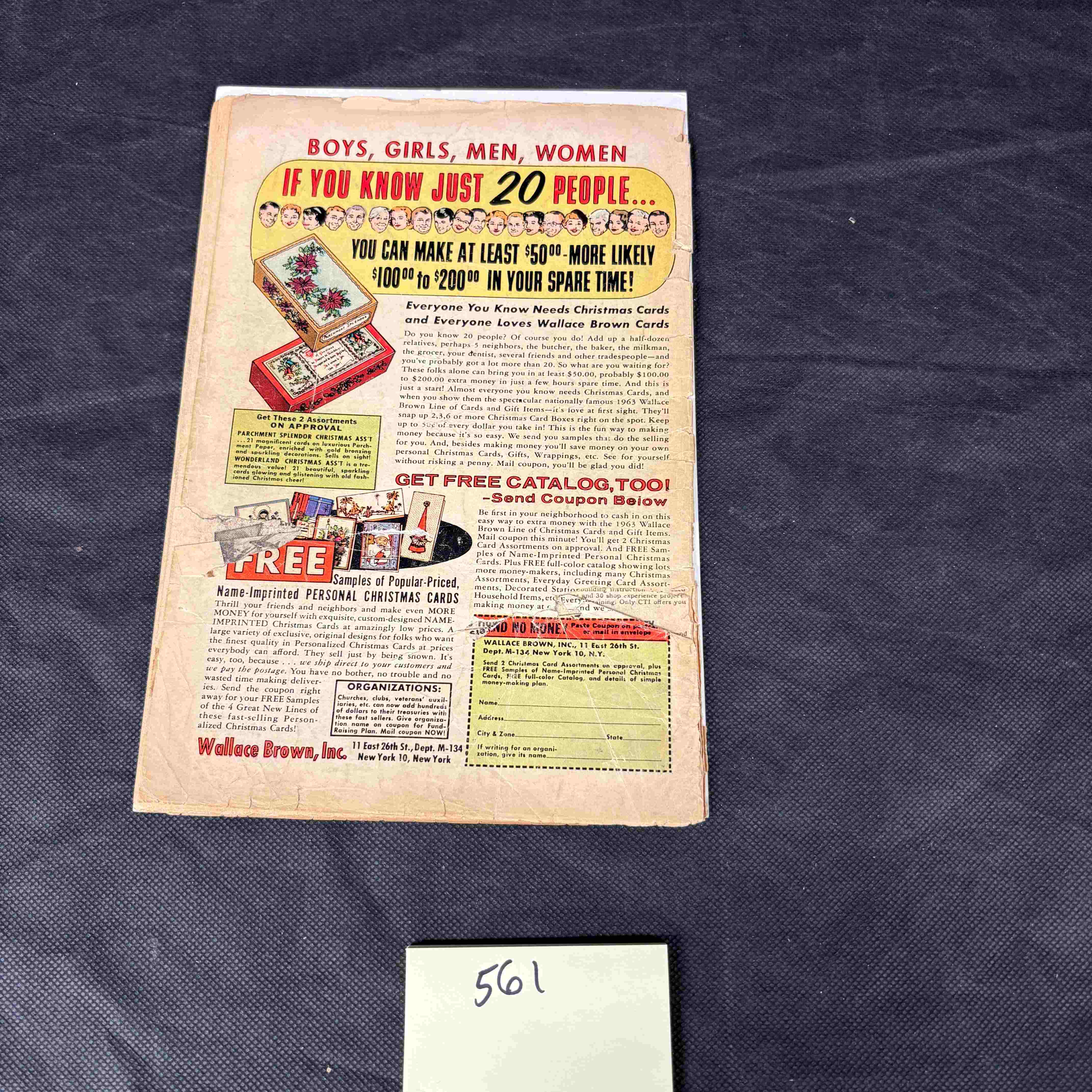 An original Marvel Comics, Fantastic Four #18, dated September and originally priced at 12¢. This issue features the first appearance of the villain Super-Skrull. The front cover depicts the Fantastic Four battling “The All-Powerful Super-Skrull!” above the tagline “THE WORLD’S GREATEST COMIC MAGAZINE!” The reverse side features a full-page advertisement for Wallace Brown, Inc., marketing Christmas cards with prominent text including “BOYS, GIRLS, MEN, WOMEN, IF YOU KNOW JUST 20 PEOPLE… YOU CAN MAKE AT LEAST $50.00 MORE LIKELY $100.00 TO $200.00 IN YOUR SPARE TIME!” Constructed from paper. A white sticker bearing the handwritten number “561” is present at the bottom of the visual field, independent of the comic itself.