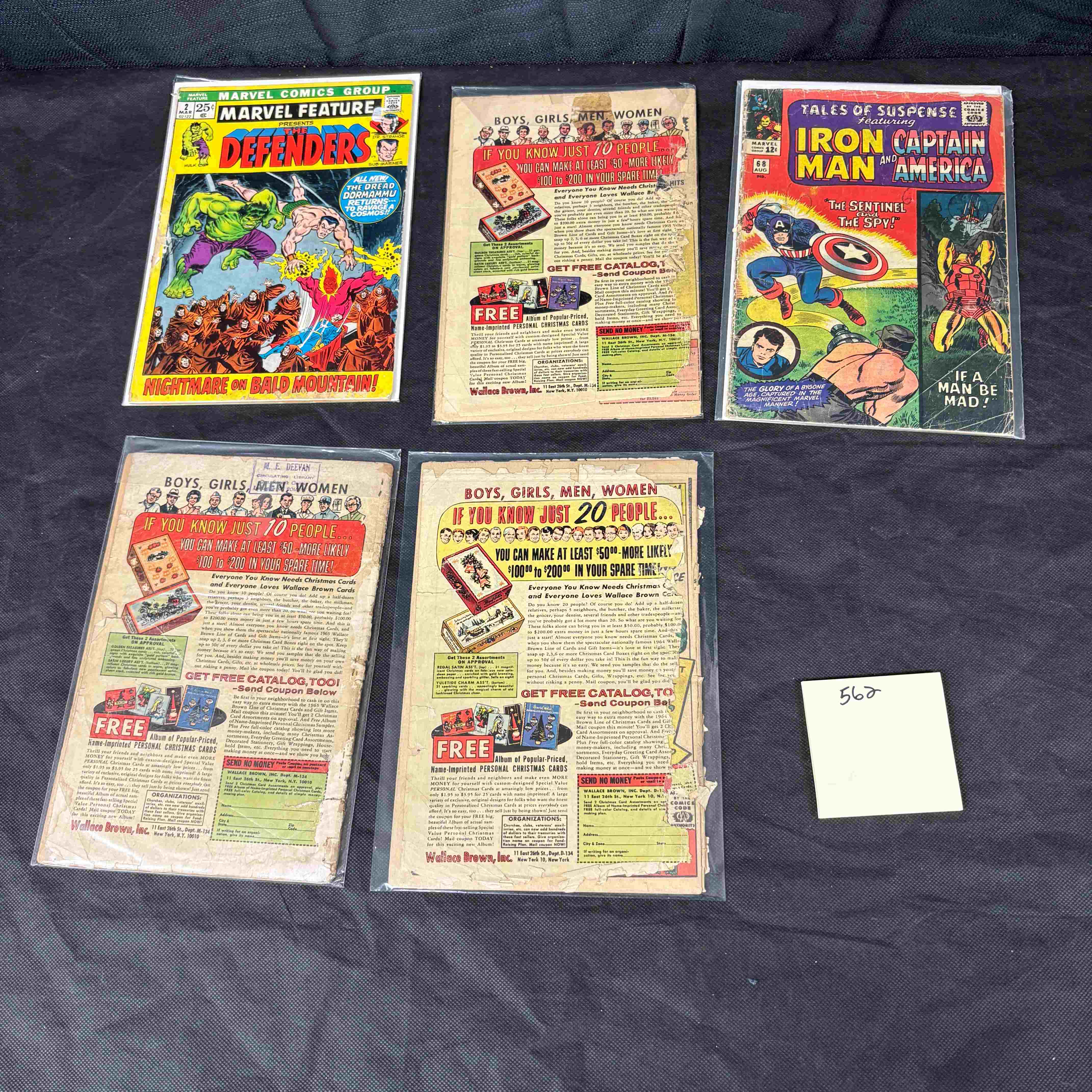 This lot features five individually bagged vintage Marvel comic books from the Silver Age of comics (1960s-early 1970s). The collection includes *Marvel Feature Defenders #1*, *Strange Tales #150* (featuring Doctor Strange and Nick Fury), *Tales of Suspense #83* and *#84* (featuring Iron Man and Captain America), and *Tales to Astonish #72* (featuring the Incredible Hulk and Giant-Man). Each comic has a 12¢ cover price, is printed on paper, and encased in a clear plastic sleeve. The back covers display period advertisements, such as for “Wallace Brown, Inc.” Christmas cards. A separate white slip with inventory number ‘562’ is also present.