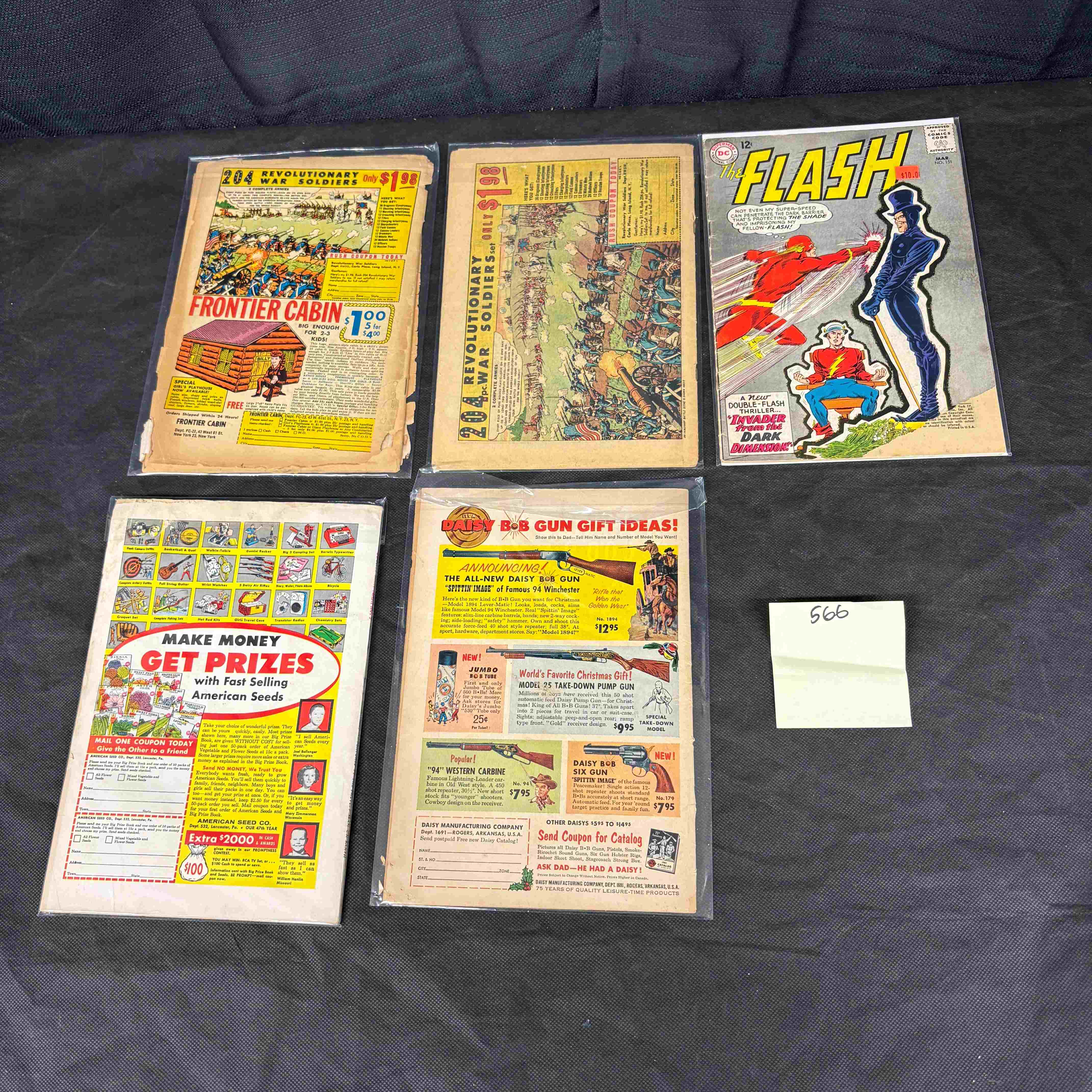 A group of five Silver Age DC Comics ‘The Flash’ comic books, from the 1959-1985 series. The lot includes issues #143, #145, #147, #149, and one 80c GIANT COLLECTOR’S SPECIAL prominently featuring the ‘Flash of Two Worlds!’ storyline. Each comic features classic superhero art style and is identifiable by its 12c or 80c cover price. They are made of printed paper and are housed within clear protective plastic bags. The back covers display typical period advertisements for items such as ‘204 REVOLUTIONARY WAR SOLDIERS,’ a mail-order ‘FRONTIER CABIN,’ opportunities to ‘MAKE MONEY GET PRIZES with Selling American Seeds,’ and ‘DAISY B.B GUN IDEAS!’. A white sticker marked ‘566’ is also present, likely an inventory or lot number.