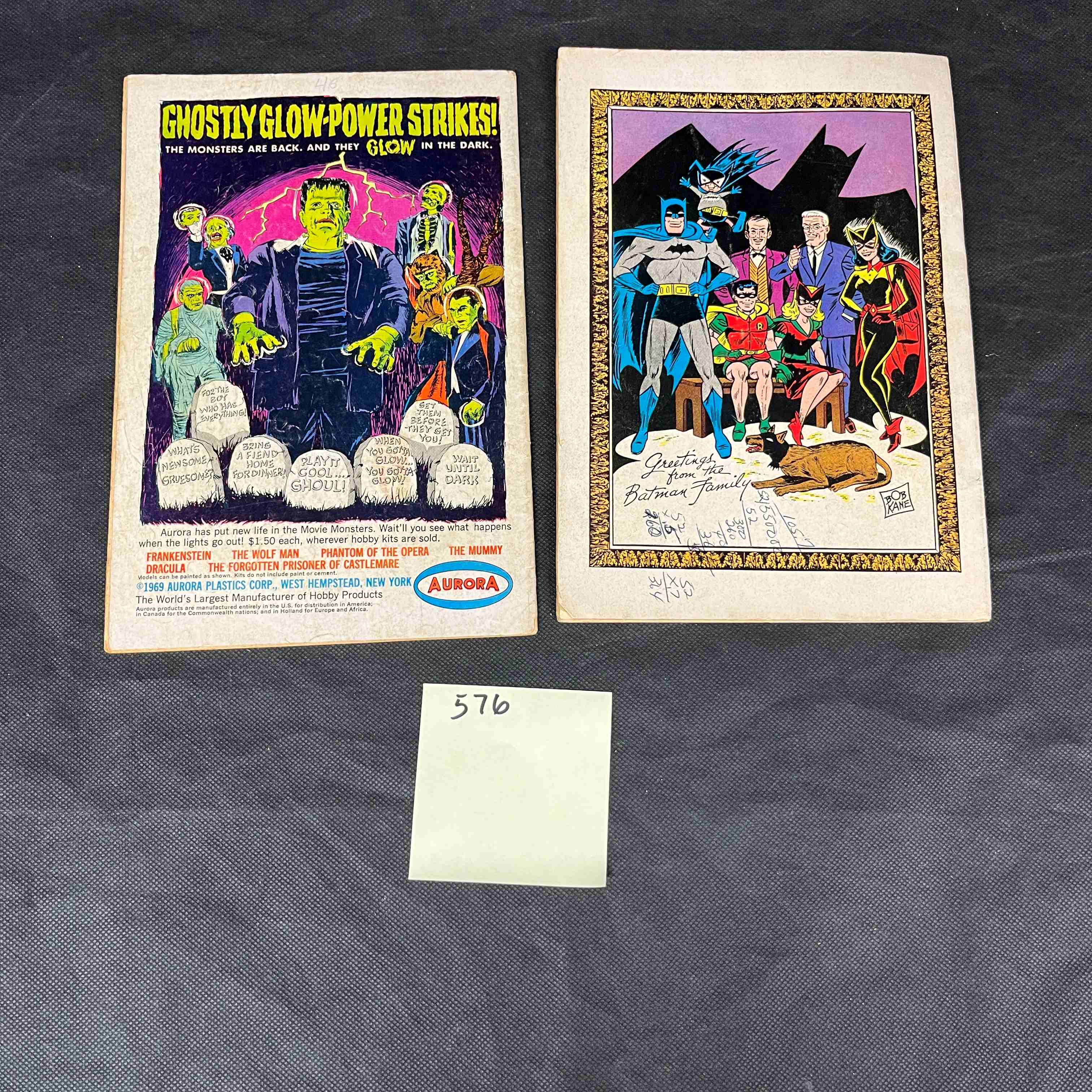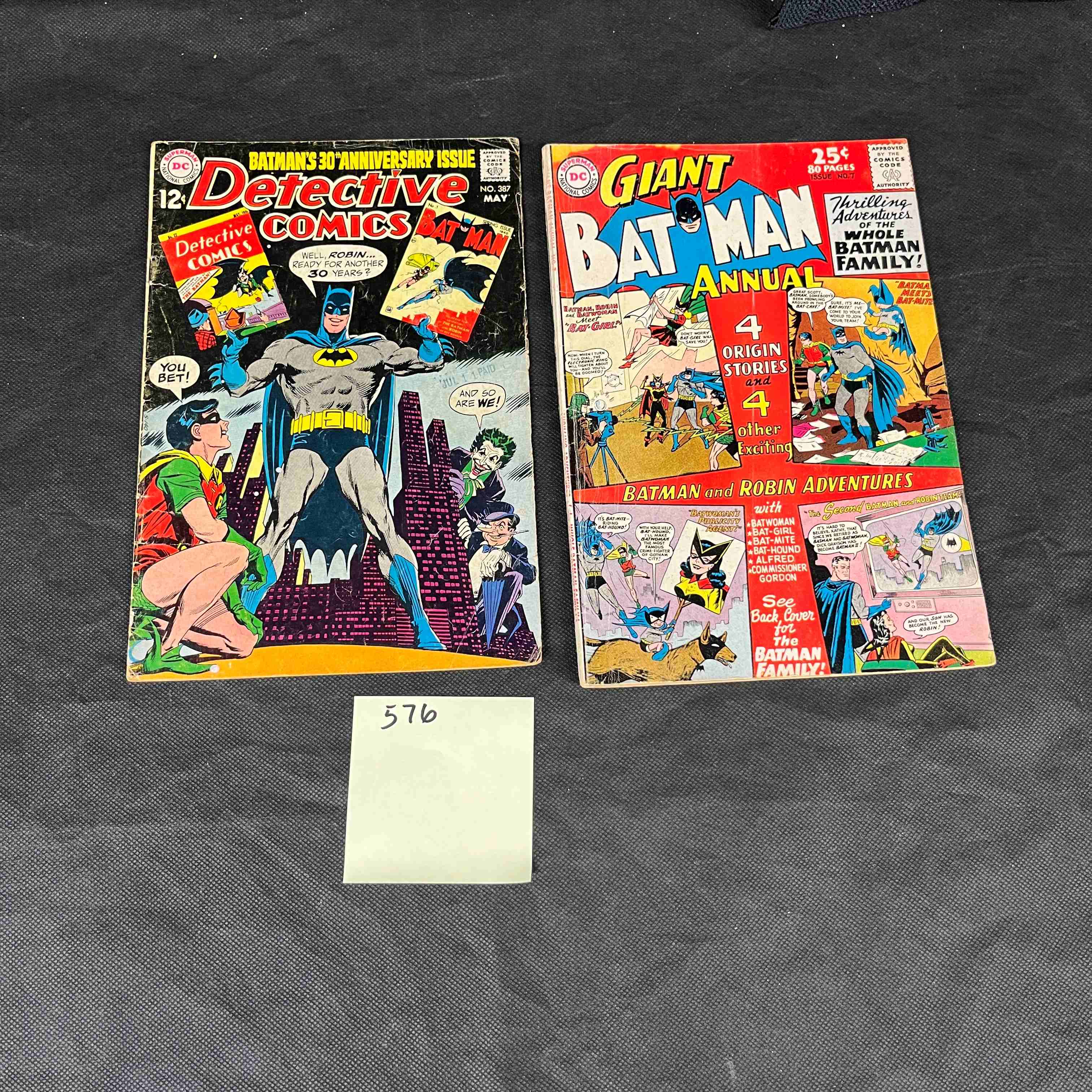 A lot comprising two mid-to-late 20th-century American superhero comic books, both published by DC and printed on paper. The first is “Batman’s 30th Anniversary Issue Detective Comics” No. 386, priced at 12¢, featuring Batman, Robin, and various villains on its front cover. Its reverse displays an advertisement for Aurora glow-in-the-dark monster model kits. The second item is a “Giant Batman Annual,” priced at 25¢ with “80 Pages” indicated on its front cover, which showcases multiple Batman characters and references “4 Origin Stories.” The back cover of this annual features an illustration titled “Greetings from the Batman Family!” with a visible signature of “BOB KANE.” A yellow sticky note marked “576” is also present beneath the items.