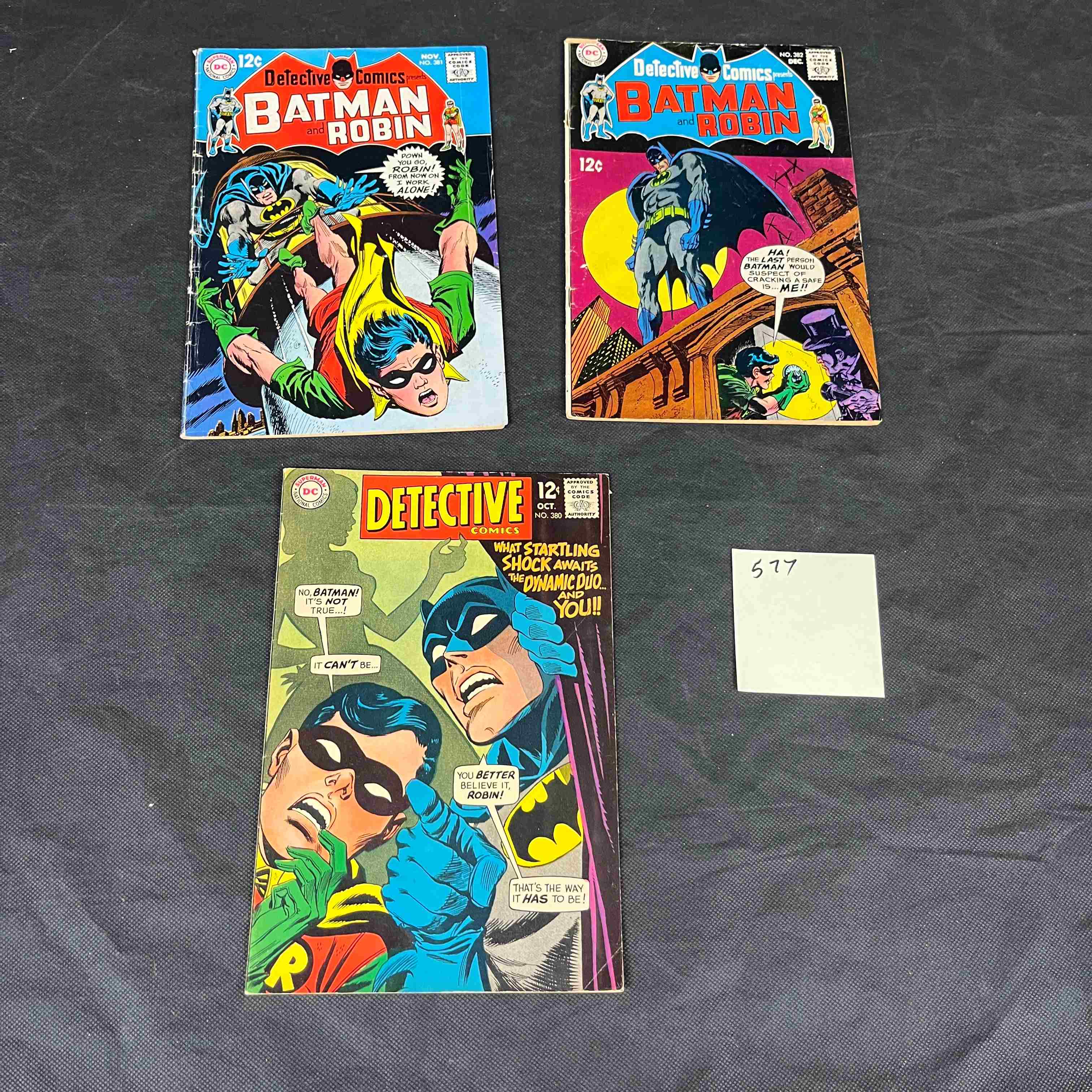 A group of three vintage American comic books from the ‘DETECTIVE COMICS’ series, published by DC Comics, featuring Batman and Robin. The lot includes: