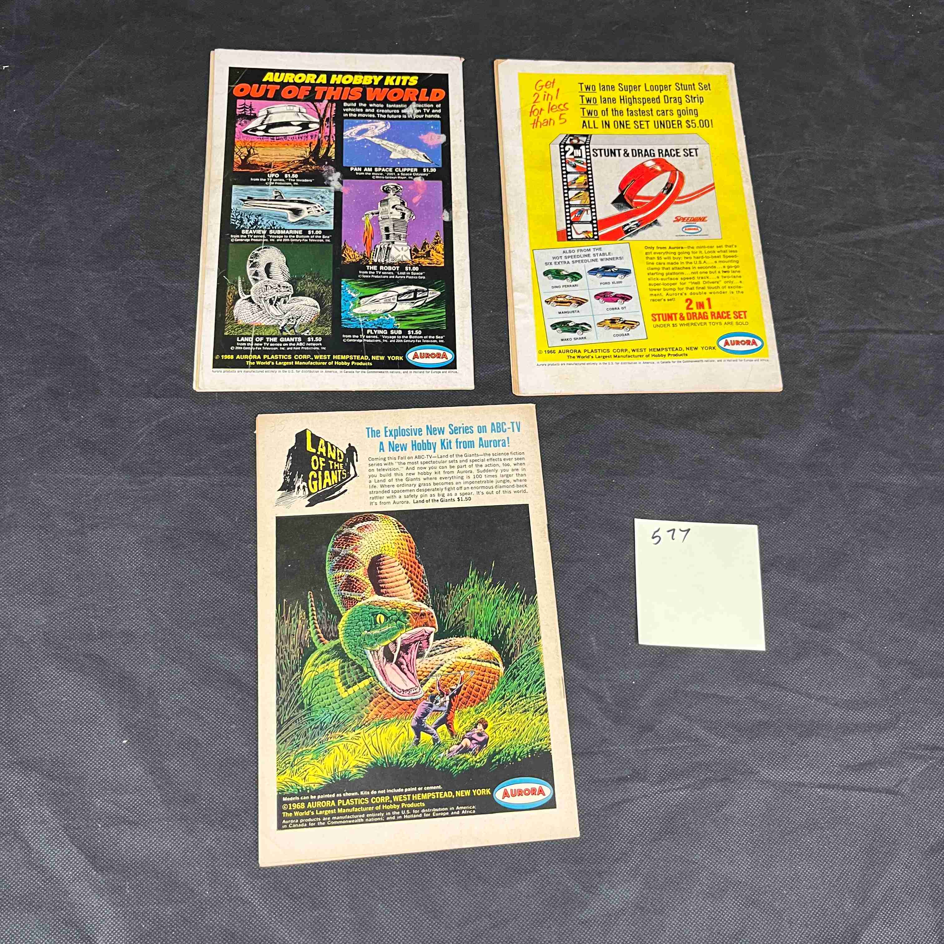 Each comic is priced at 12 cents. The reverse sides of two visible comics display full-page advertisements for Aurora Hobby Kits, including ‘Out of this World’ and ‘Land of the Giants’ kits, as well as a ‘Super Looper Stunt Set / Stunt & Drag Race Set, ‘ with one ad showing a 1968 copyright date for Aurora Plastics Corp.