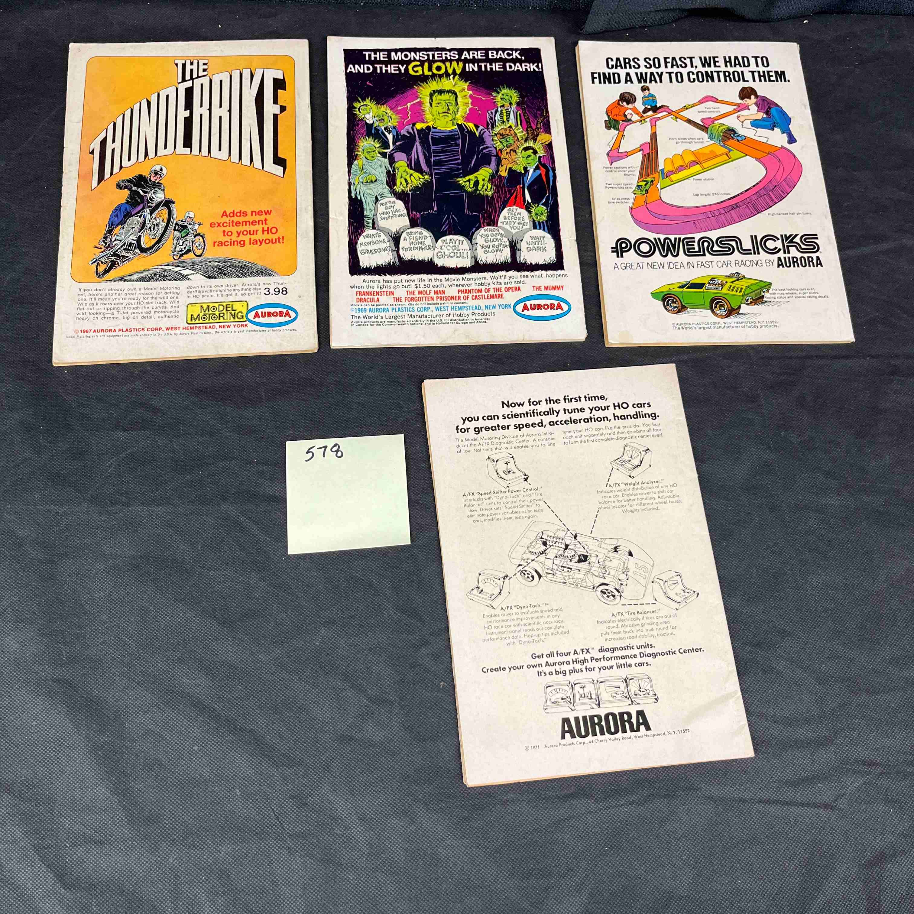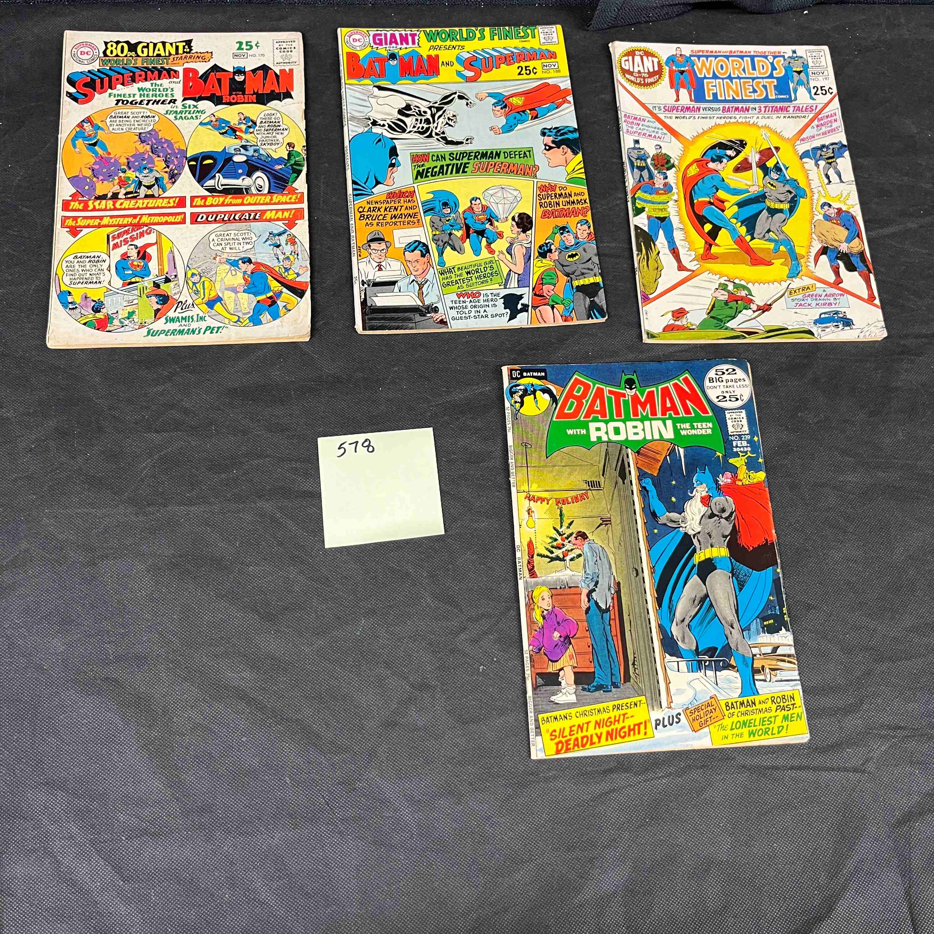 A group of 4 Silver Age DC comic books, predominantly featuring Superman and Batman, prominently including *World’s Finest Comics #188* (DC Comics, 1969). The collection includes three issues from the “80 Page Giant” or “World’s Finest Comics” series, priced at 25 cents, and one “Batman with Robin The Teen Wonder” issue, priced at 12 cents, indicating a publication span likely from the mid-1960s to early 1970s. Visible titles include “Superman Batman, ” “World’s Finest, ” “The Man Who Defeat Negative Superman!, ” and “The Silent Night Deadly Night!” The reverse sides feature period advertisements for Aurora model kits, including “The Thunderbike, ” “Glow in the Dark” Universal Monsters, and “Powerslicks” HO slot cars, with copyright dates ranging from 1967 to 1971. A yellow sticky note bearing the number “578” is adhered to two of the comics.