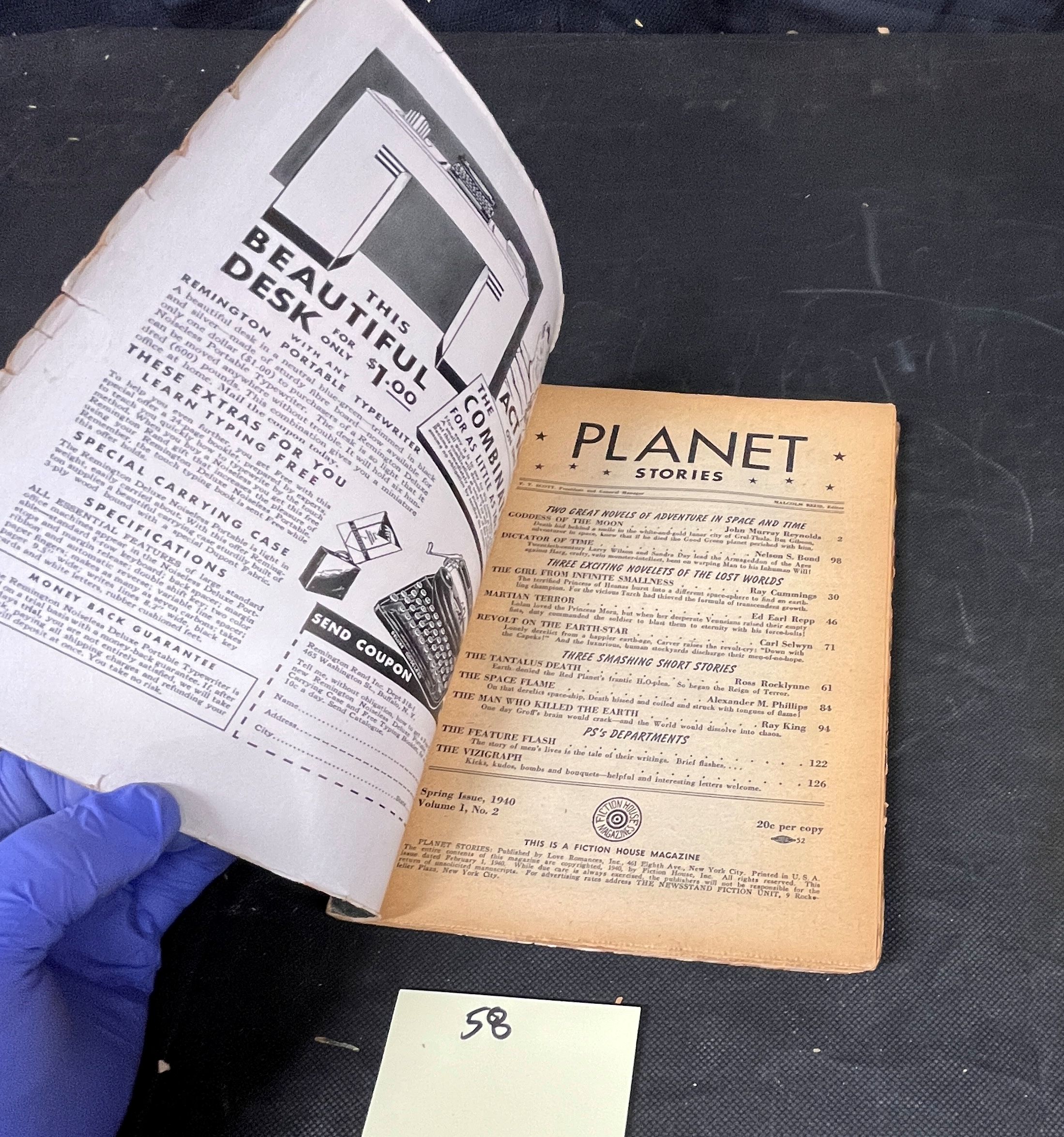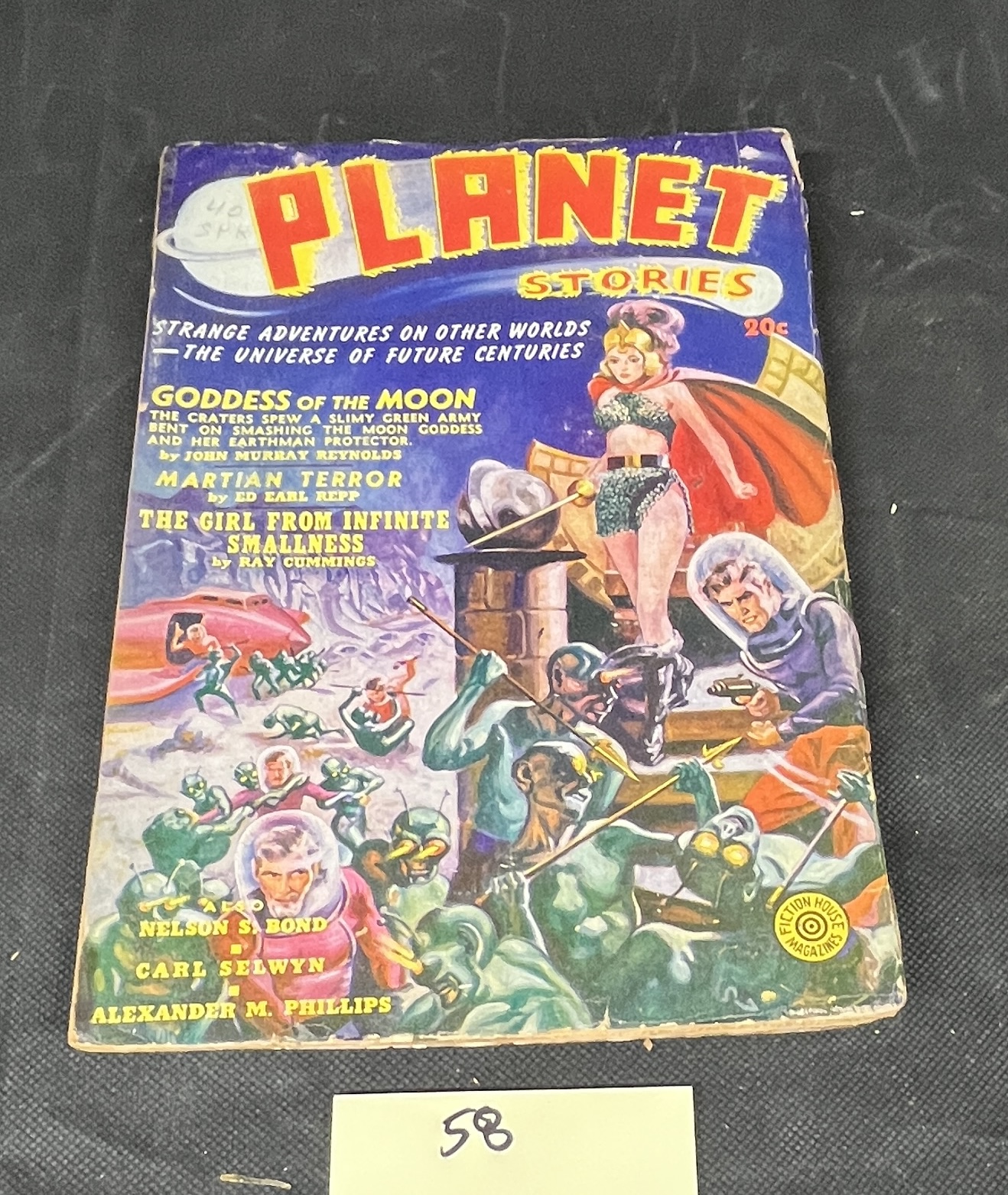 An American pulp science fiction magazine, “PLANET STORIES,” identified as the Spring Issue, 1940, Volume 1, No. 2, with an original price of 20 cents. The front cover features vibrant, classic Golden Age sci-fi artwork depicting a female warrior, astronauts, and alien creatures. Prominent story titles include “GODDESS OF THE MOON” and “THE GIRL FROM INFINITE SMALLNESS,” with authors such as John Murray Reynolds and Ray Cummings. A handwritten “40 SHM” is visible on the upper left corner of the front cover. The back cover displays a full-page color advertisement for Chesterfield Cigarettes, featuring a woman holding a cigarette pack and the slogan “A pack o’ pleasure,” copyrighted 1937 by Liggett & Myers Tobacco Co. Constructed from paper.