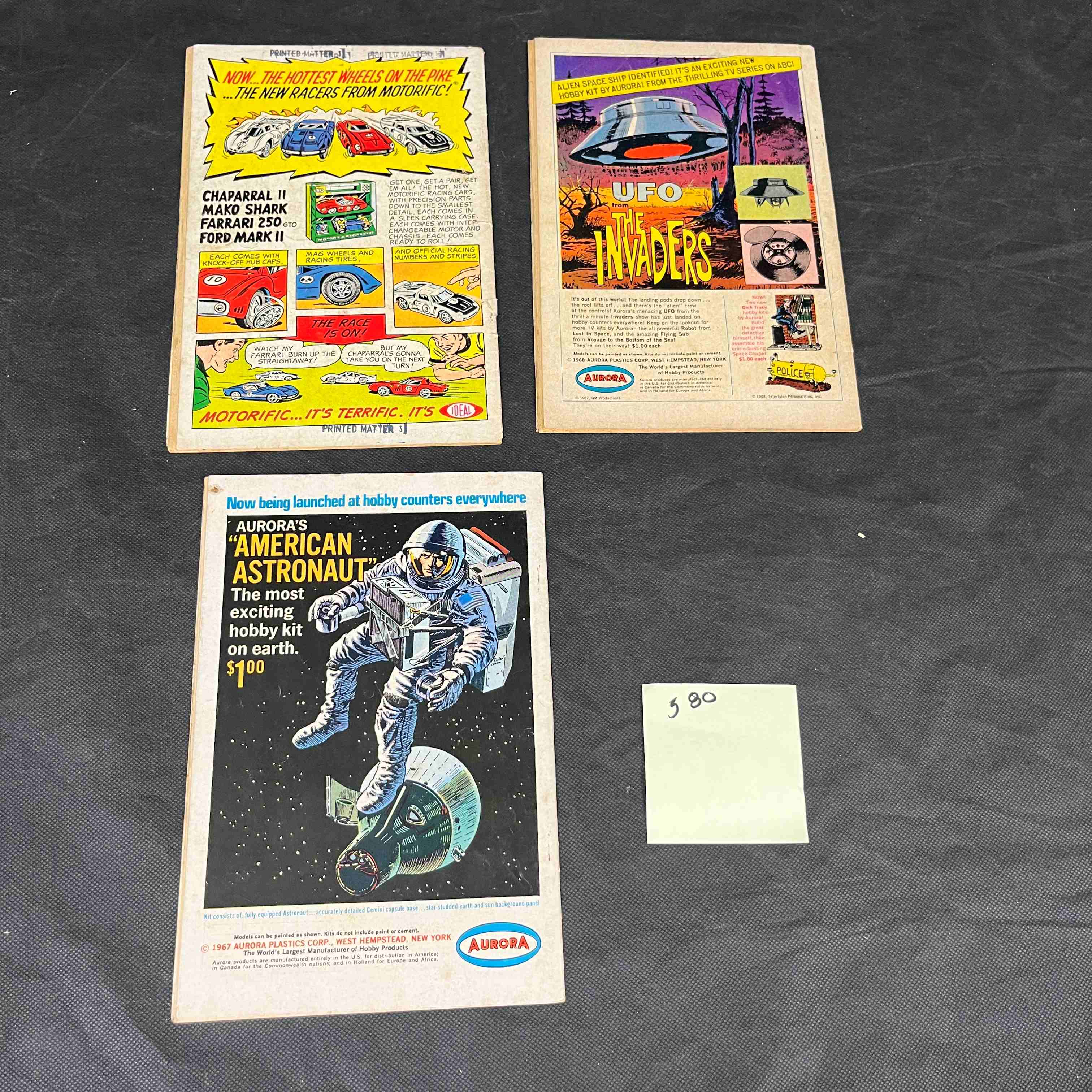 A group of three vintage advertisements for Aurora plastic model hobby kits, dating from the late 1960s. Each is composed of printed paper/newsprint. Two advertisements bear a visible copyright of “© 1968,” while the third is dated “© 1967.” One advertisement promotes “Motorific” racing cars, featuring models such as “CHAPARRAL II,” “MAKO SHARK,” “FARRARI 250 GTO,” and “FORD MARK II.” Another advertises a “UFO from THE INVADERS” kit, explicitly stating its origin “FROM THE THRILLING TV SERIES ON ABC!” The third highlights “AURORA’S ‘AMERICAN ASTRONAUT'” kit. All advertised kits are priced at “$1.00.” The text “PRINTED MATTER” is partially visible on one of the ads, indicating its original format. Included with the advertisements is a small, plain white paper slip with “580” handwritten in black ink.