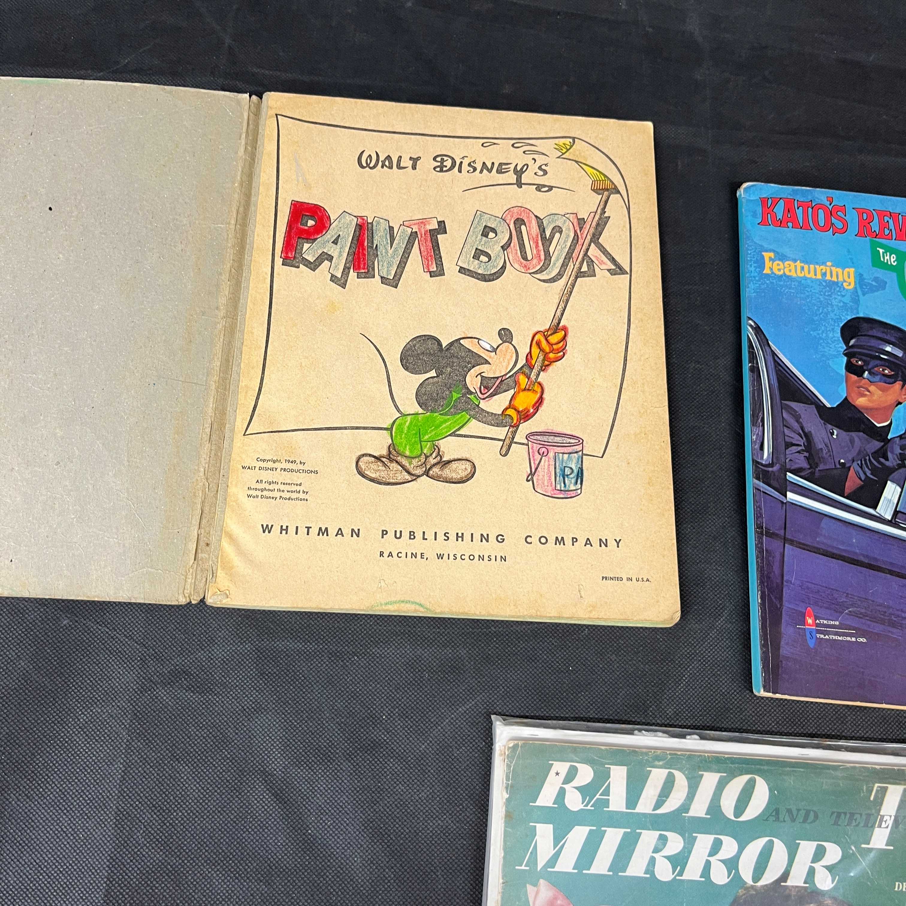 A group of three vintage paper publications. The lot features a 1966 “KATO’S REVENGE Featuring The GREEN HORNET COLORING BOOK,” published by Whitman/Western Publishing Company. Also included is a 1941 “WALT DISNEY’S Paint Book” featuring Mickey Mouse, published by Whitman Publishing Company. Completing the lot is a December issue of “RADIO AND TELEVISION MIRROR” magazine, protected in a clear plastic sleeve, featuring a portrait of a woman and articles such as “GODFREY’S GIRL JANETTE.” This magazine’s cover bears handwritten notations “1941” and “1949.” A small yellow sticky note with the number “59” is also present. All items display characteristics consistent with mid-20th century paper ephemera.