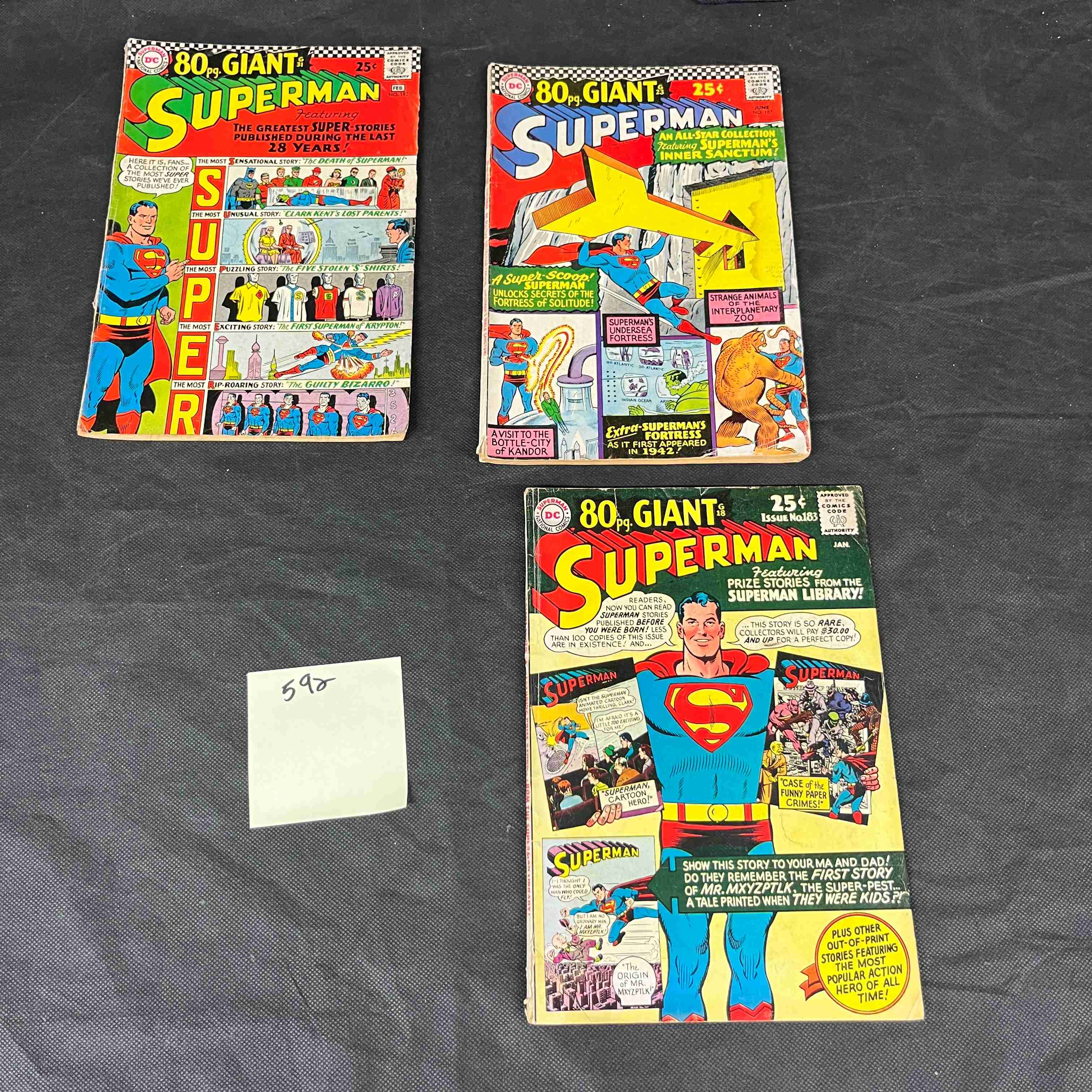 A group of three Silver Age DC Comics Superman 80 Page Giant comic books. Each issue features Superman and displays the classic DC Comics logo with a 25¢ price point. One comic is specifically identified as issue no. 105. The covers showcase typical Silver Age superhero art, with promotional blurbs such as “THE GREATEST SUPER STORIES PUBLISHED IN THE LAST 28 YEARS” and “PRIZE STORIES FROM THE SUPERMAN LIBRARY!”. The reverse sides feature period advertisements, including those for Aurora Model Motoring racing sets and Mattel’s Vac-U-Form.