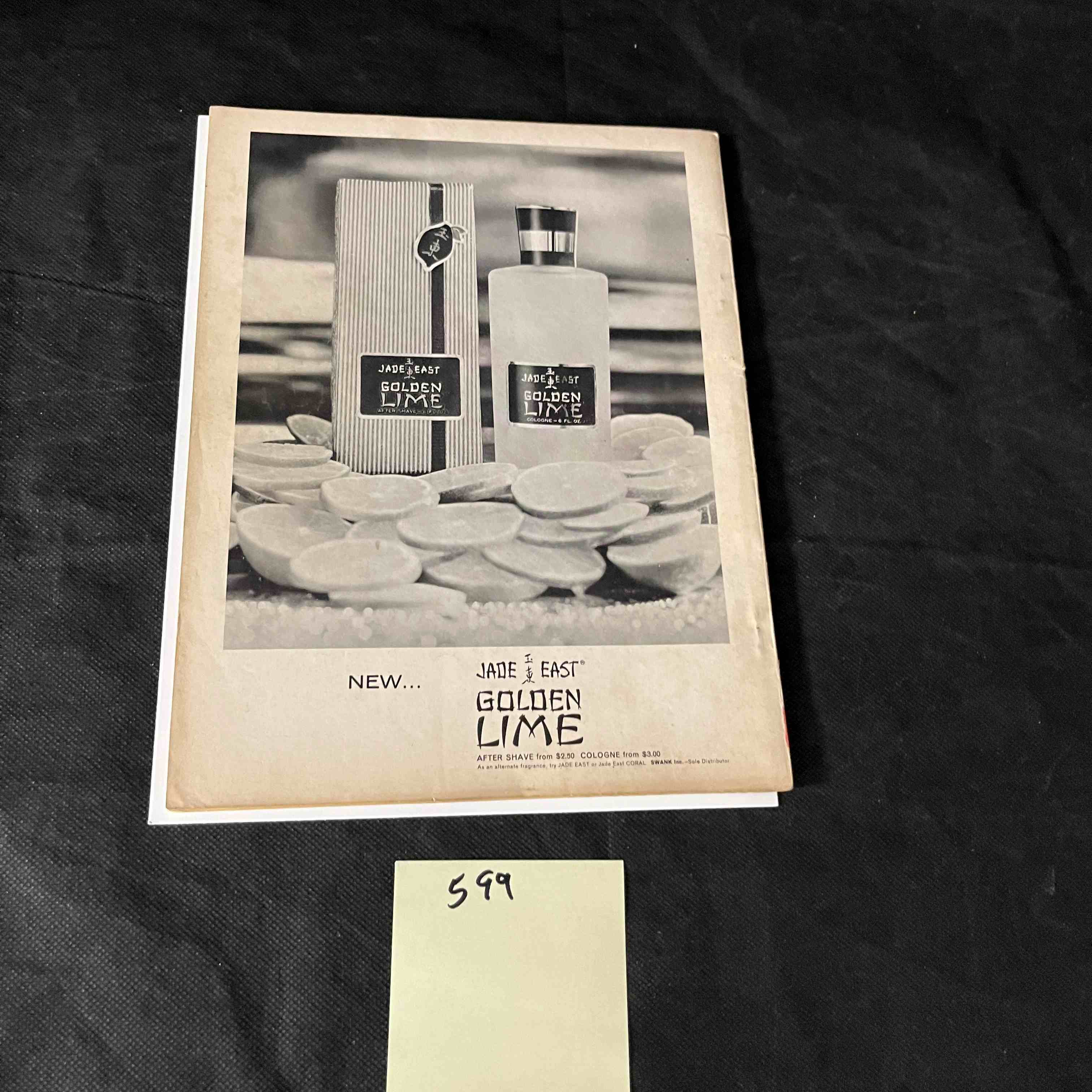 A period paper comic book, “THE SPECTACULAR SPIDER-MAN,” identified as Volume 1, Issue #1 from July 1968, featuring the story “Lo, This Monster!”. The front cover displays classic superhero comic art depicting Spider-Man in a dynamic pose, overlooking a cityscape against a yellow moon-like background. Visible text on the front includes “THE SPECTACULAR SPIDER-MAN,” “10¢,” “JULY,” “LO, THIS MONSTER!,” and “A BOOK-LENGTH SUPER-SPIDEY SPECTACULAR!.” The reverse side features a black and white advertisement for “JADE EAST GOLDEN LIME” after shave and cologne, specifying prices from “$2.50” and “$3.50” respectively, and noting “NEW…” as well as “SWANK Lts. – Sole Distributors.”