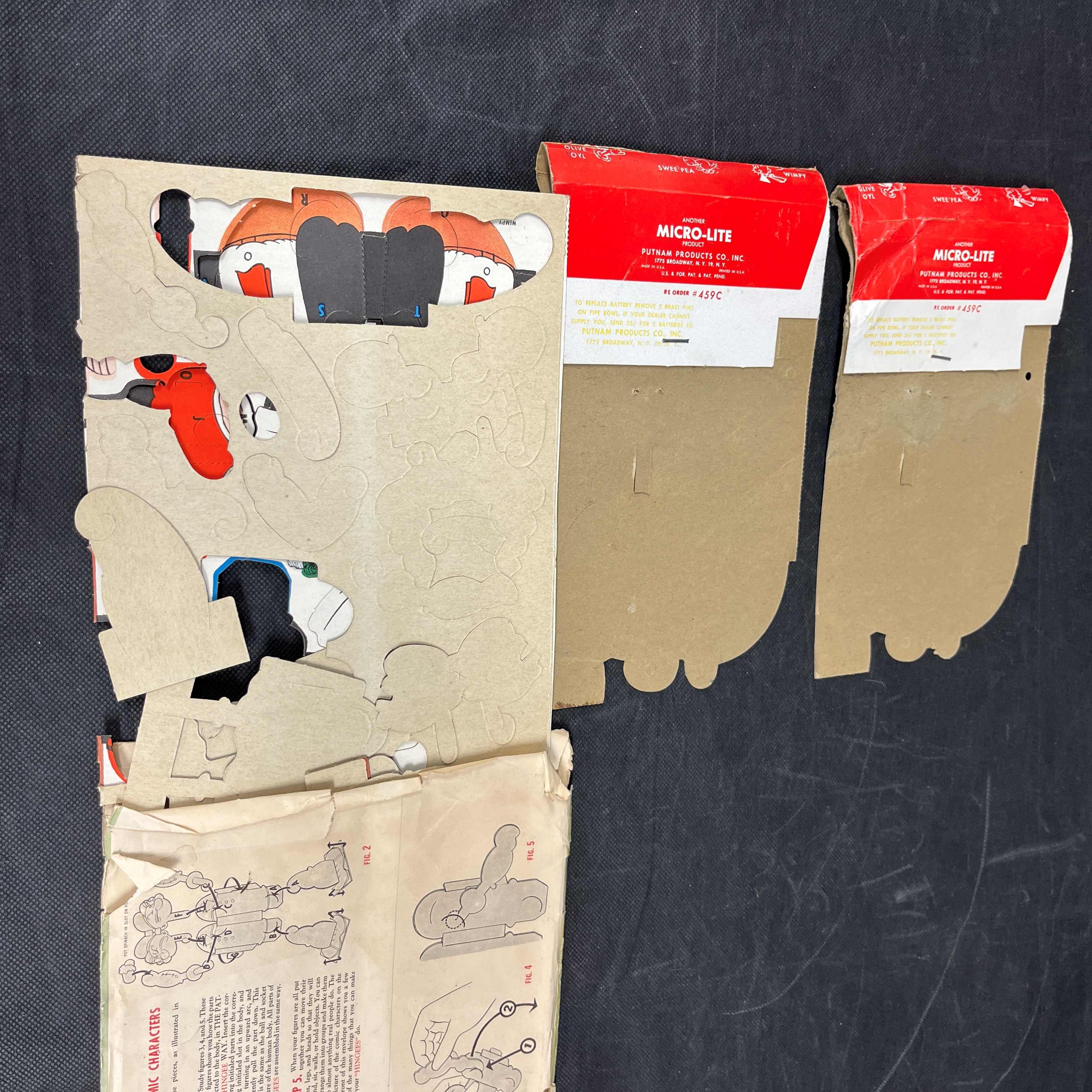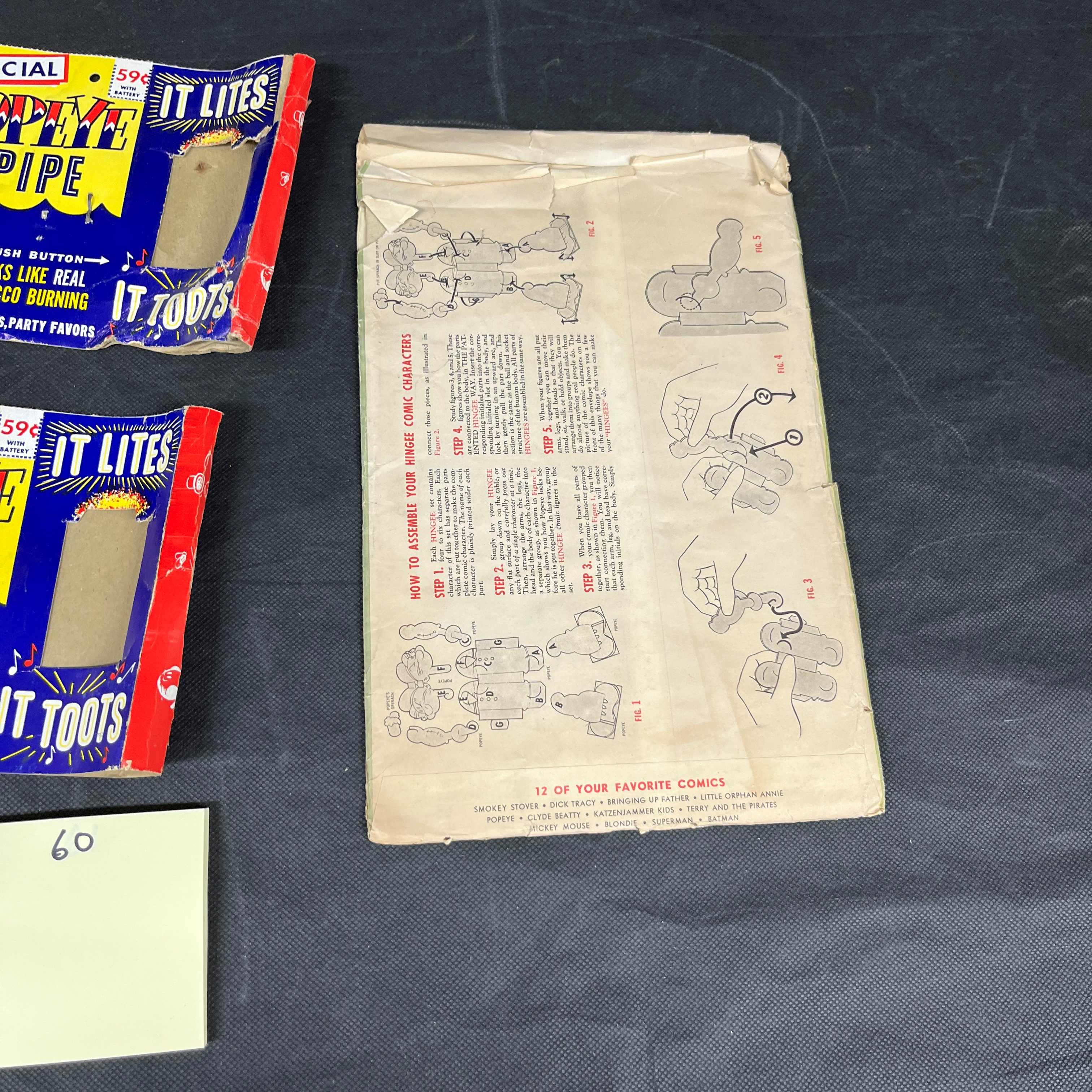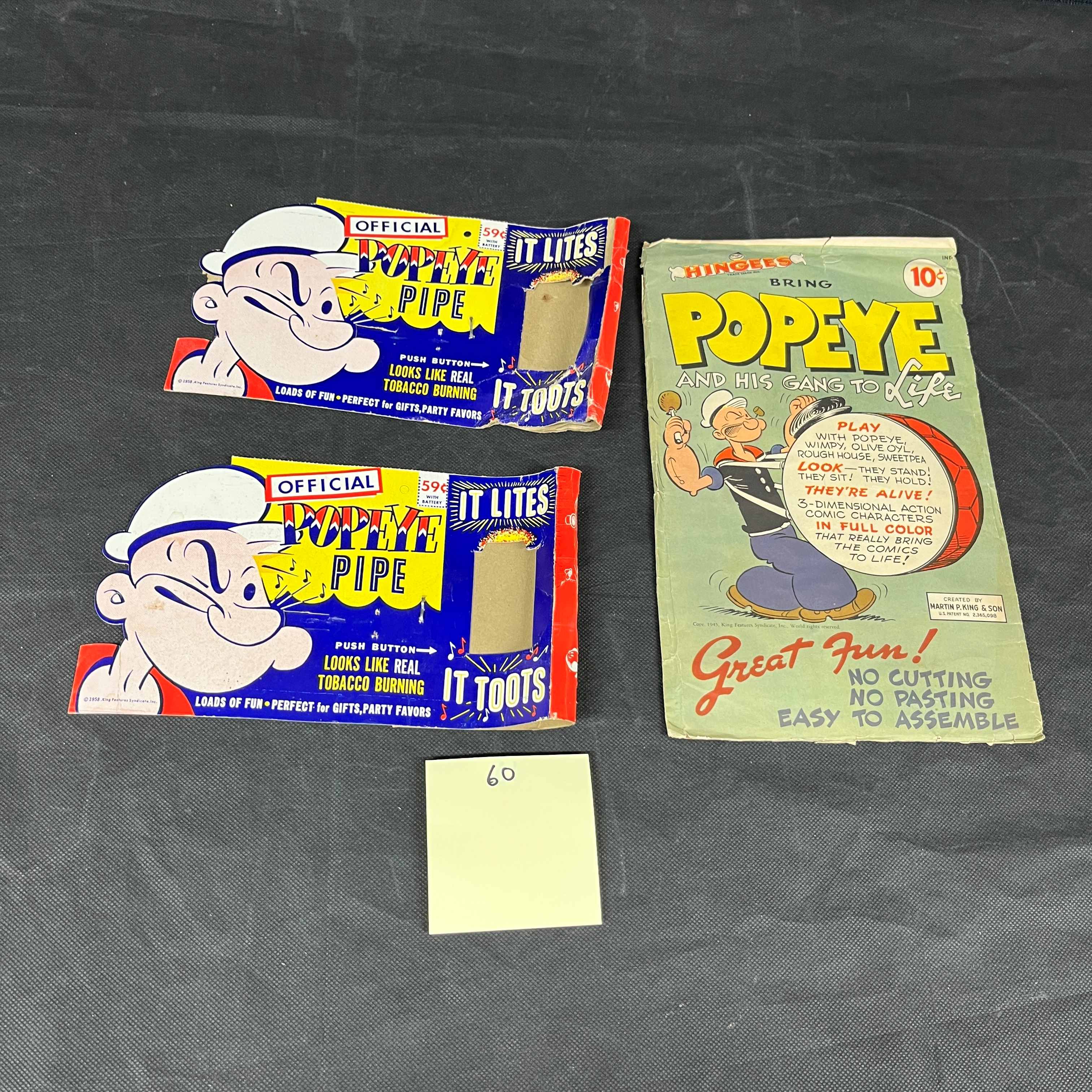 The two \"OFFICIAL POPEYE PIPE\" novelty toys are largely unopened but show creasing and shelf wear to their cardboard packaging. The \"HINGEES BRING POPEYE AND HIS GANG TO LIFE\" paper craft kit is opened, made of discolored and creased cardstock, with some of the character pieces partially or fully punched out.