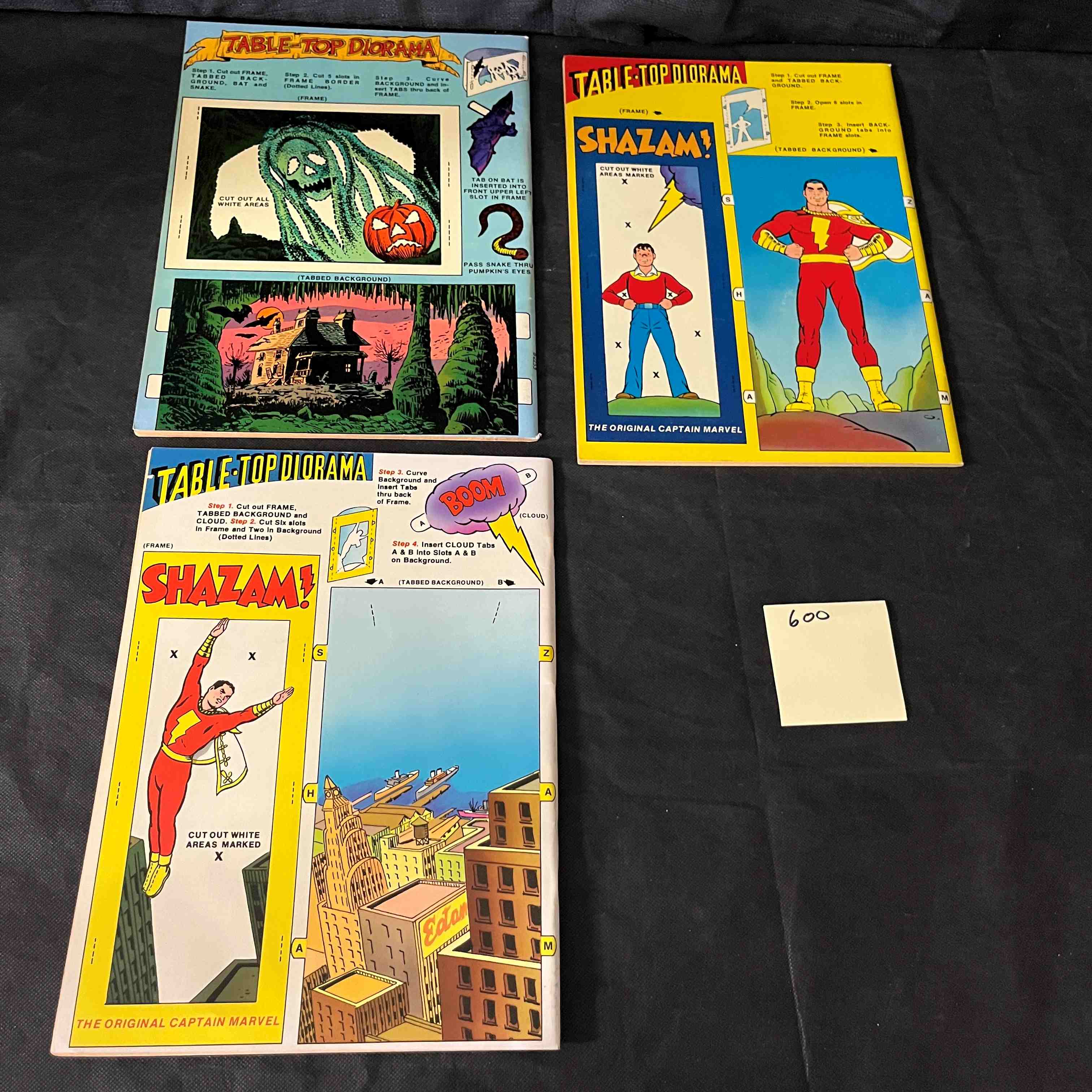 This lot features three vintage DC Comics Limited Collectors’ Edition comic books. It includes two issues from the ‘SHAZAM! WITH ONE MAGIC WORD! THE ORIGINAL CAPTAIN MARVEL’ series and one from the ‘GHOSTS WE CHALLENGE YOU TO READ TRUE TALES OF THE SUPERNATURAL’ series. Each item is characterized by vibrant, classic comic book illustration on paper covers and was originally priced at ‘$1.00’. These ‘King-Size Stories’ issues promised bonus content such as ‘3-D Diorama Cut-Outs,’ ‘Super-Size Pin-Ups,’ ‘Games,’ and ‘Coloring Pages’. Visible interior pages confirm the presence of ‘TABLE-TOP DIORAMA’ elements, which appear to be intact and unused. One ‘SHAZAM!’ issue is marked ‘C.C. BECK 1973’, indicating an early 1970s publication period.