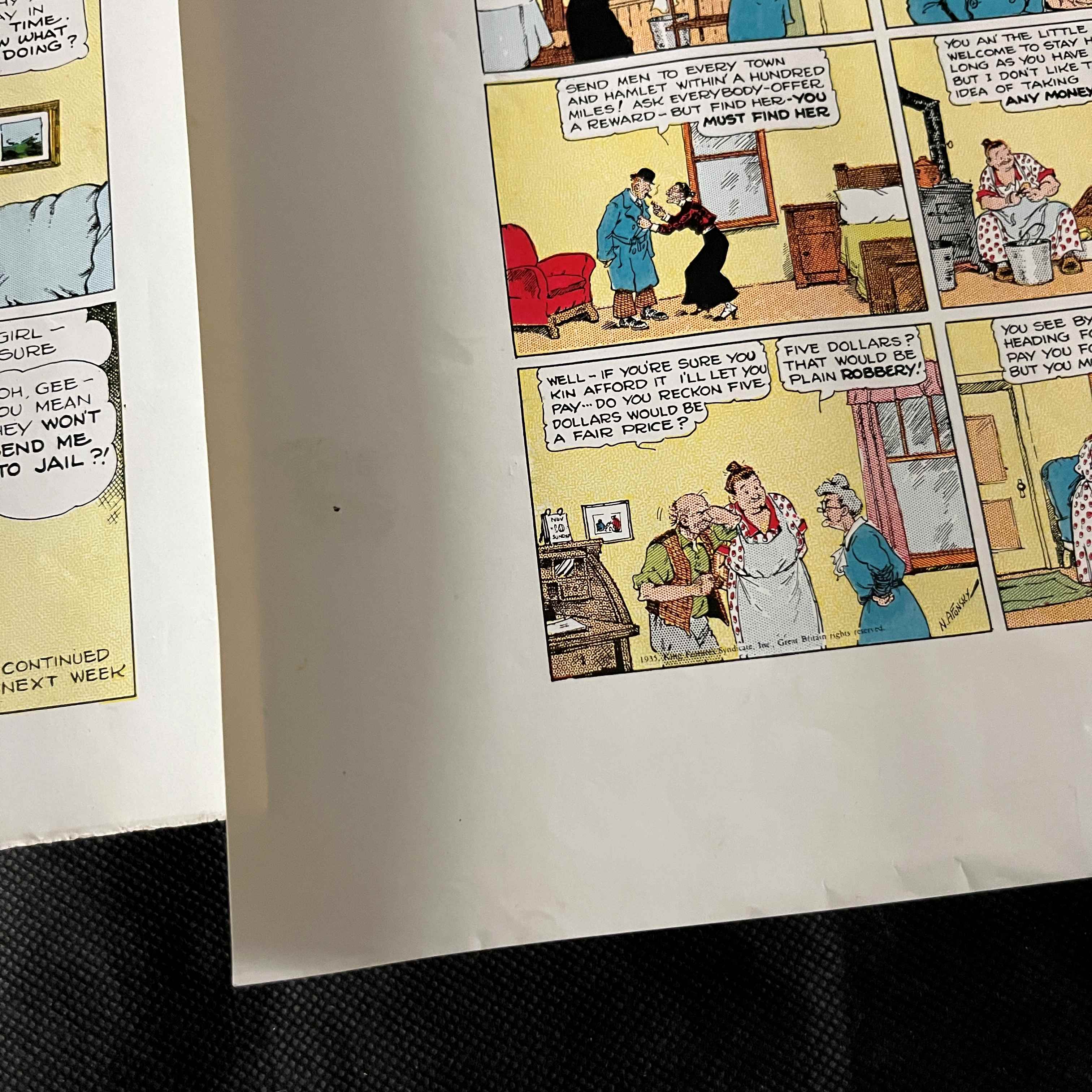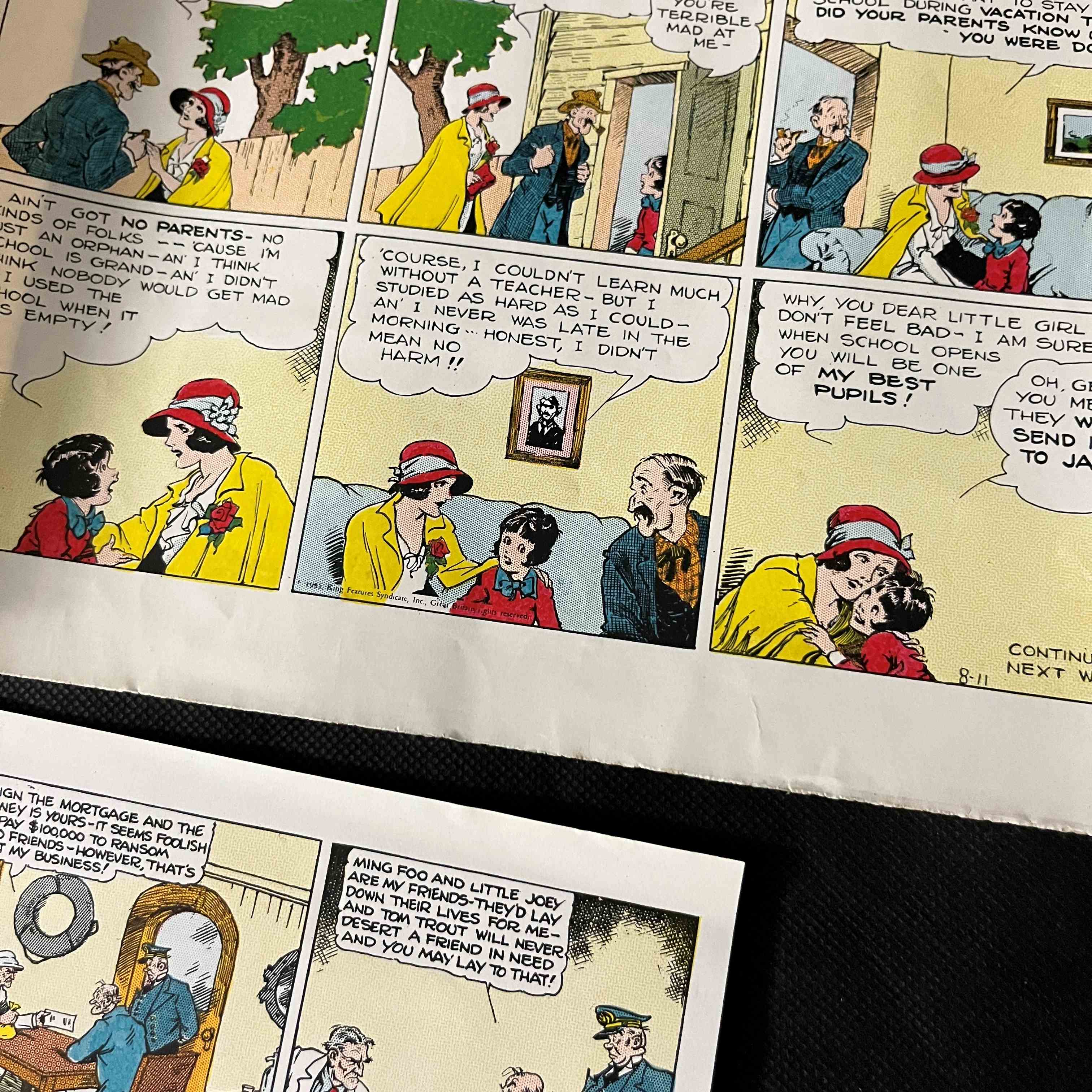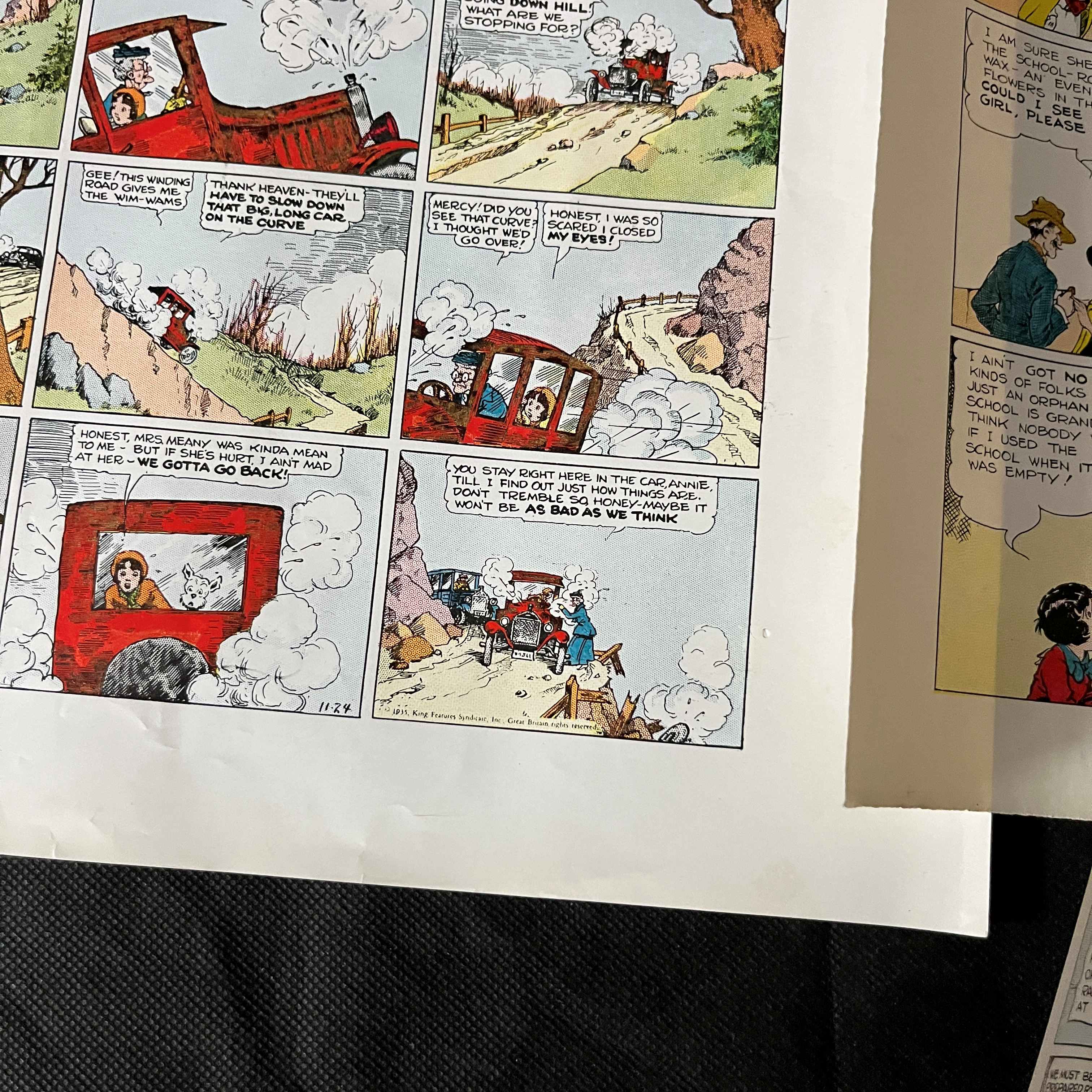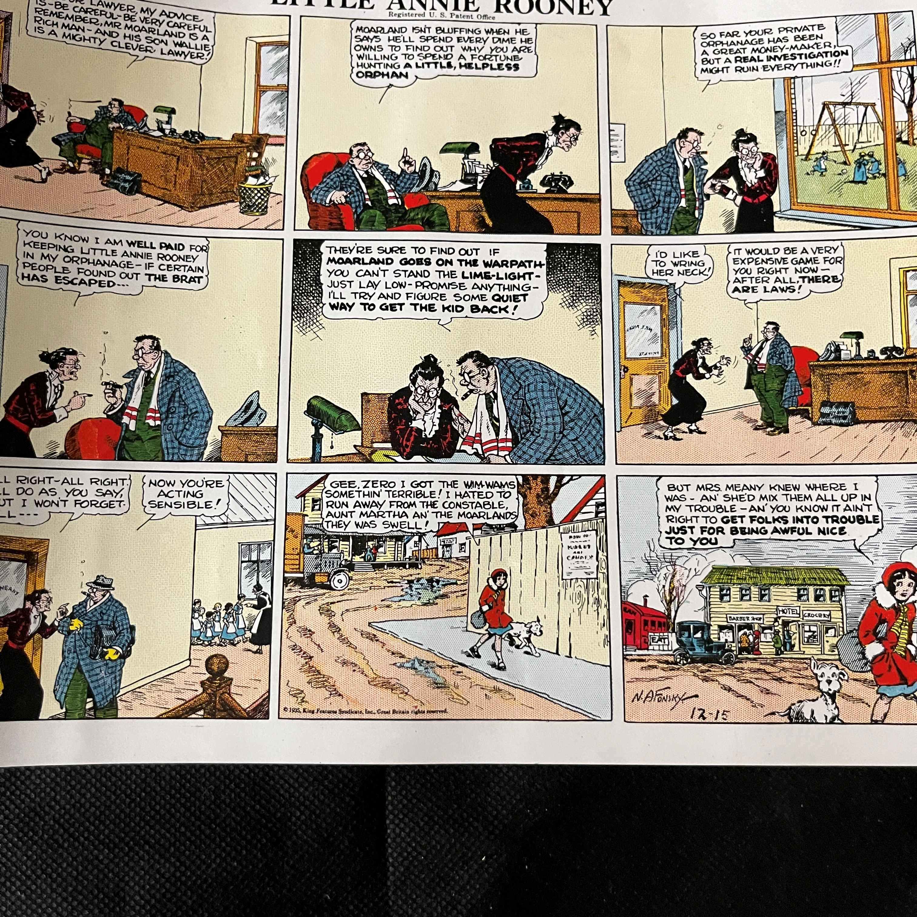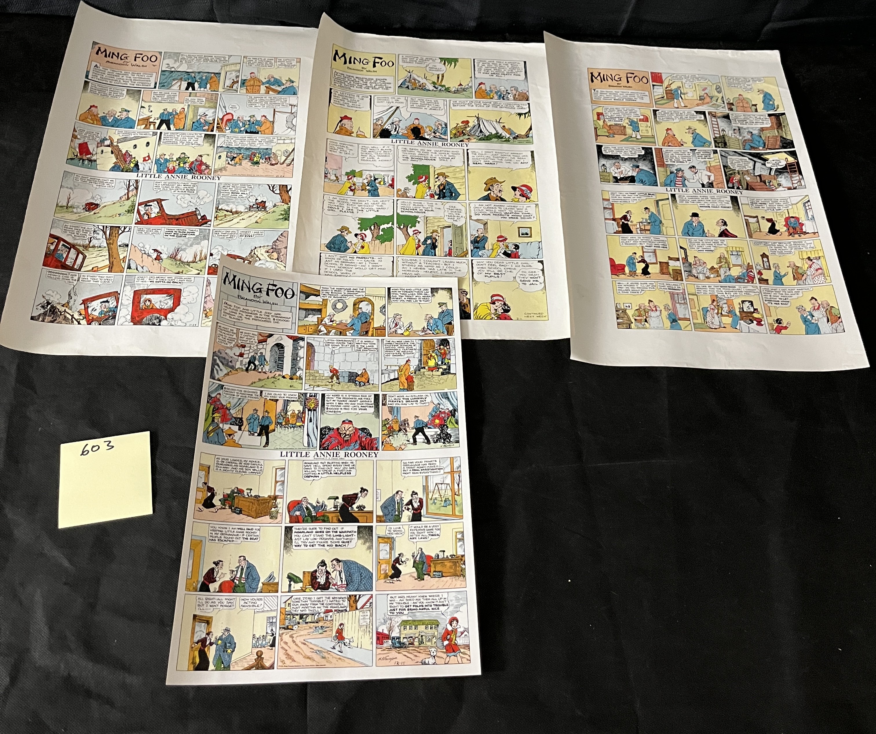 A group of four vintage American comic strip proofs, featuring the popular comic strip ‘Little Annie Rooney’ with subsidiary ‘Ming Foo’ strips. Each proof is printed on thin, fax-like paper in the1930s. Copyright information visible on the strips states ‘© 1935, King Features Syndicate, Inc., Great Britain rights reserved.’ Specific strips are marked with dates such as ’12-15,’ ’11-24,’ and ‘8-11,’ indicating publication in late 1935. One strip bears a possible artist signature, ‘N. NACOR.’ Printed on paper.