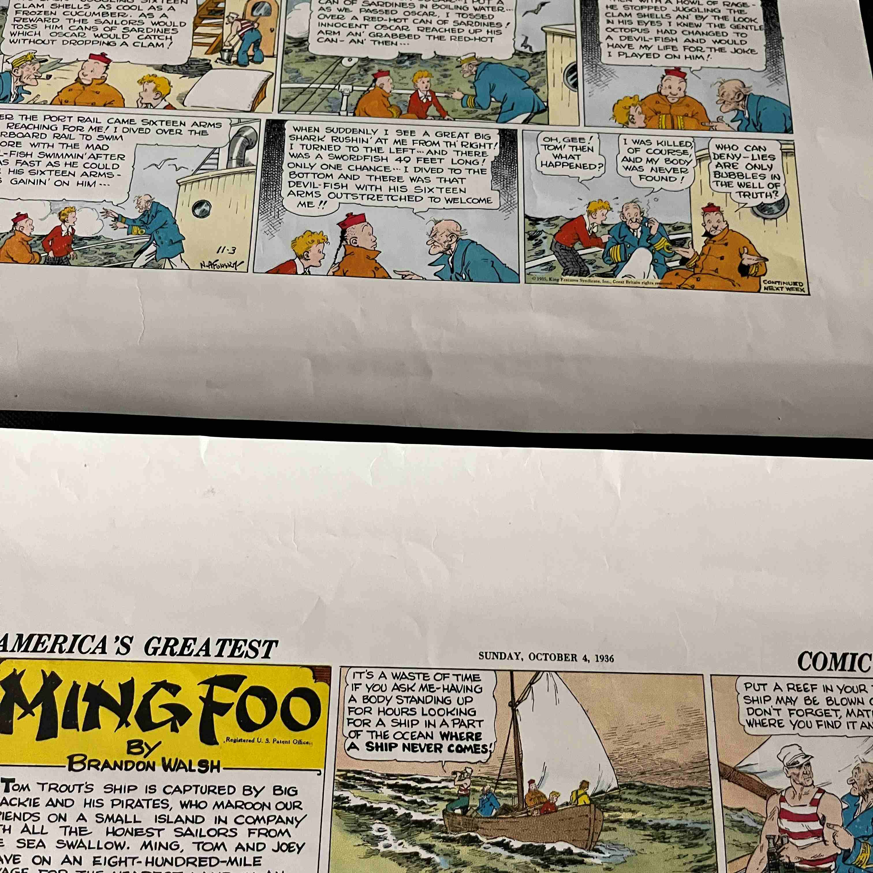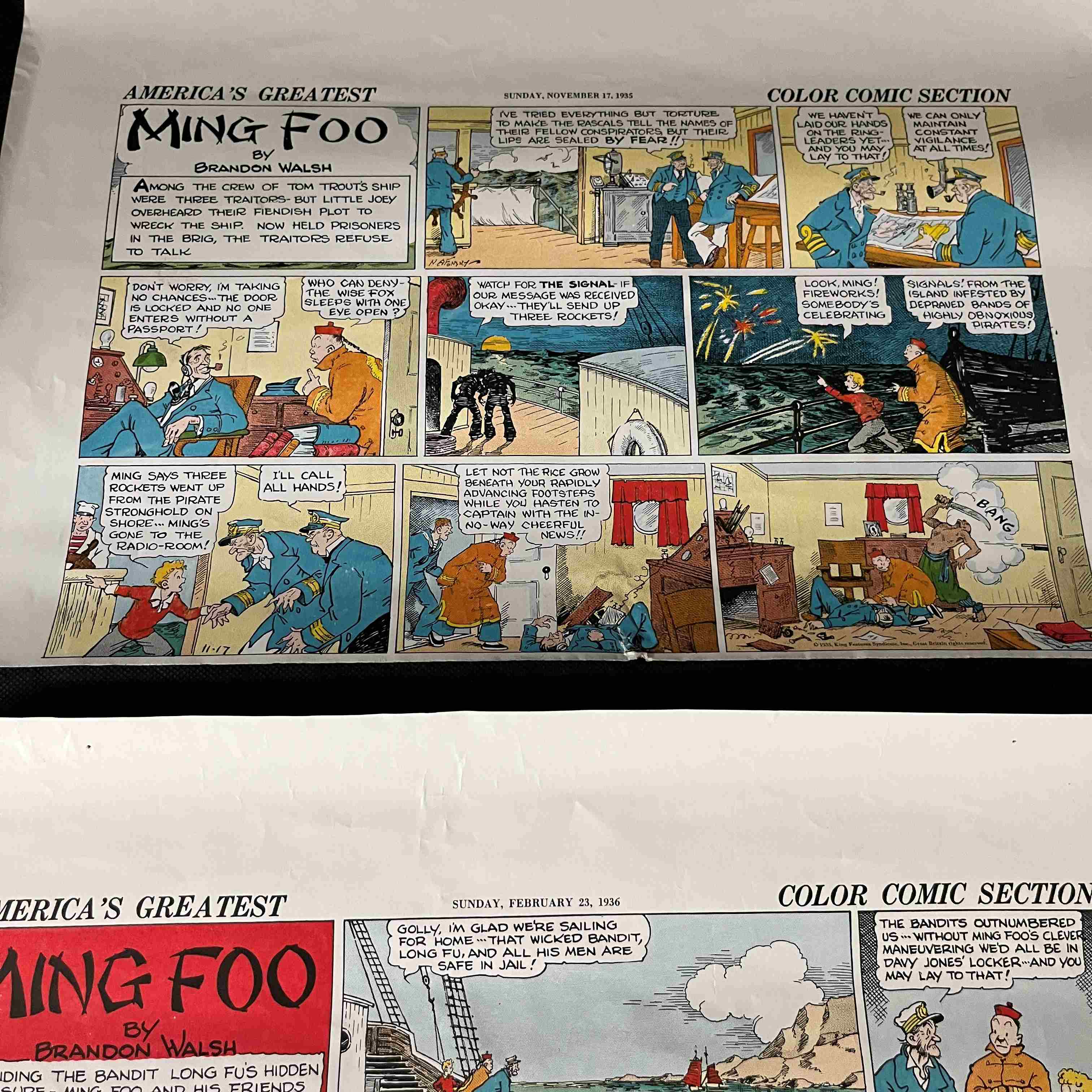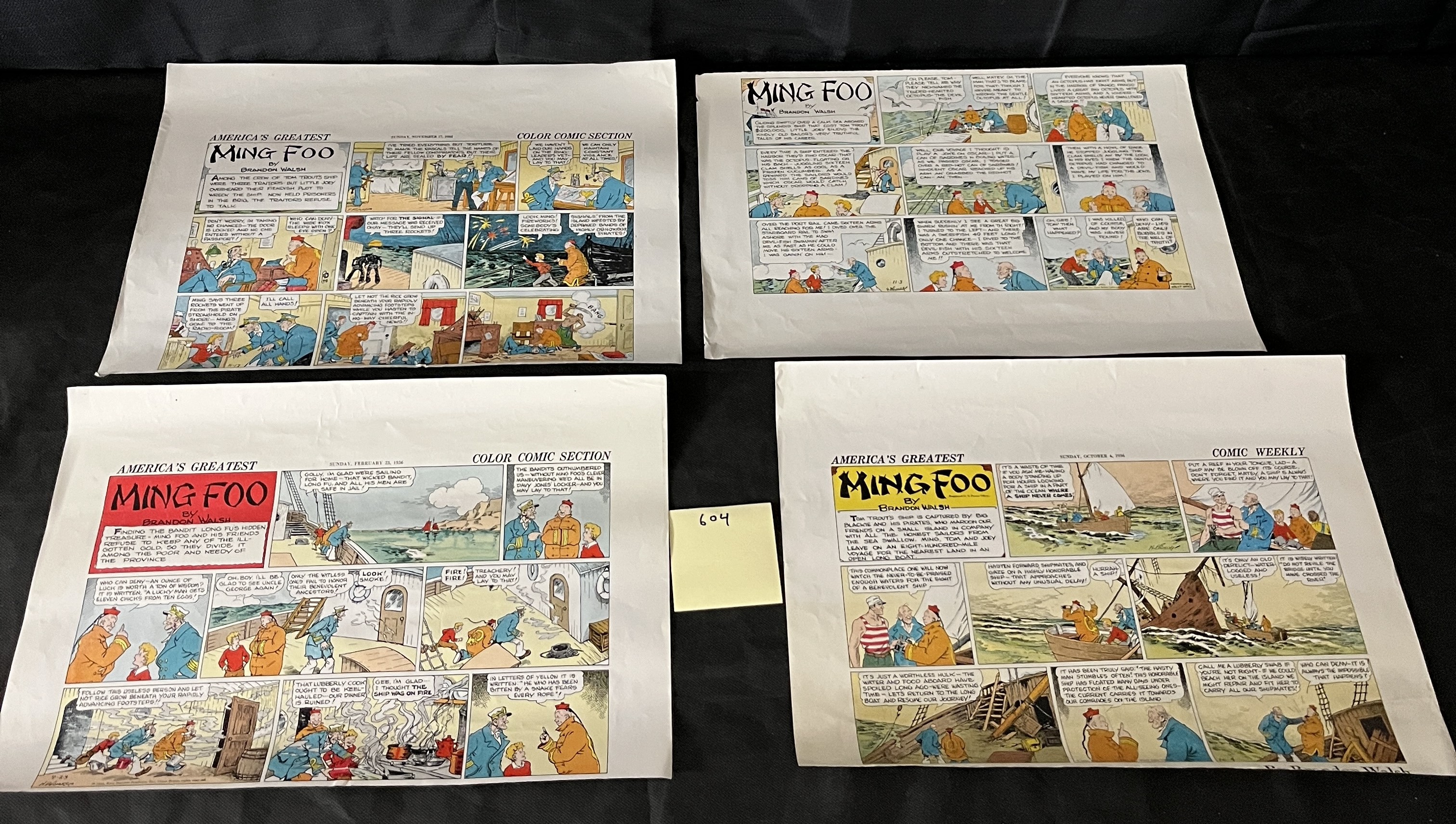 Four vintage American newspaper comic strip proofs or tearsheets, each featuring “AMERICA’S GREATEST MING FOO” by Brandon Walsh. These color comic sections are dated SUNDAY, NOVEMBER 17, 1935, SUNDAY, FEBRUARY 23, 1936, and SUNDAY, OCTOBER 4, 1936, placing them firmly in the mid-1930s. Printed on aged, off-white paper, each strip comprises multiple panels with hand-drawn illustrations and English dialogue. Each bears copyright notices for King Features Syndicate and the phrase “CONTINUED NEXT WEEK.” A small yellow sticky note with the marking “L04” is affixed to one sheet.