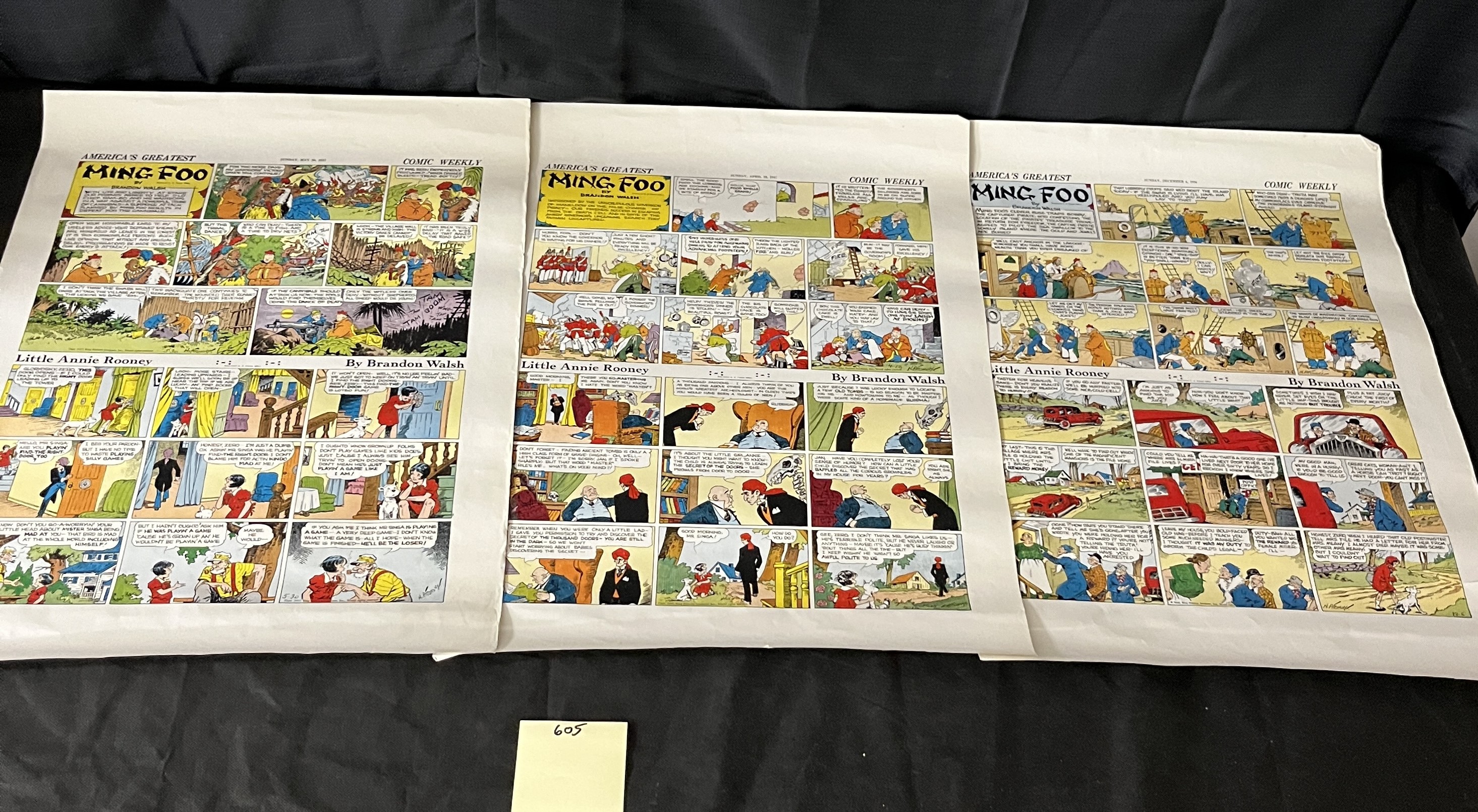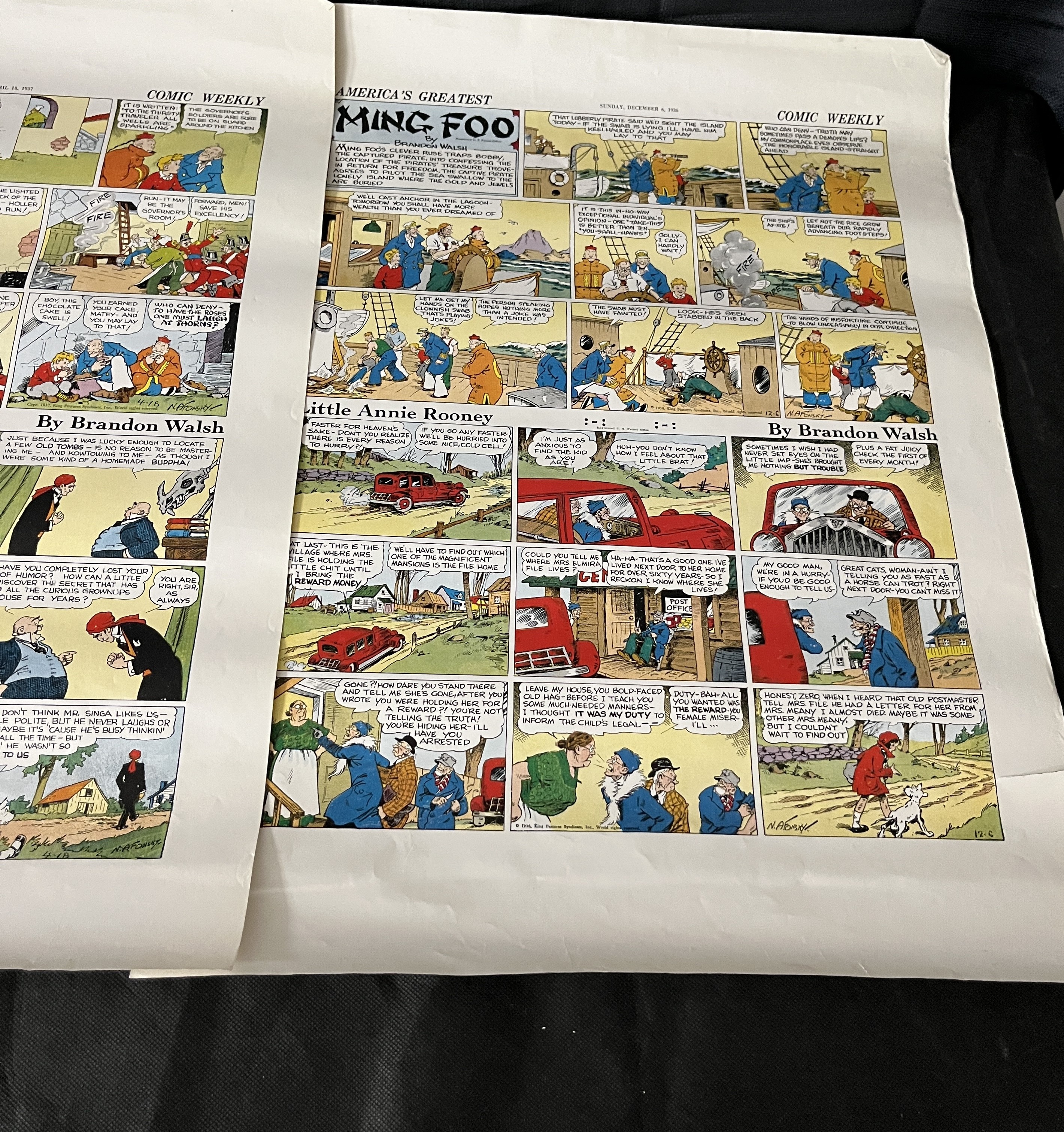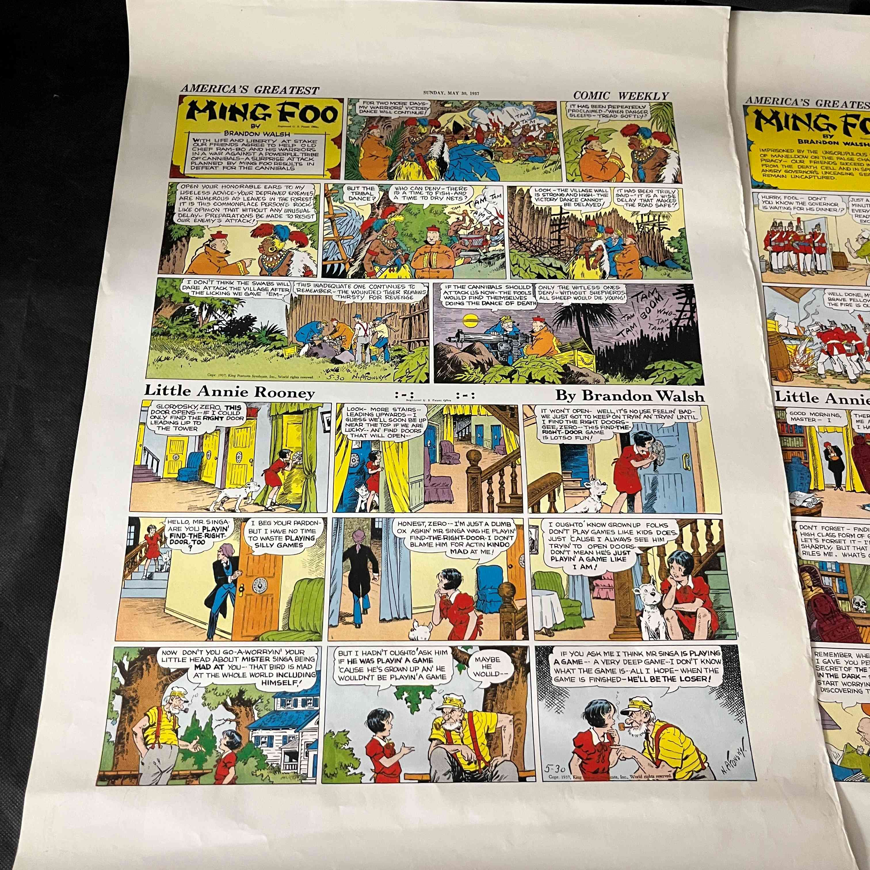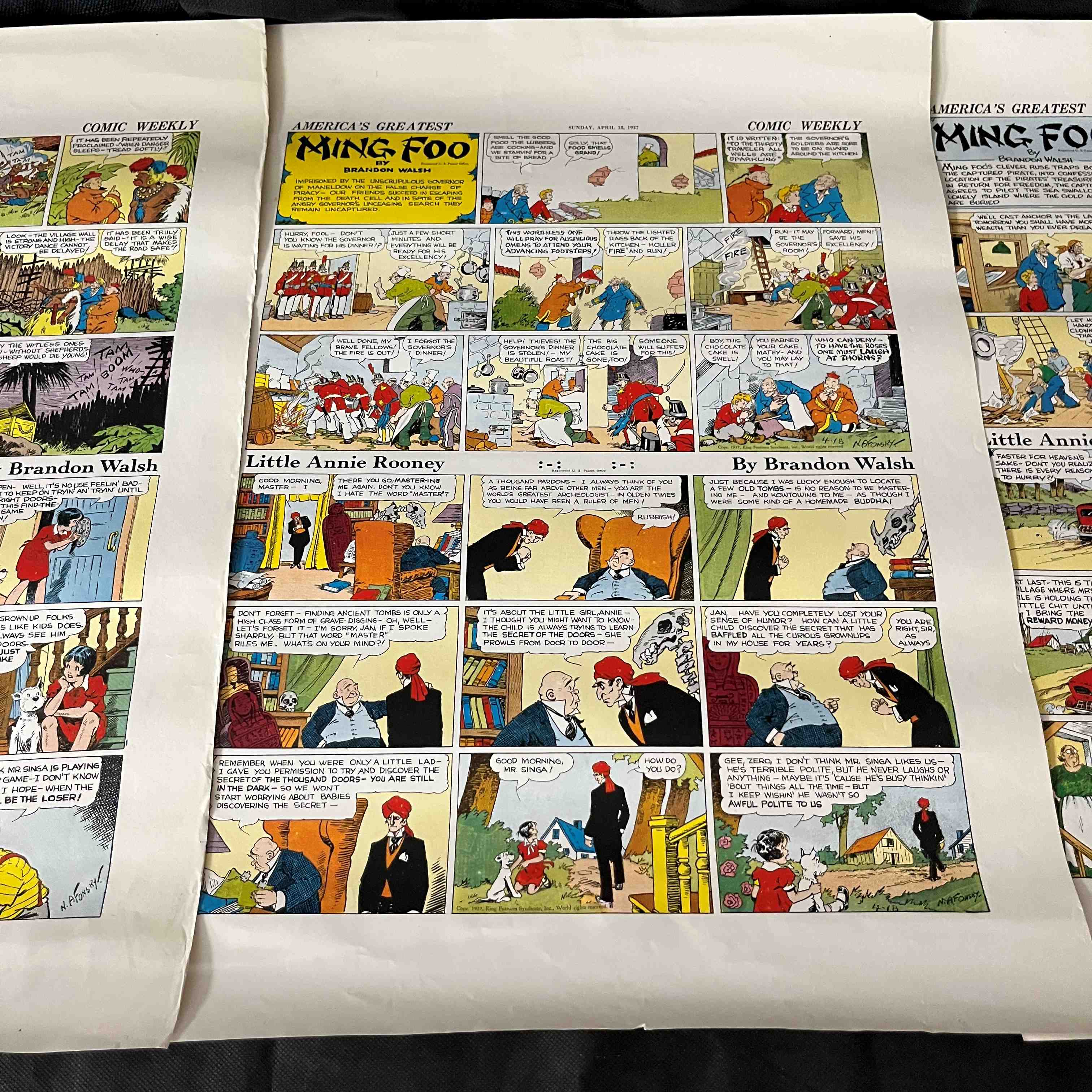 Three 1937 King Features Syndicate 'Comic Weekly' Sunday Comic Proofs featuring 'America's Greatest Ming Foo' and 'Little Annie Rooney' by Brandon Walsh