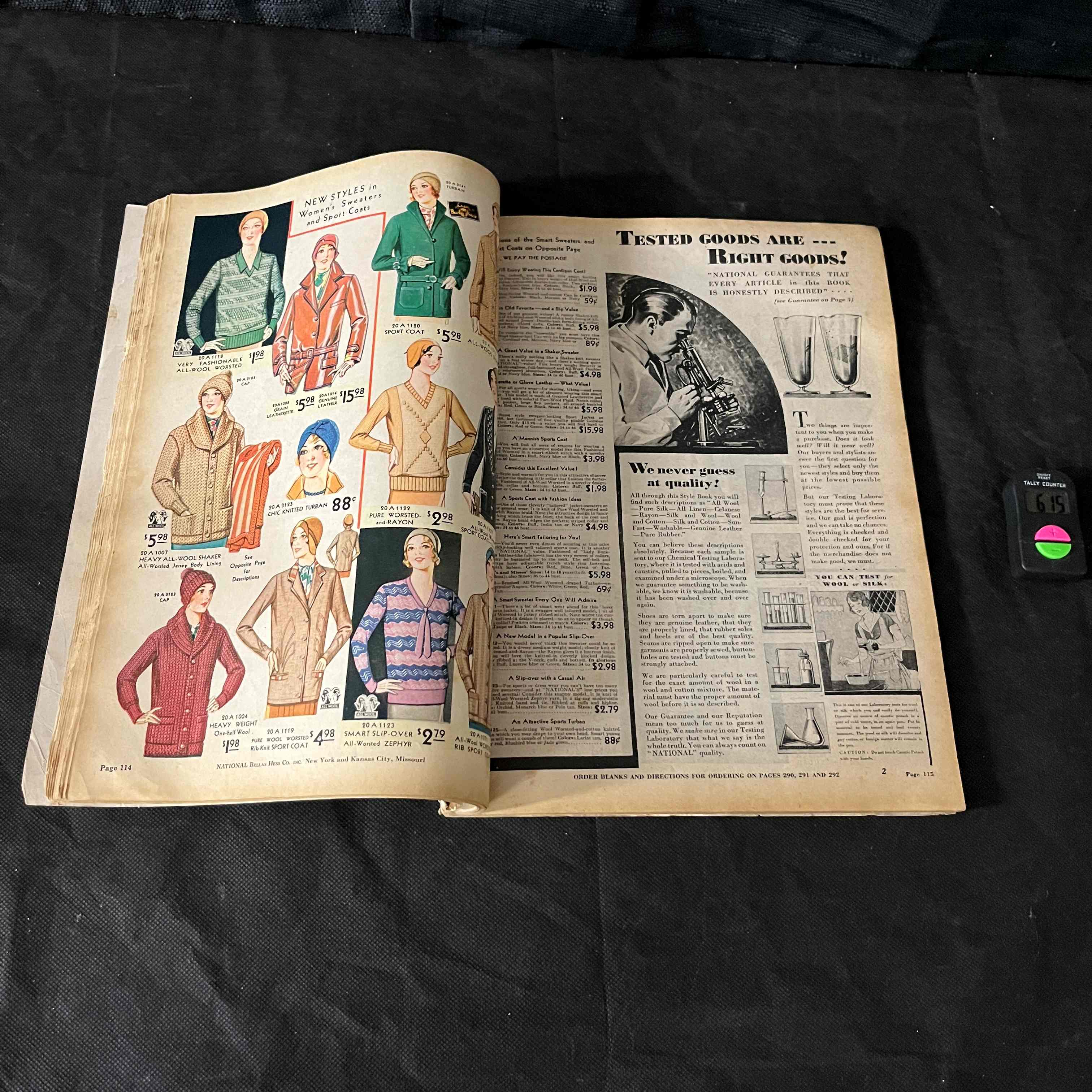 A National Bellas Hess Co. Inc. Fall and Winter 1930-1931 mail-order fashion catalog, printed on paper. The catalog was issued from locations in New York and Kansas City. The cover features Art Deco period illustrations of two women modeling fashionable attire, with visible text including “ORK’S LATEST FASHIONS”, “WE PAY ALL POSTAGE”, and prices such as “$23.75” and “$11.98”. Internal pages showcase various clothing and footwear, including “MEN’S HI-CUT BOOTS,” “WOMEN’S SMARTLY STYLED OXFORDS,” and “NEW STYLES in Women’s Sweaters and Sport Coats.” A section titled “TESTED GOODS ARE RIGHT GOODS!” is also present, with price points ranging from $1.98 to $7.49. Similar catalogs from this period are commonly referred to as ‘Style Books’ in the market.