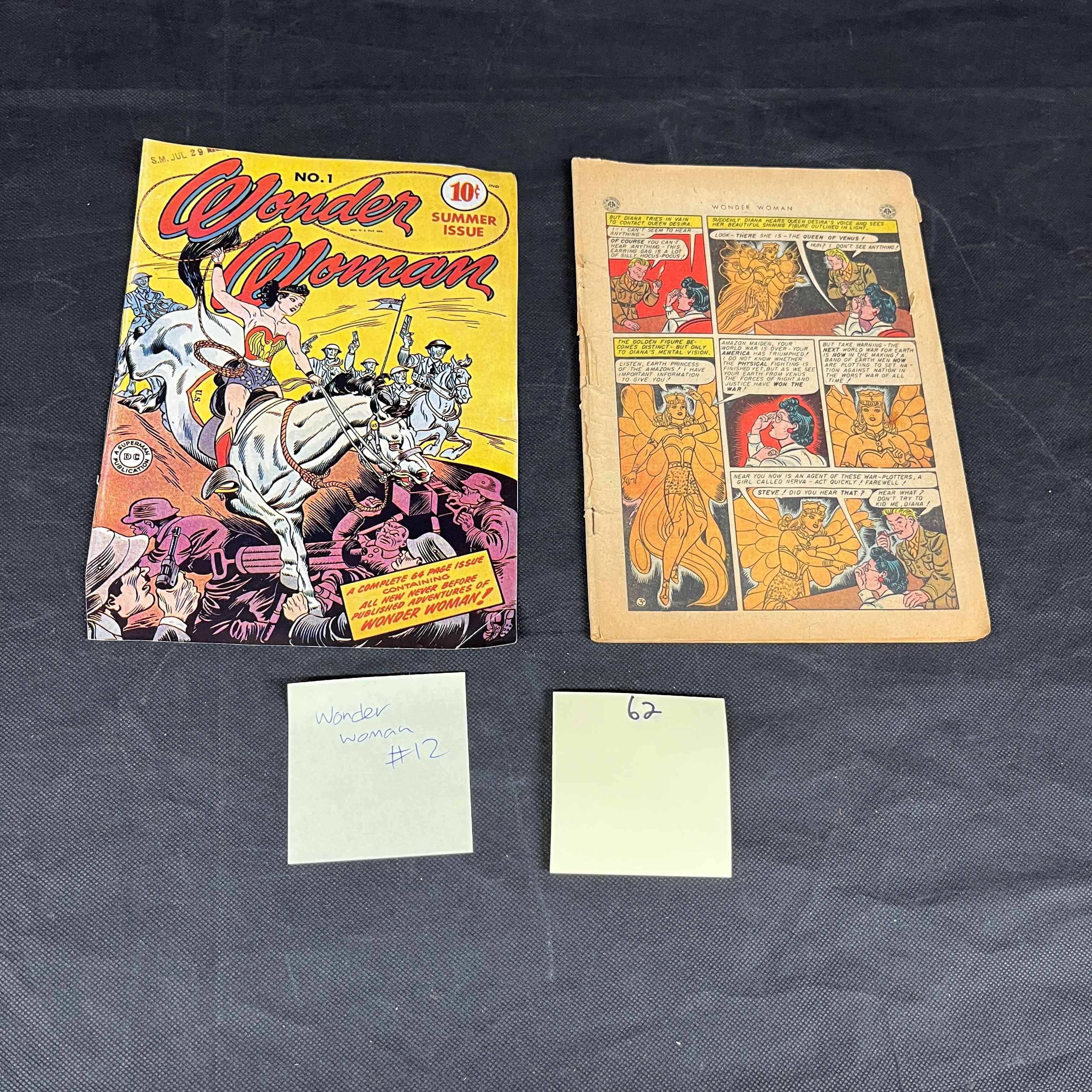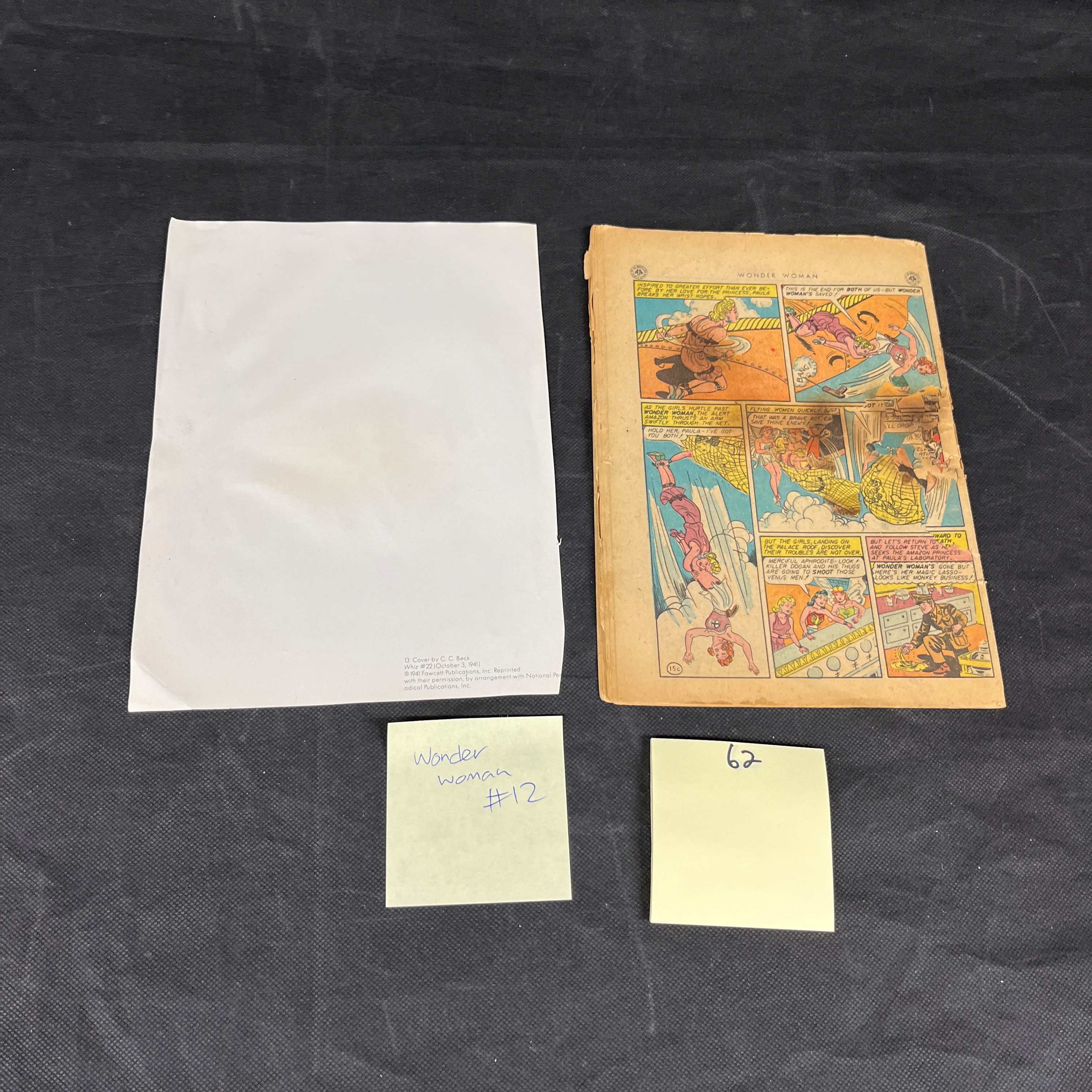 Reprint Cover of issue #1  – A Golden Age era comic book, *Wonder Woman (1942 1st Series DC) #12, October 1944*.  featuring Wonder Woman riding a winged white horse amidst soldiers and a crowd, along with a visible DC Comics logo. The back cover contains copyright information confirming “Vol 1, No. 12, October 1944” from National Periodical Publications, Inc. The interior pages feature sequential comic panels with English text and speech bubbles. A small handwritten notation, “EM 20C 38,” is visible on the upper left corner of the front cover. Accompanying the comic are two yellow sticky notes, one marked “Wonder woman #12” and the other “62,” along with a plain white sheet of paper.