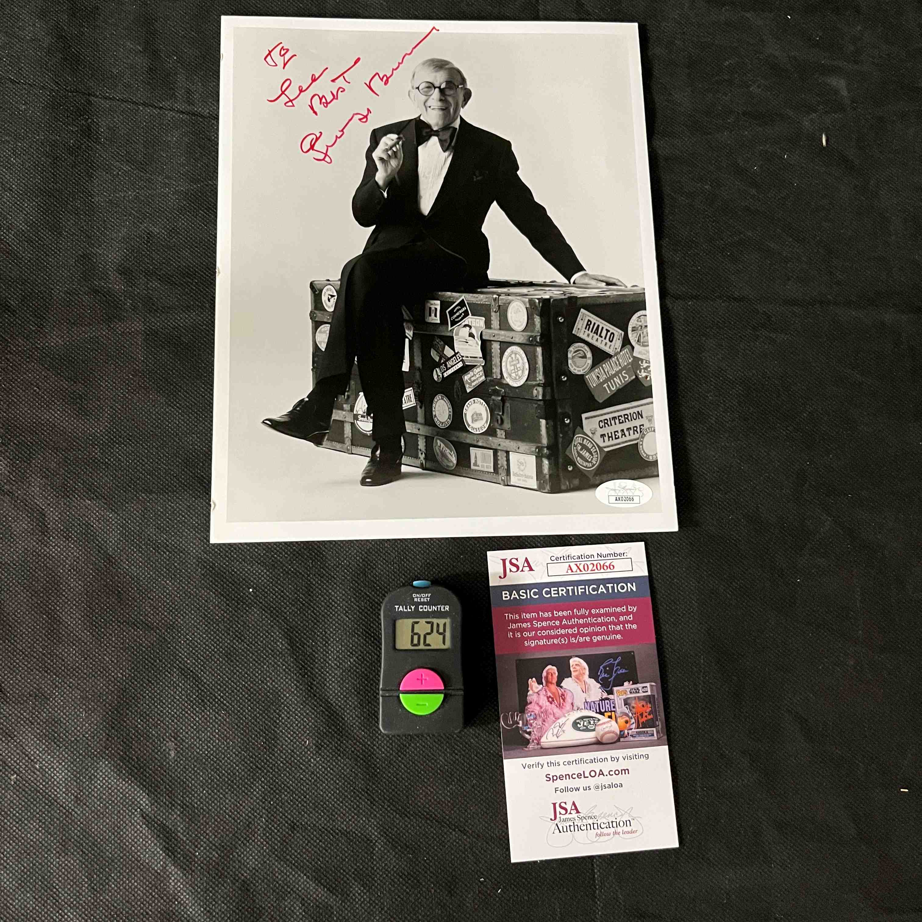 A black and white photographic print featuring the legendary comedian and actor George Burns. The image depicts a smiling elderly man, identified as Burns, dressed in a tuxedo and his signature round spectacles, seated playfully atop a stack of vintage travel trunks. The trunks are adorned with various destination stickers, including “Rialto Theatre,” “Tunis,” “Criterion Theatre,” “Los Angeles,” and “Grand Hotel Glasgow.” The photograph bears a dedication and signature in red ink, “To Best George Burns.” Accompanying the photograph is a James Spence Authentication (JSA) holographic sticker with certification number “AX02066” affixed to the print, and a corresponding paper “BASIC CERTIFICATION” from JSA confirming the genuineness of the signature.
