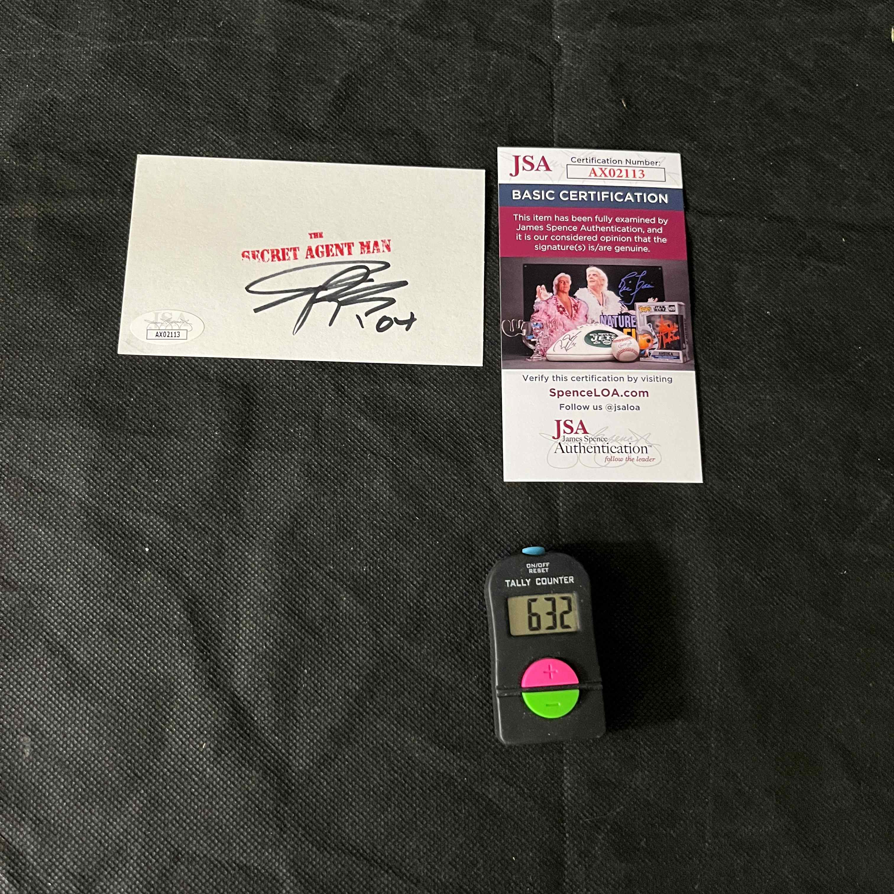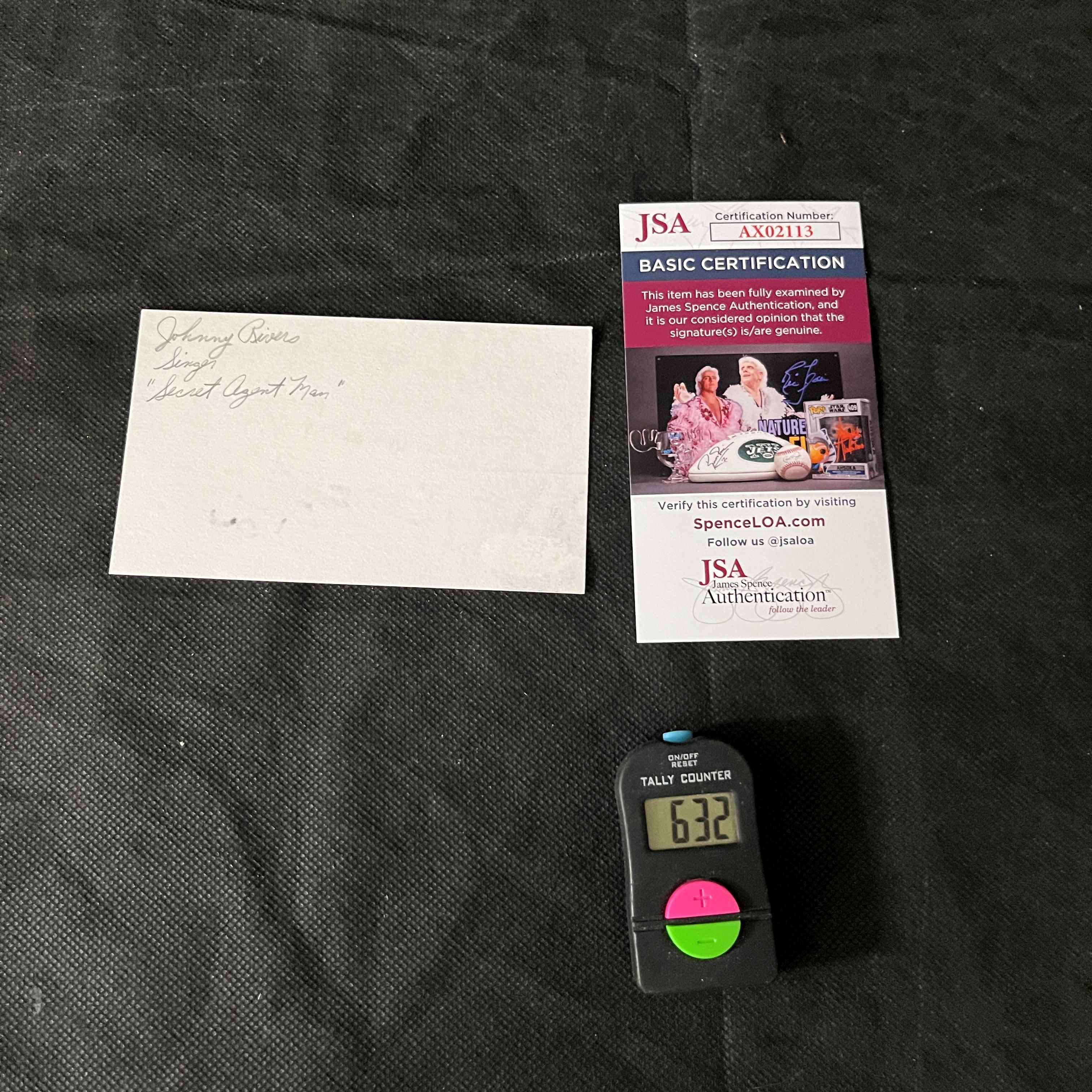 A signed autograph by musician Johnny Rivers, featured on a rectangular piece of white paper. The front displays a stylized black ink signature positioned above the printed phrase ‘THE SECRET AGENT MAN’. The reverse side bears additional handwritten text in blue ink: ‘Johnny Rivers Sings “Secret Agent Man”‘. A James Spence Authentication (JSA) sticker with certification number ‘AX02113’ is affixed to the lower left corner of the paper. This item is accompanied by a JSA Basic Certification letter, printed on white paper, which displays the matching certification number ‘AX02113’ and states the signature has been deemed genuine. All text on the certificate is in English.