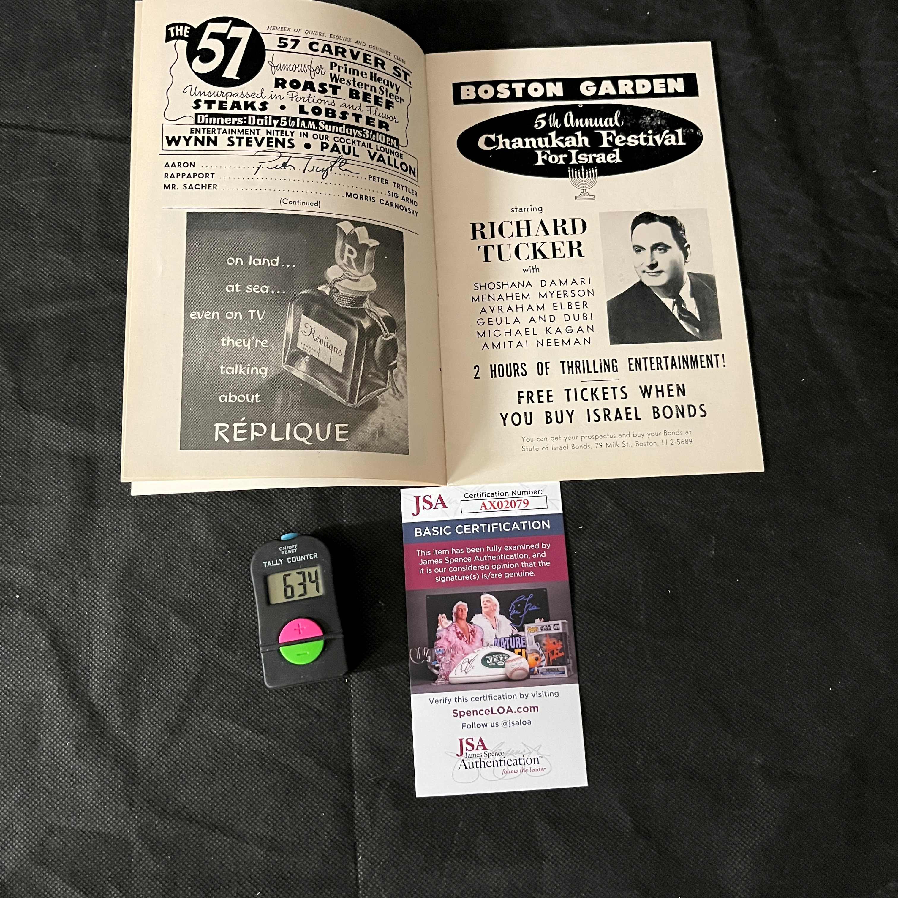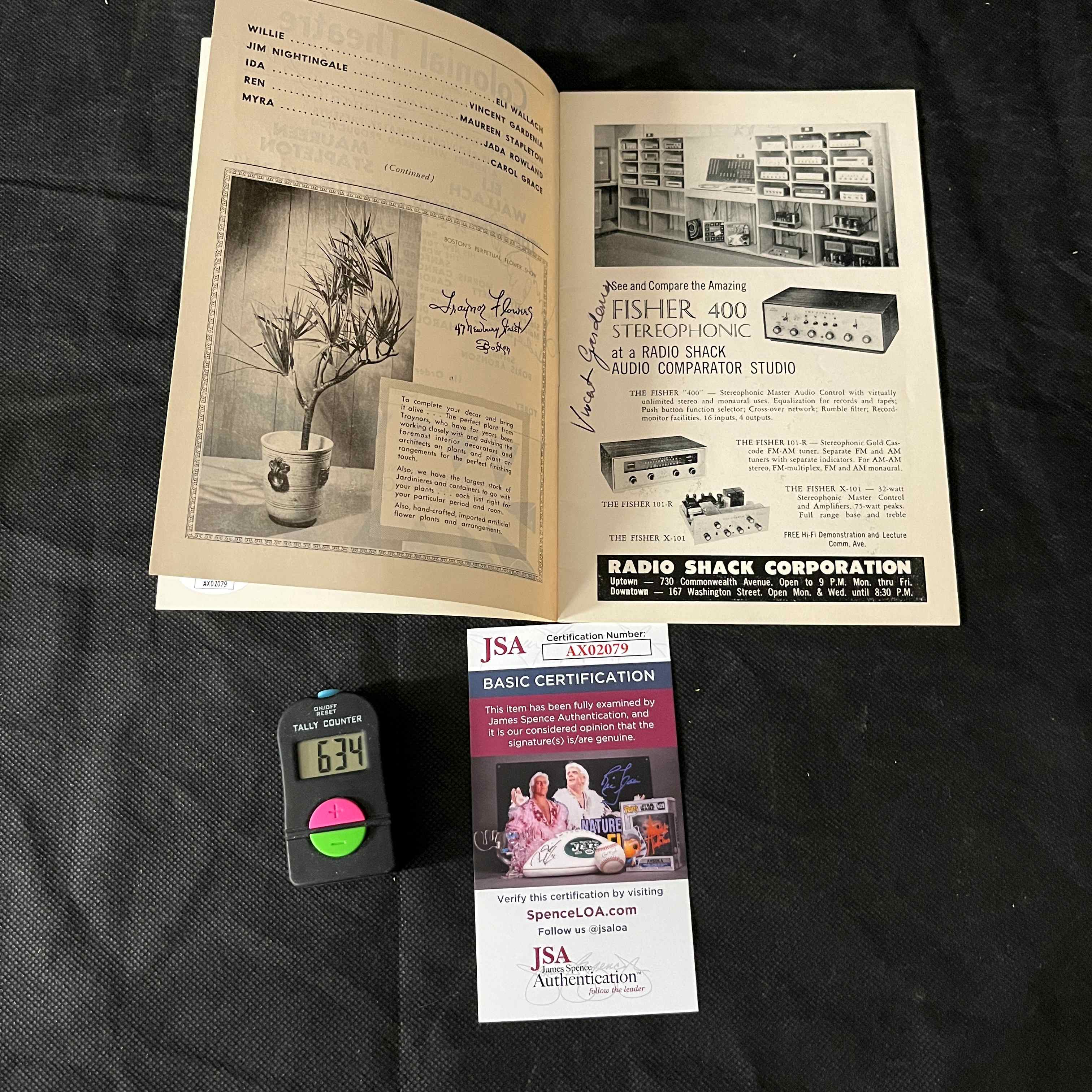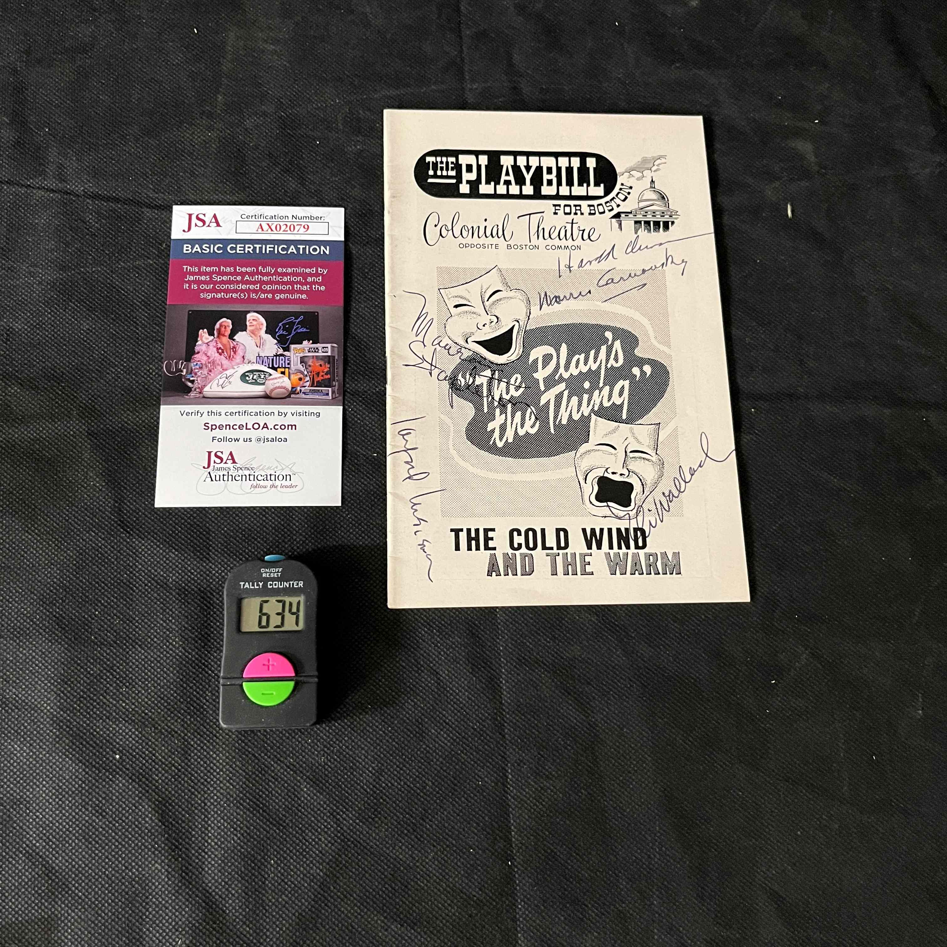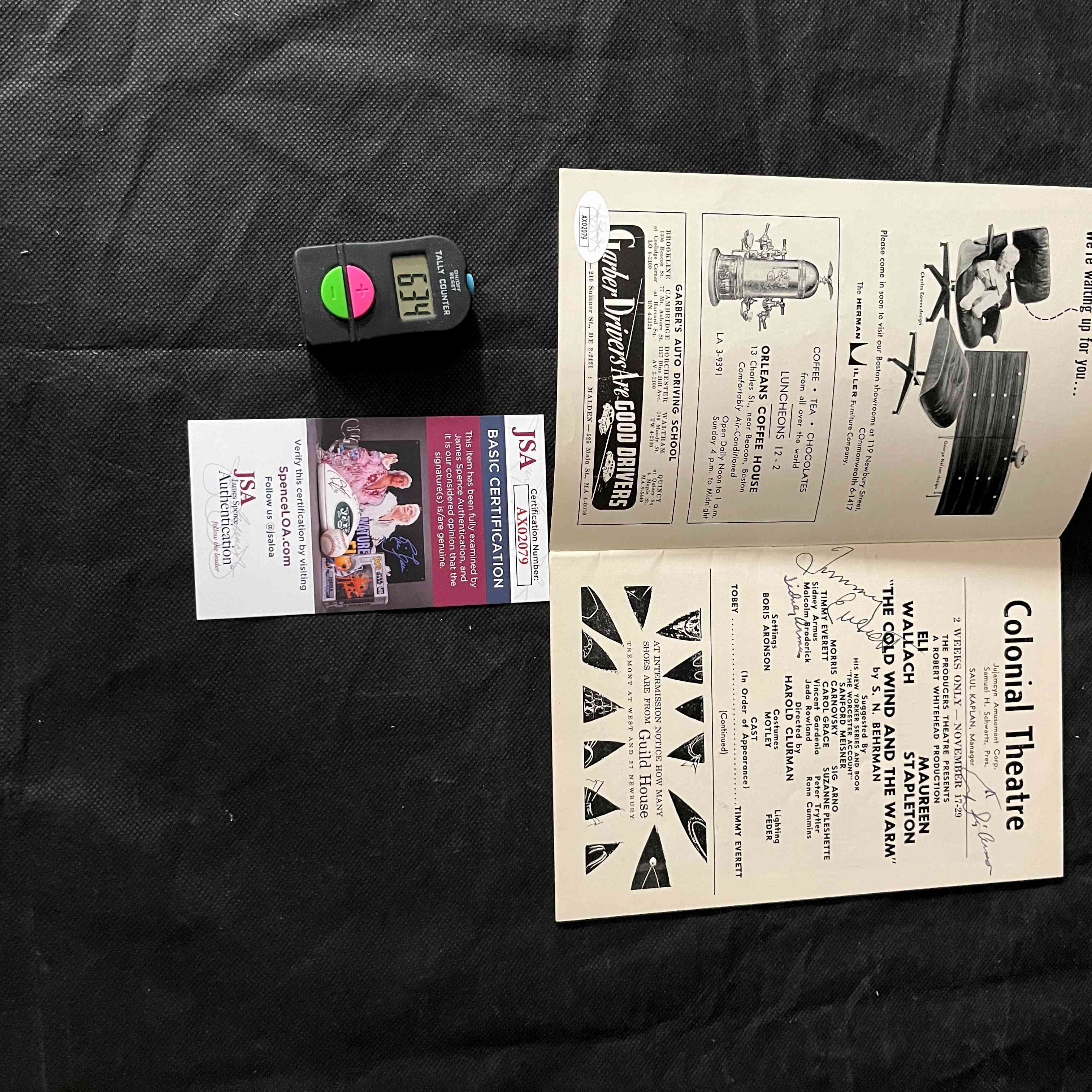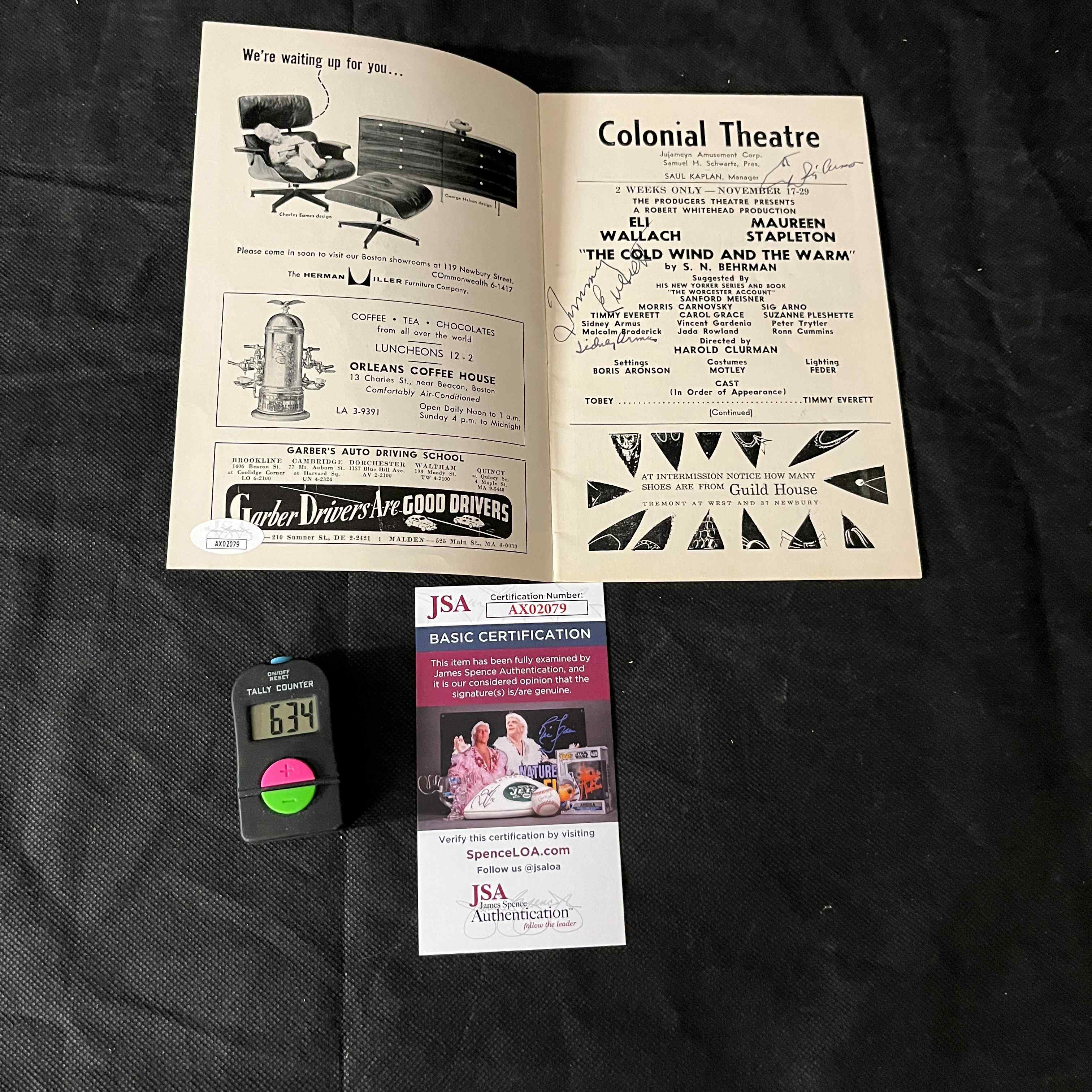 A vintage, mid-20th century “The Playbill” theatre program for the Colonial Theatre, Boston. The program is titled “The Play’s The Thing” and features the production “The Cold Wind And The Warm,” starring Eli Wallach and Maureen Stapleton, dated November 17-29. The paper, staple-bound program displays numerous handwritten ink signatures on its cover and interior pages, notably one appearing to be “Eli Wallach.” The item is accompanied by a JSA (James Spence Authentication) “Basic Certification” card, number AX02079, which states the signature(s) are deemed genuine.